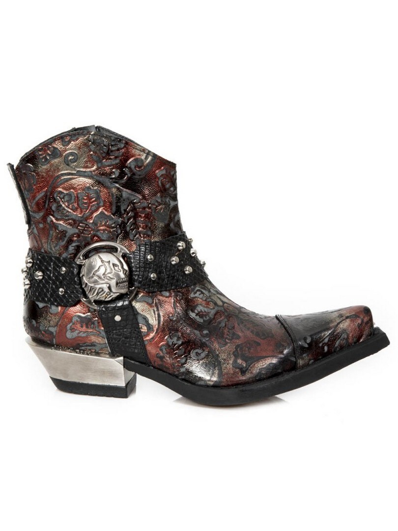 Kunnolliset kengät aidosta nahasta. Hiukan korkeampi varsi, matala pohja ja terävä kärki. Pääkalloaiheinen metallisolki ja punainen kuvio nahassa. Pohjassa on metallipinta, joka korostaa rockhenkistä lookkia.