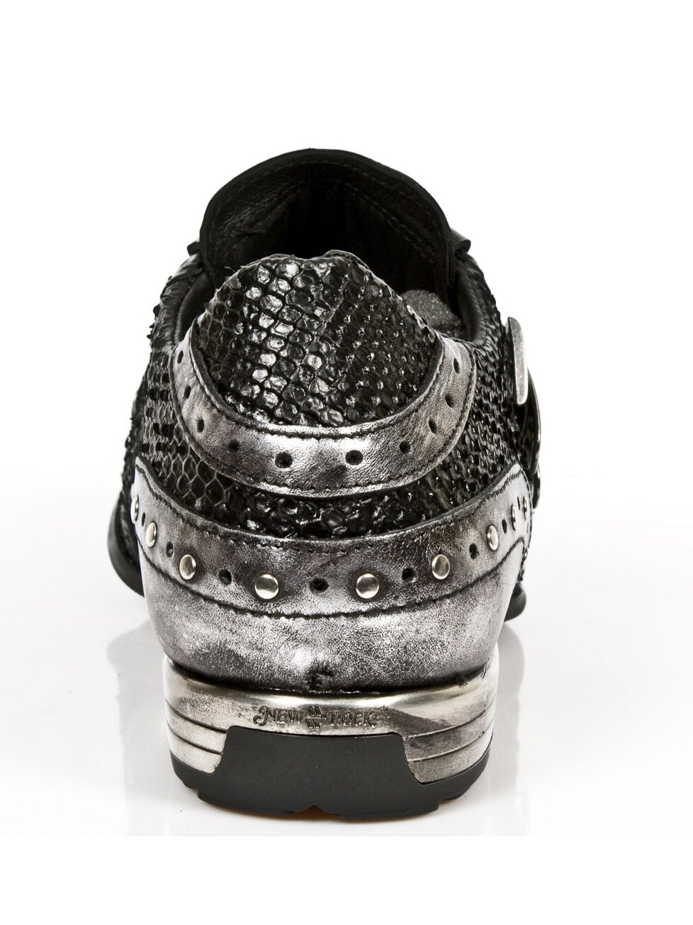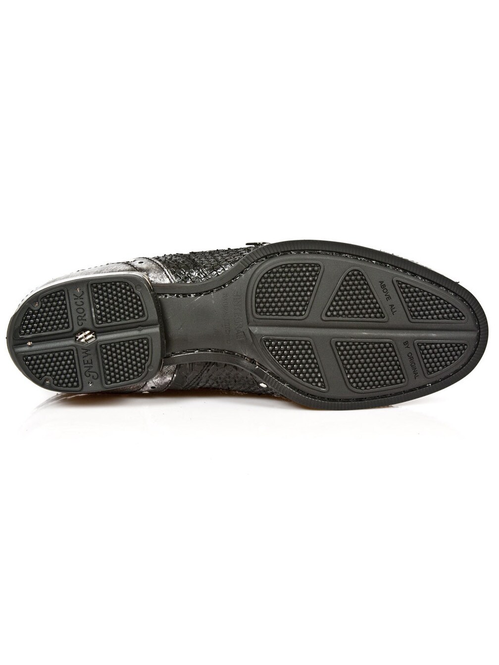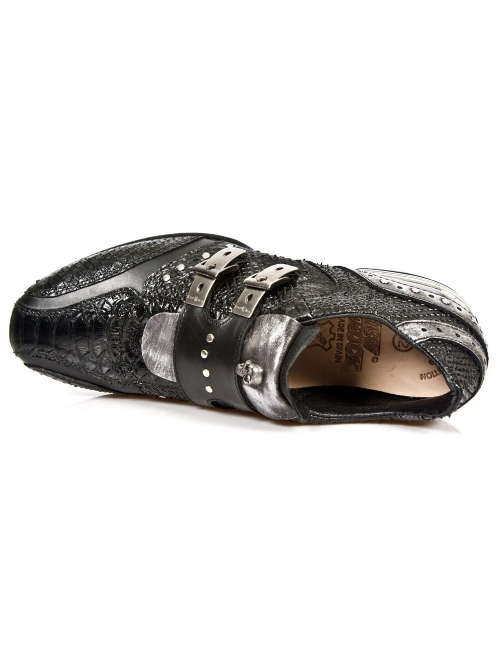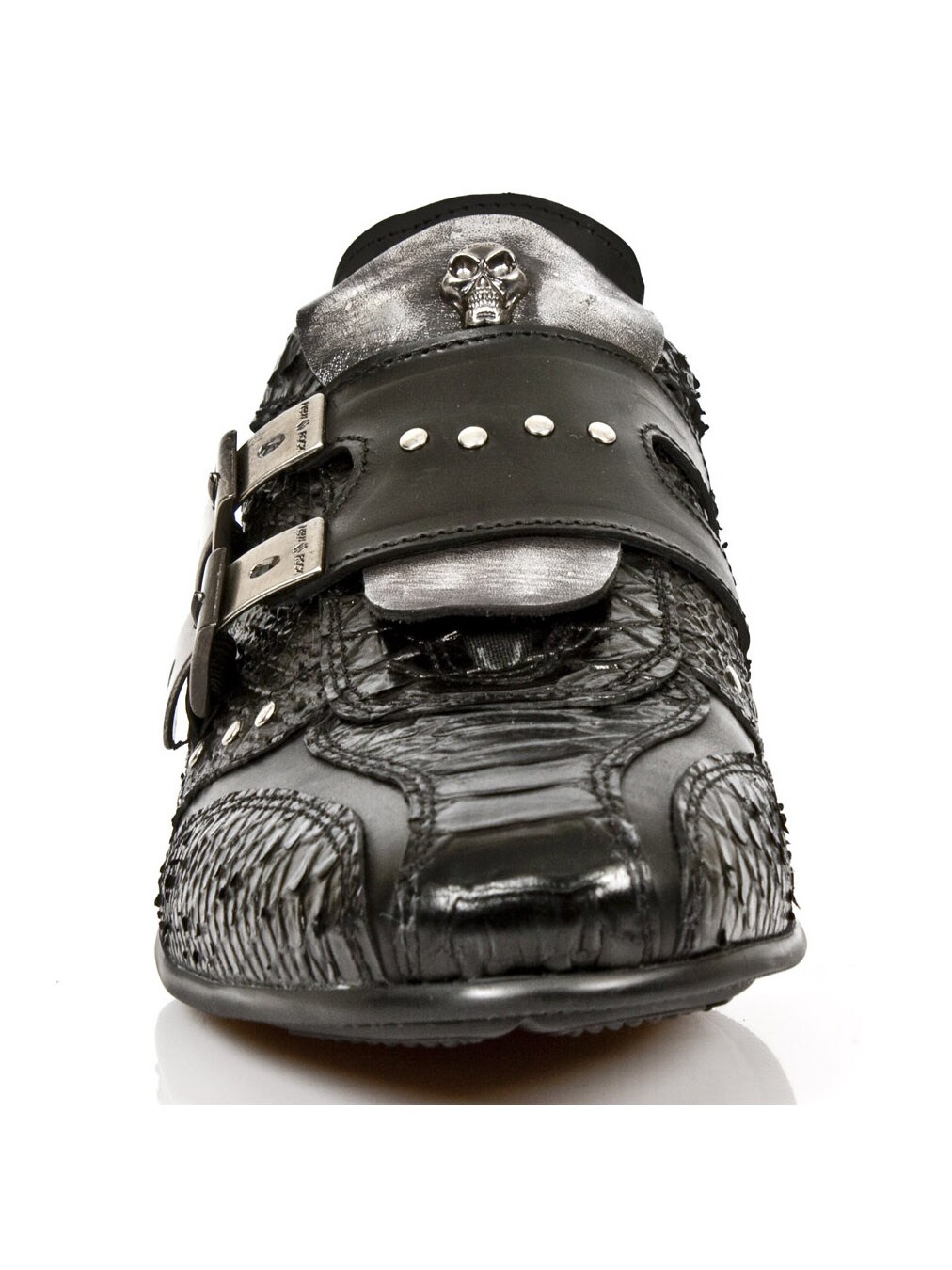 Mustat matalavartiset kengät aidosta kuvioidusta nahasta. Yksityiskohtina punaisia osioista, niittejä ja nahkaremmi kahdella metallisoljella. Pääkallomerkki kengän etupuolella. Näitä uniikkeja kenkiä on saatavilla vain rajoitettu erä!
