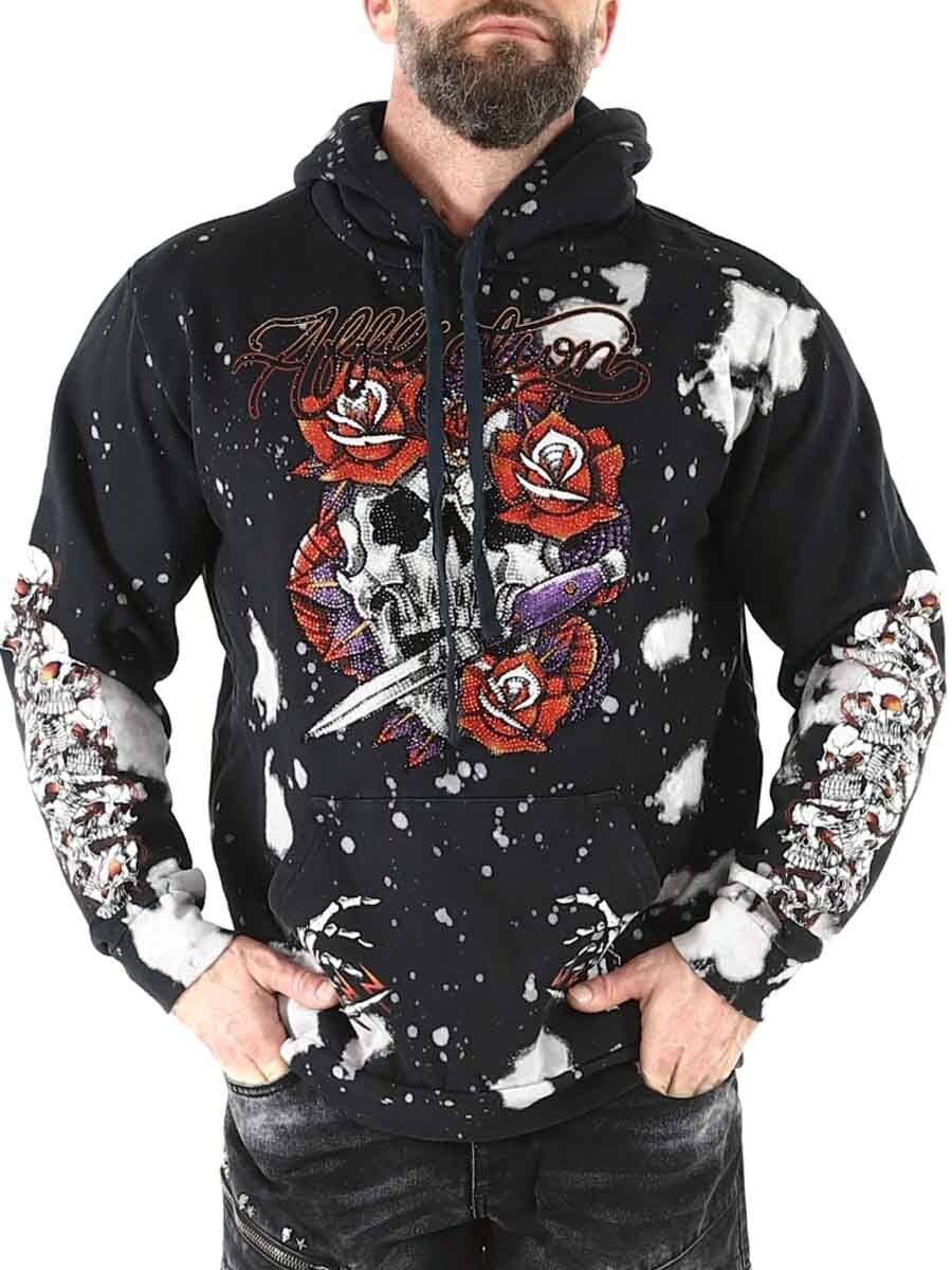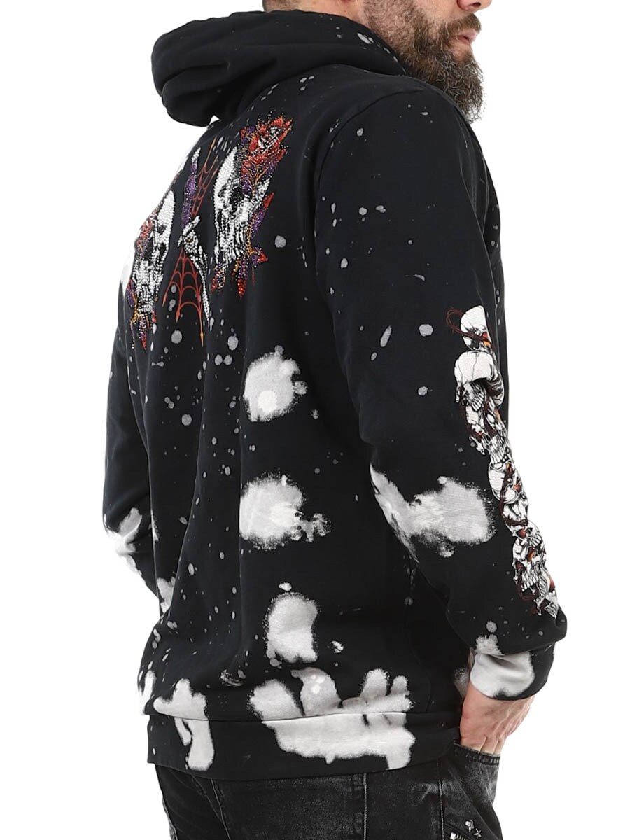 Huppari, jossa on vahva asenne ja yksityiskohtia, jotka todella erottuvat. Musta pohja on valkaistu roiskekuvioiseksi ja koristeltu suurilla graafisilla kuvioilla. Hupparissa on klassinen kengurutasku, säädettävä huppu ja ribatut hihansuut mukavuuden ja istuvuuden takaamiseksi. Täydellinen sinulle, joka haluat hupparin, jossa on kunnolla rock-henkeä ja näyttävyyttä.
