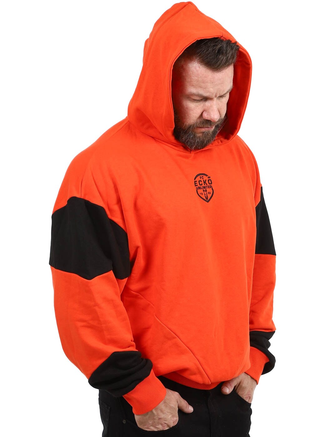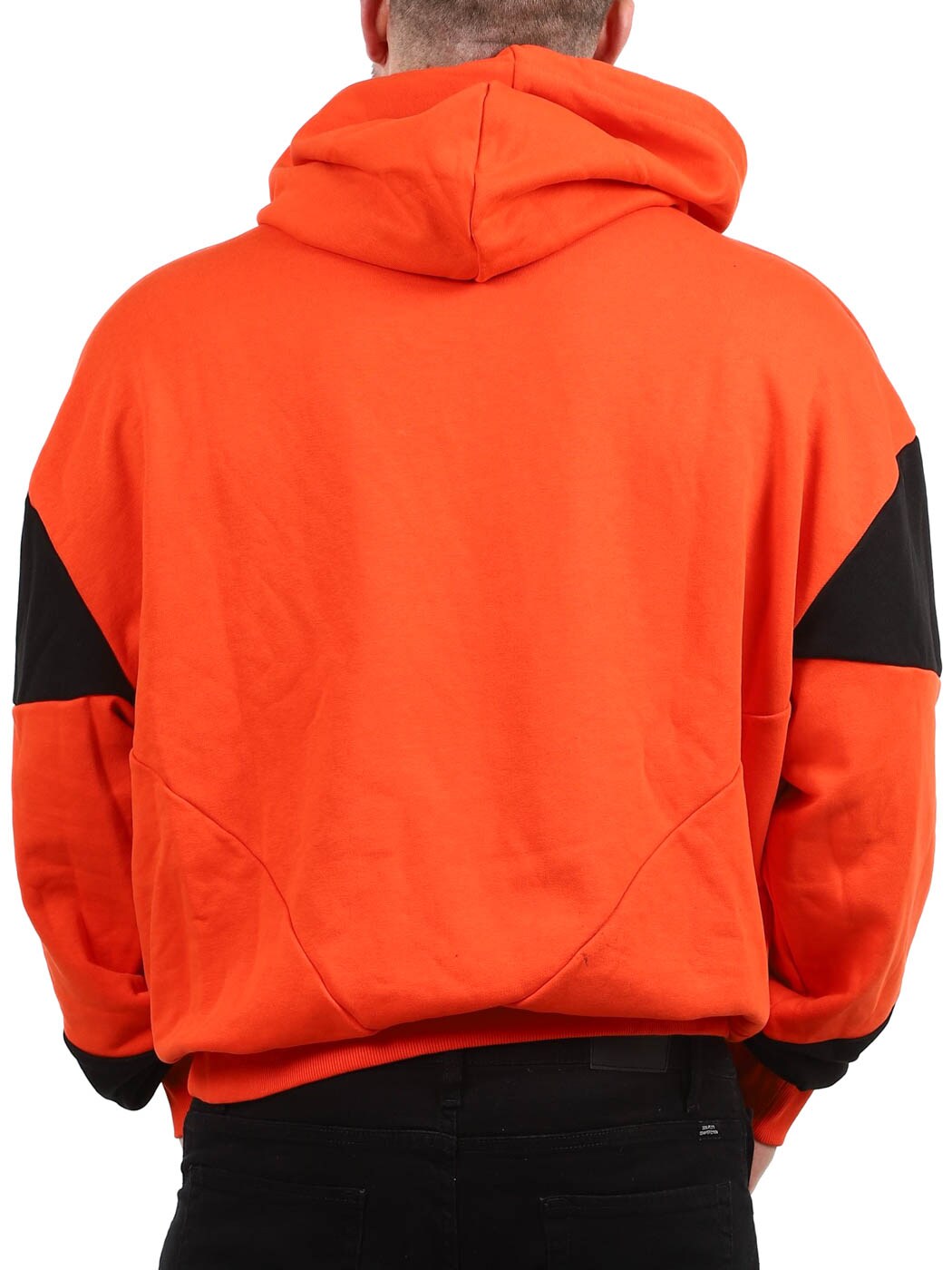 Oranssin sävyinen pusero, jonka hihojen mustat yksityiskohdat luovat tyylikkään ja huolitellun ilmeen. Puserossa on huppu, rinnuksessa ommeltu logo ja hihansuissa ribbineulosta.