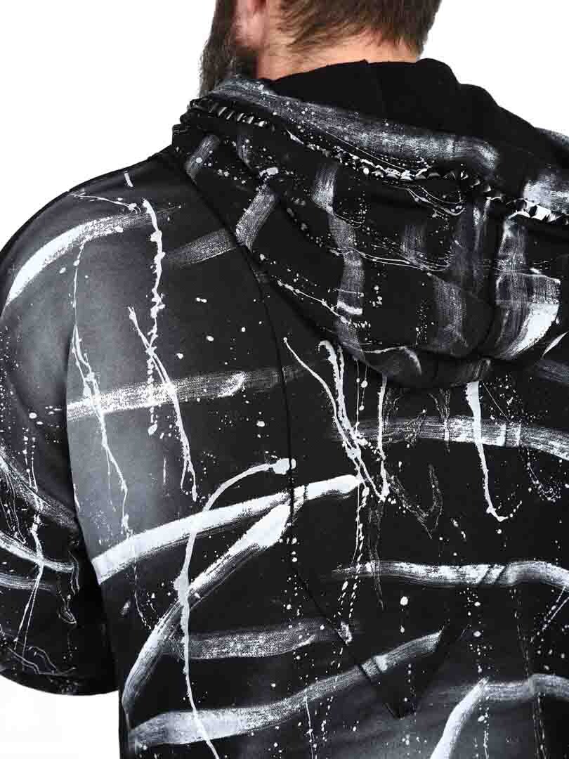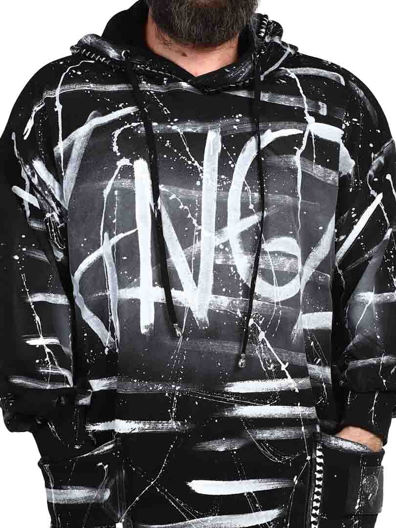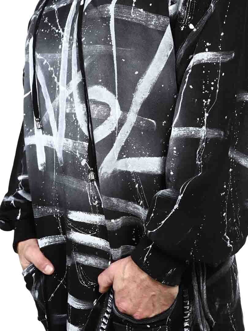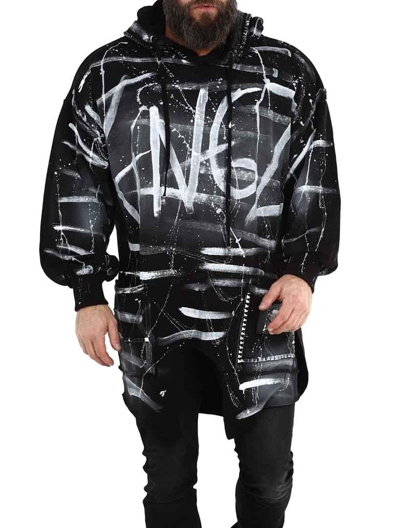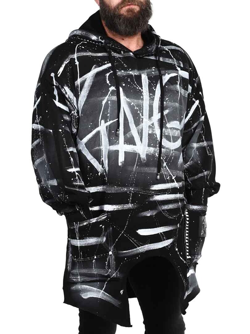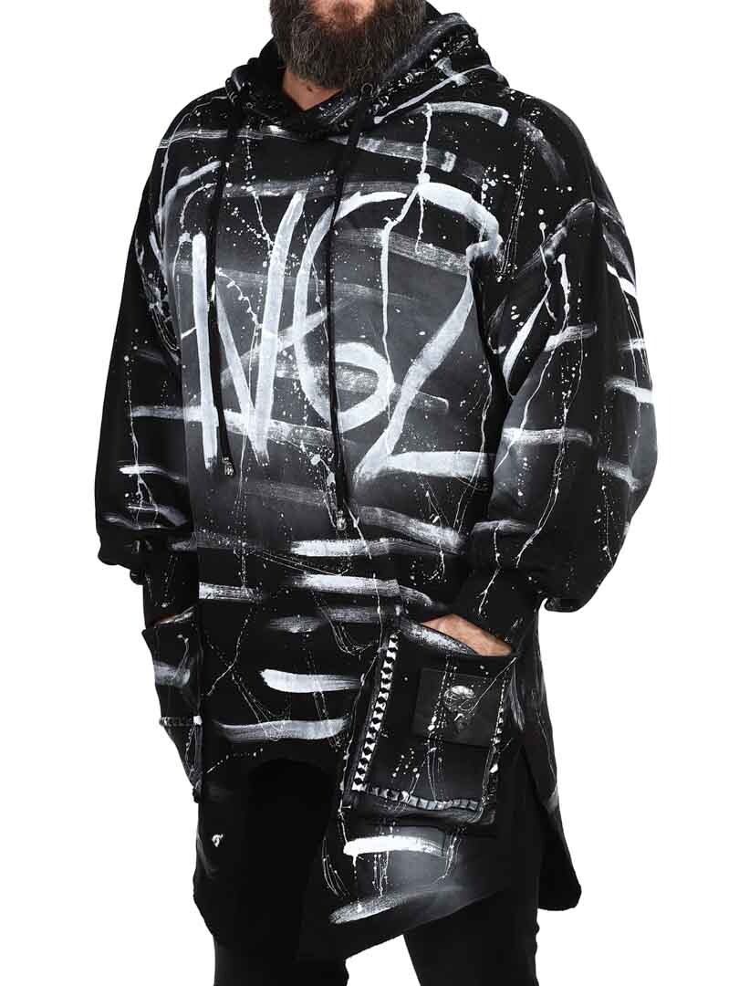 Pidempi huppari, jonka alaosassa on leikkaus. Yksityiskohtina mustia niittejä, merkkejä ja räätälöity logo takana. Kiristysnauhallinen huppu ja kaksi avointa etutaskua.