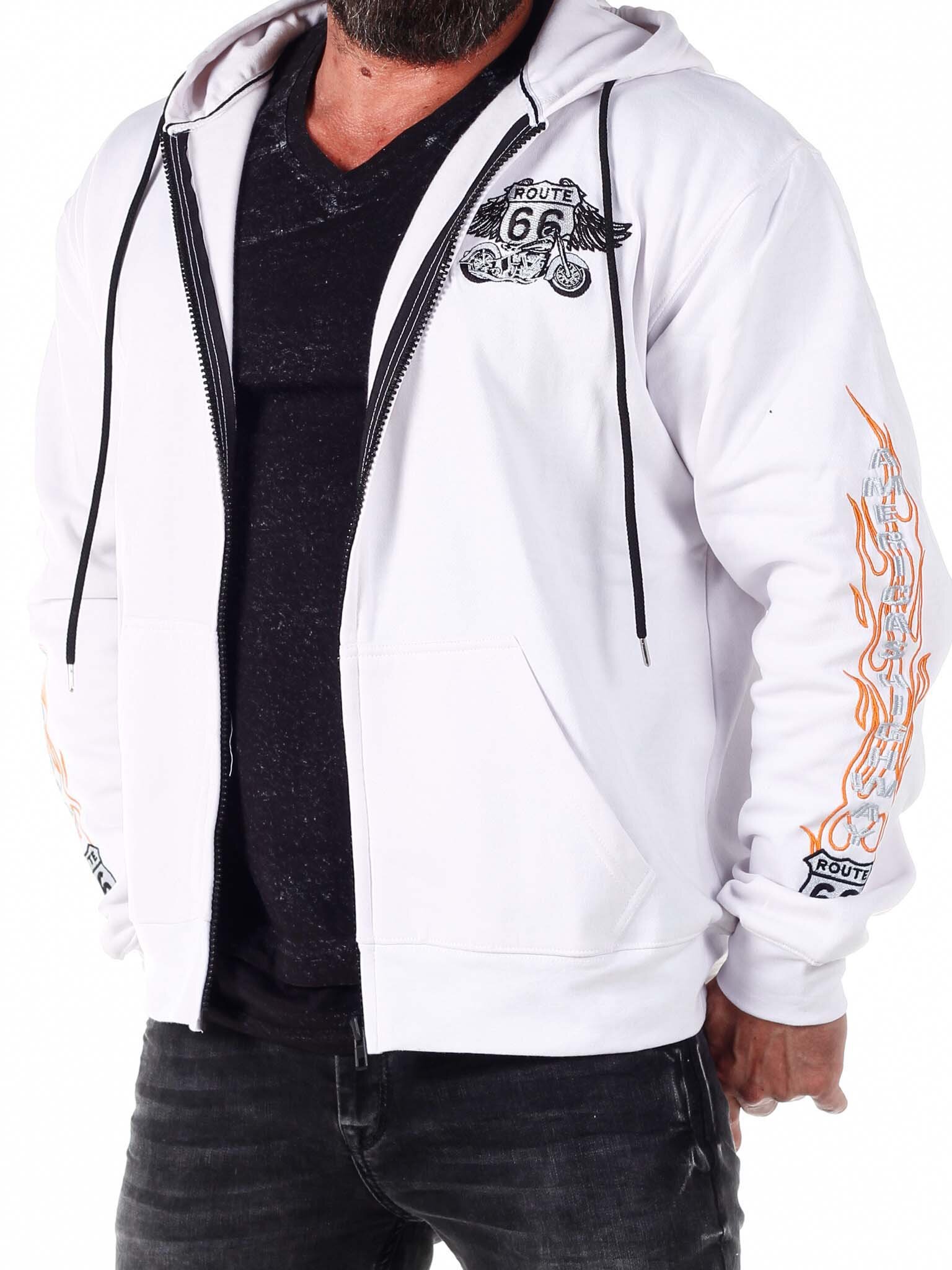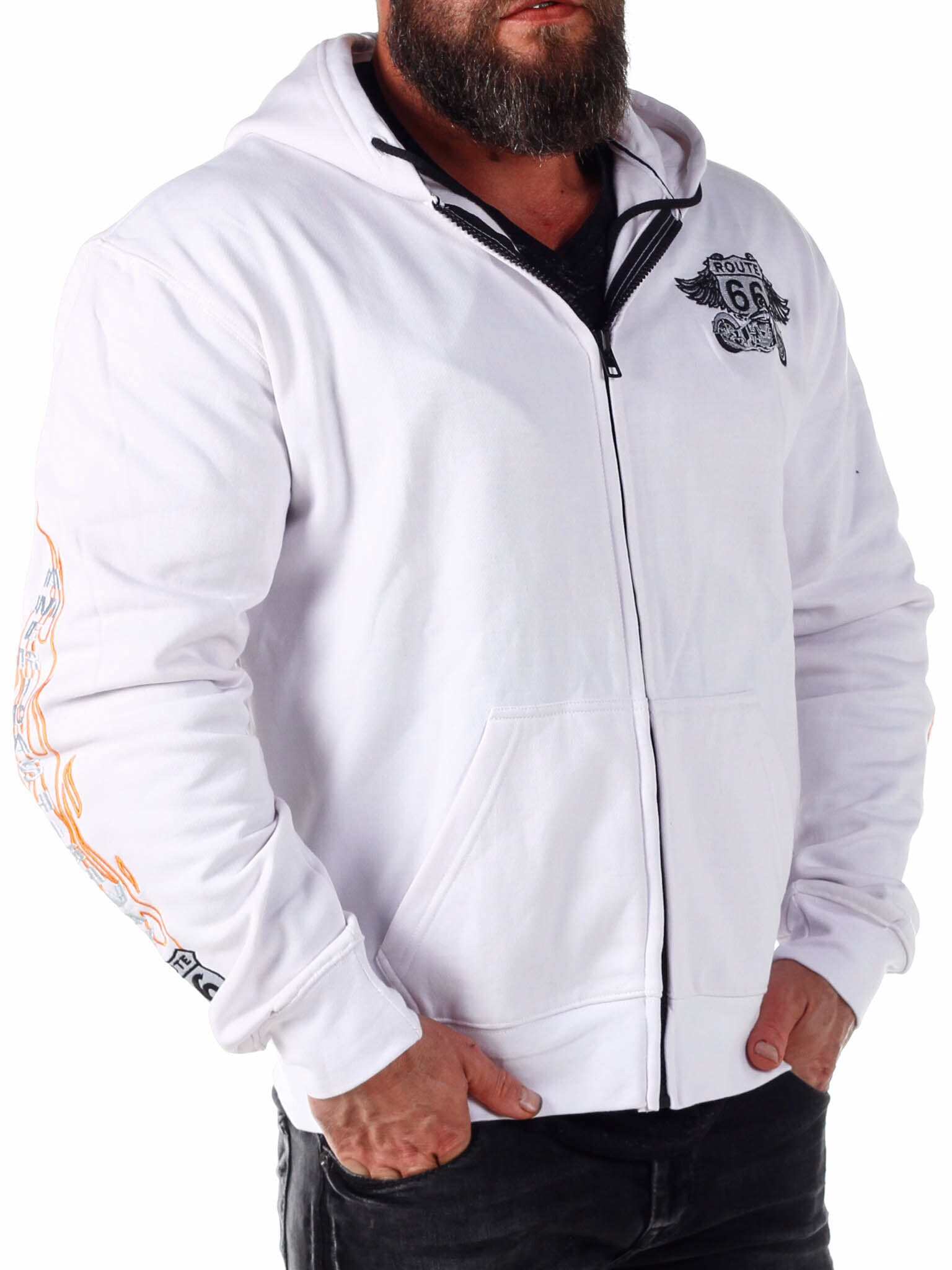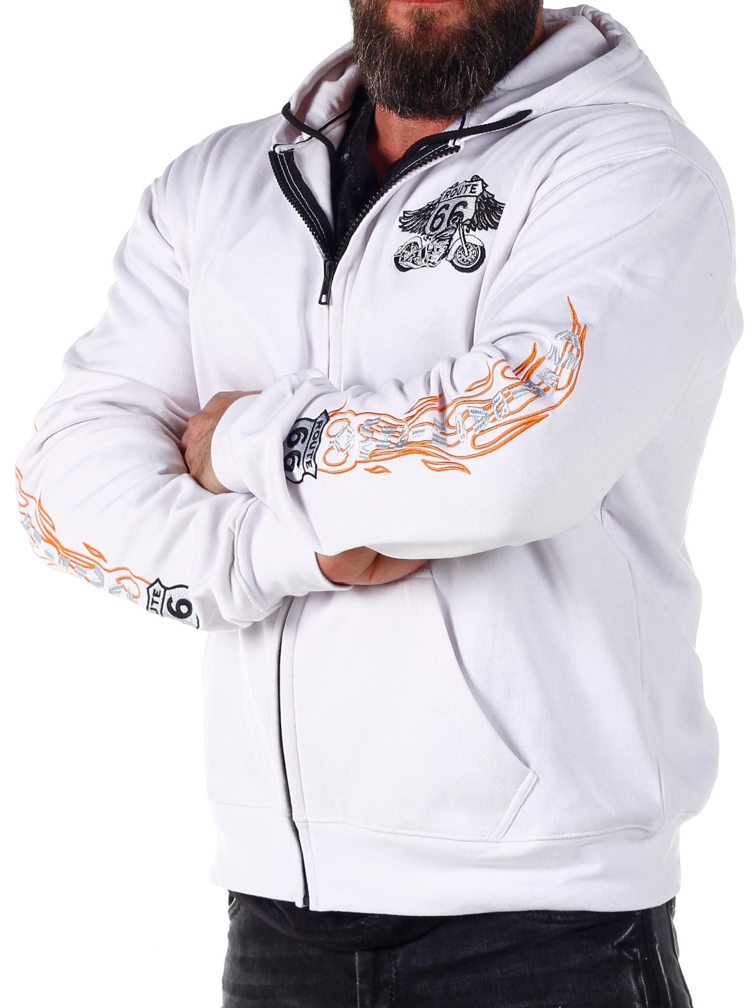 Vetoketjullinen huppari, jossa on taskut vatsan päällä. Tilava ja mukava muotoonommeltu malli, joka on väritykseltään valkoinen ja orasnssi. Leveät resorit alaosassa ja hihansuissa.