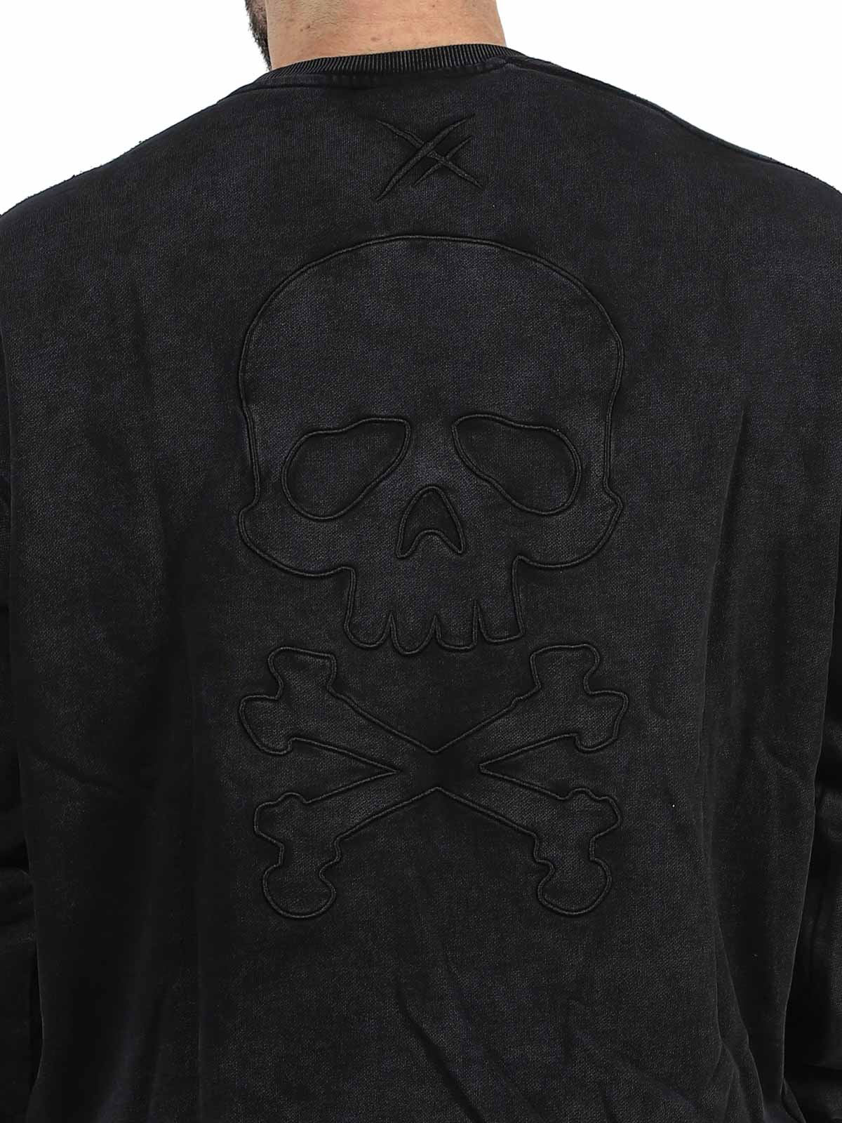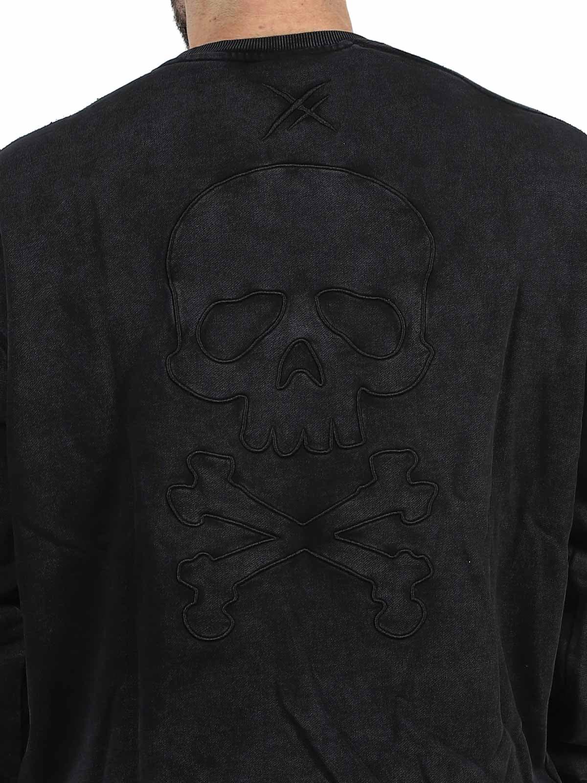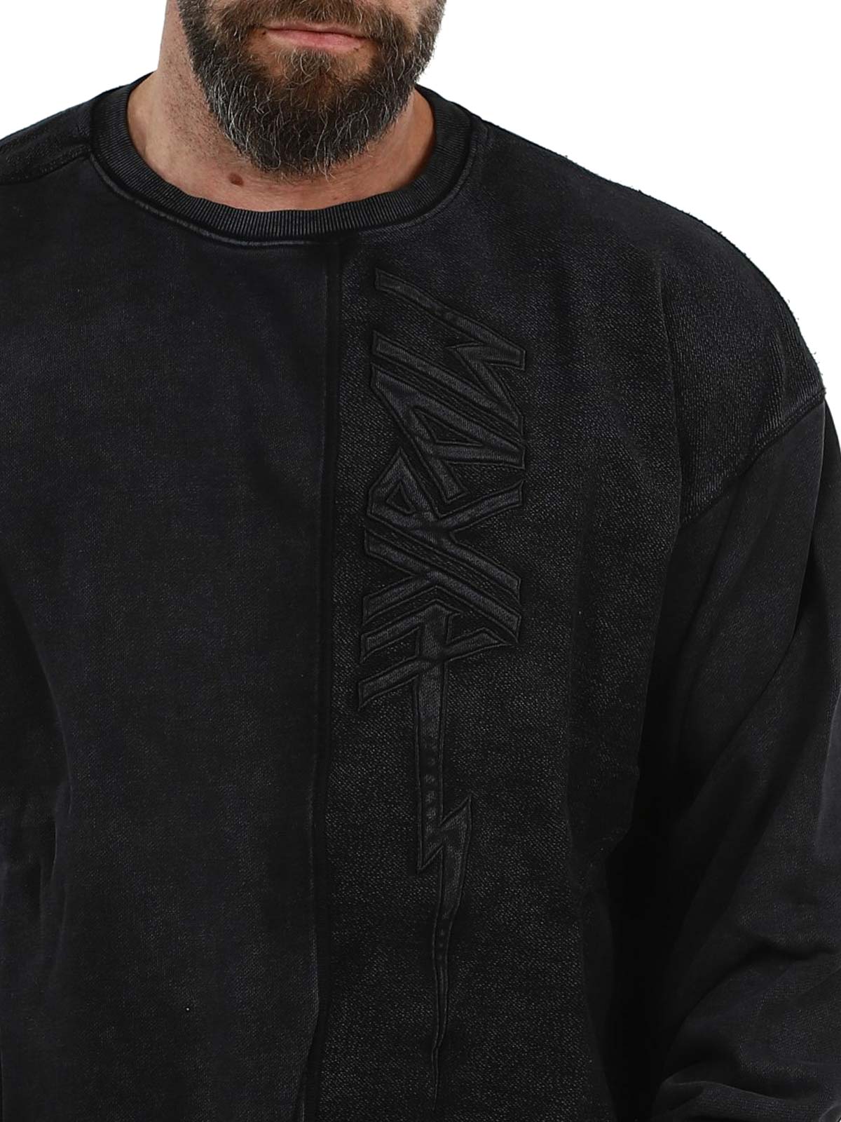 Musta collegepaita, jossa on kulutettu ilme, suunniteltu Hyraw-logolla edessä ja suurella pääkallomotiivilla selässä. Mallissa on oversized-istuvuus, joka antaa rennon ja modernin ilmeen – täydellinen sinulle, joka haluat sekä tyyliä että liikkumisvapautta. Paidassa on myös resorit hihansuissa ja helmassa mukavaa istuvuutta varten.
