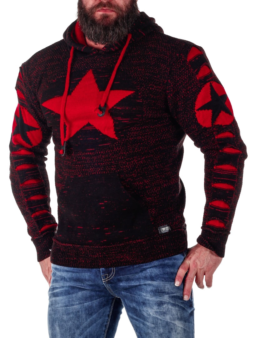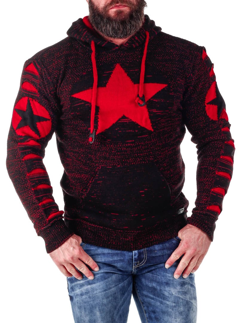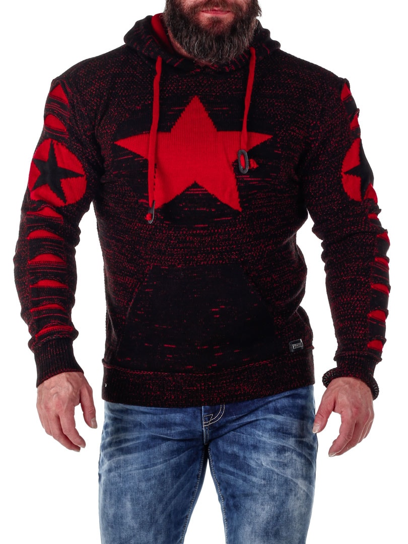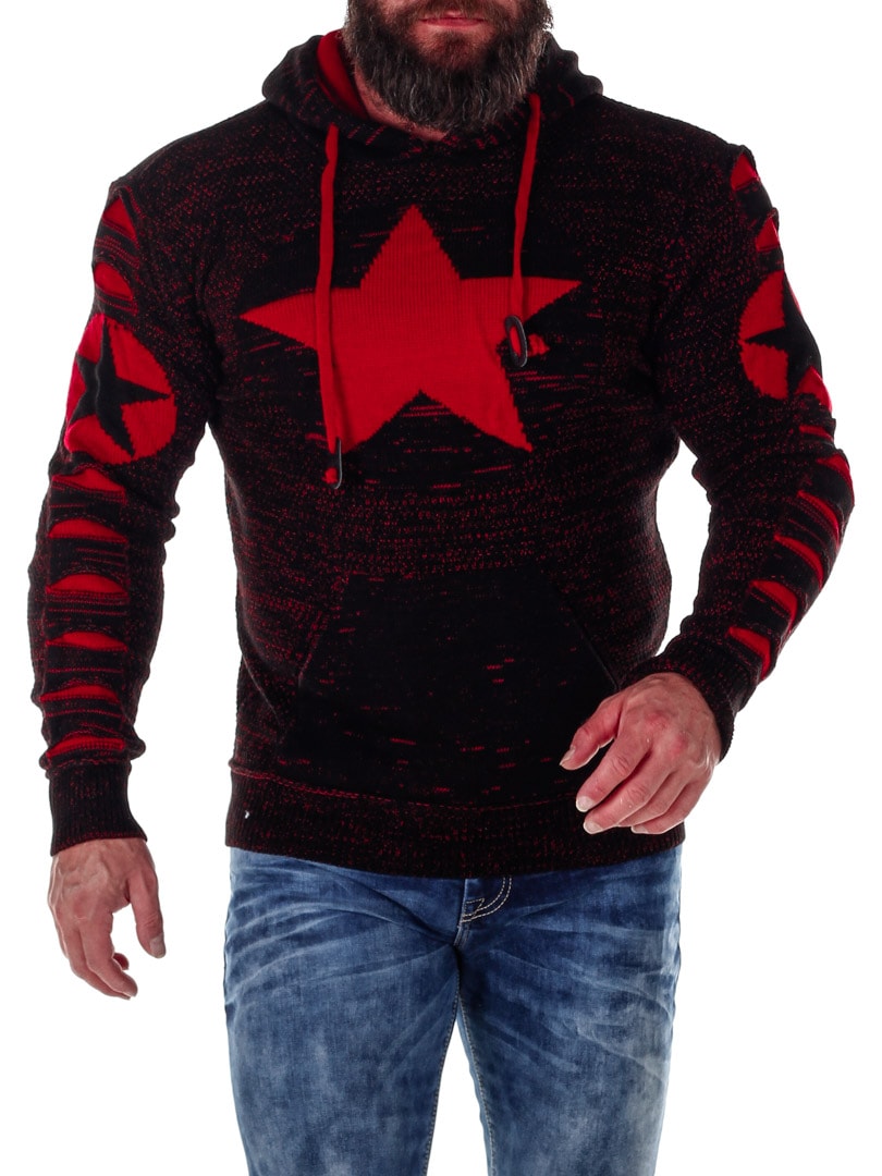 Mukavantuntuinen ja lämmin huppari neulemateriaalista. Suuri tasku vatsan päällä ja säädettävä huppu. Kuvituksena tähtiä ja punaiset raitoja.