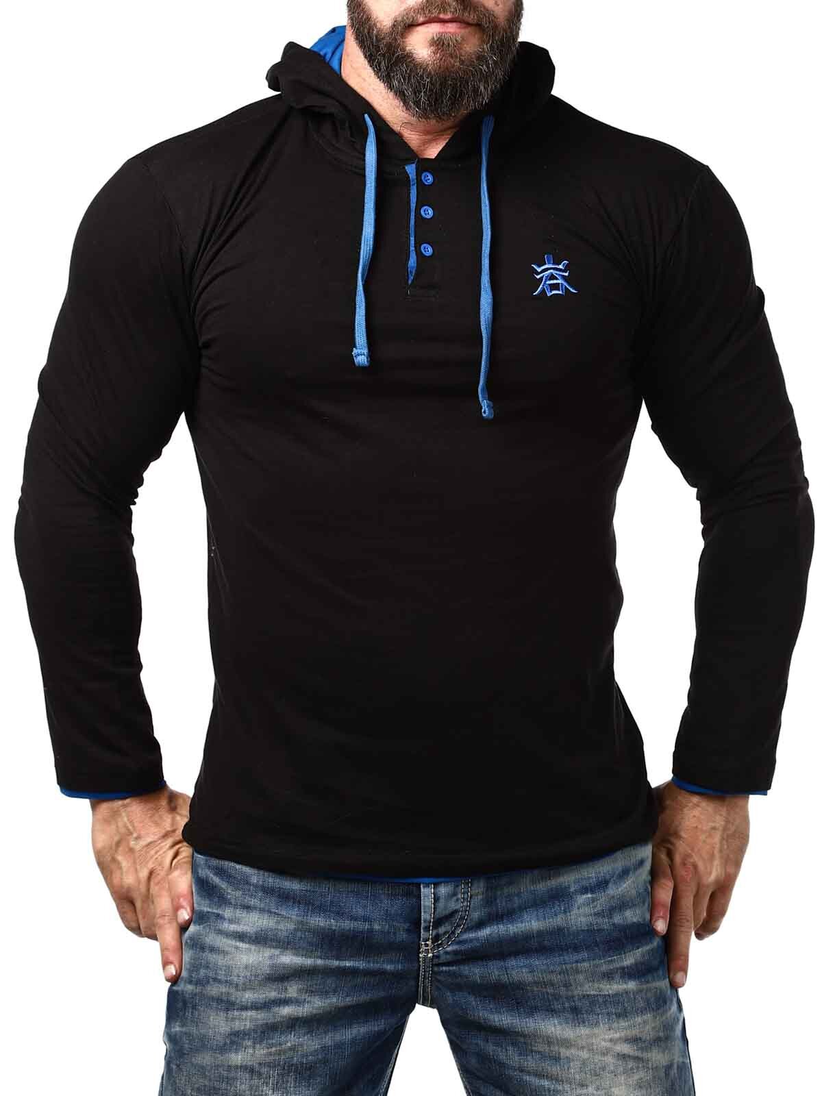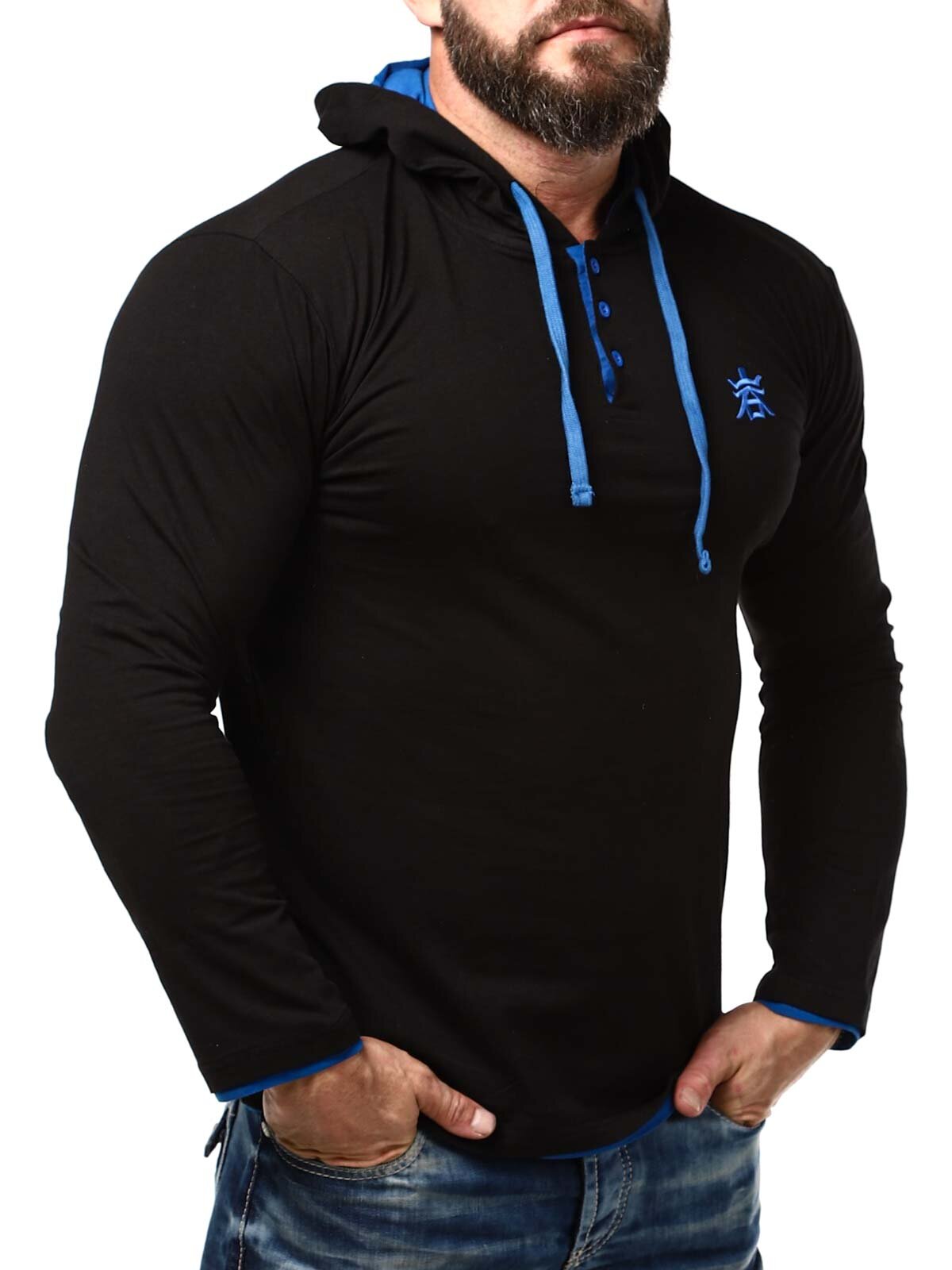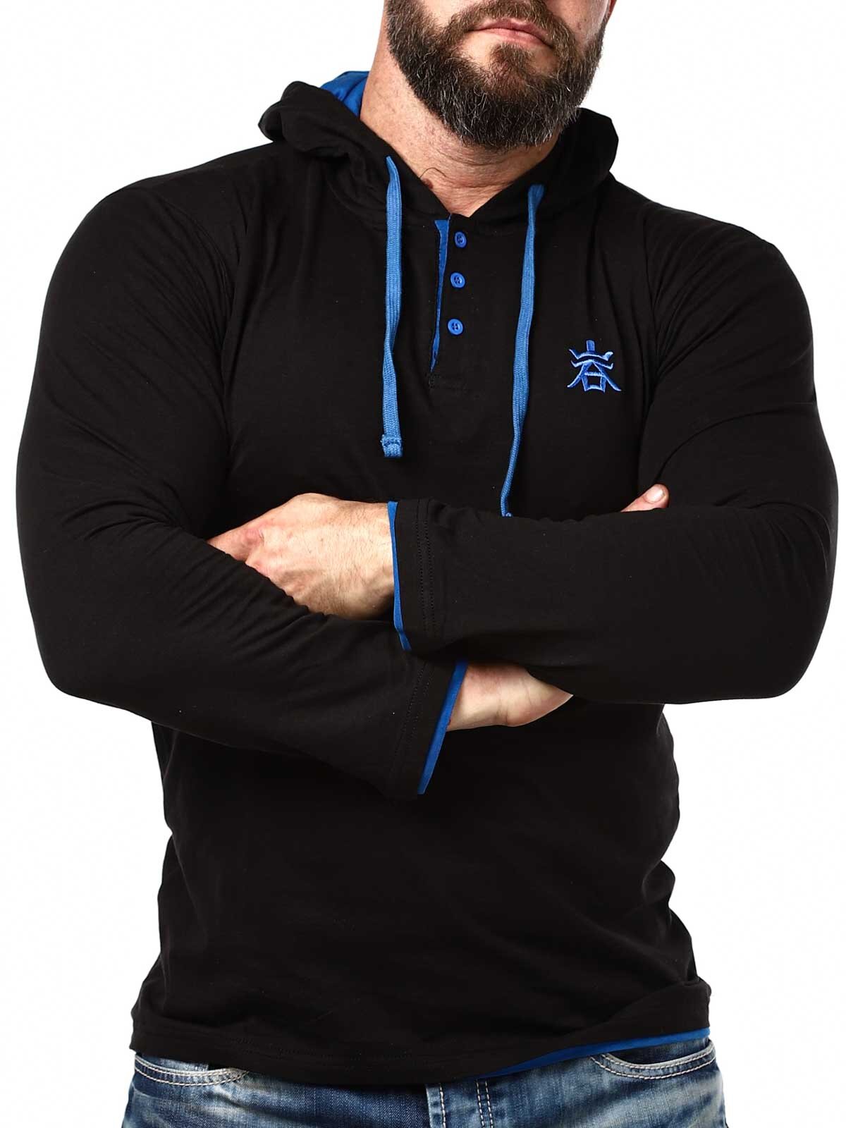 Musta pitkähihainen sinisillä yksityiskohdilla. Paita on malliltaan klassinen, ja siinä huppu ja etupuolella napit kaula-aukossa. Tämän ainutlaatuisen pitkähihainen löydät vain RockDenimiltä!