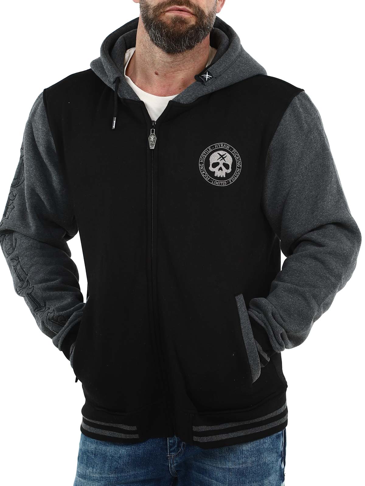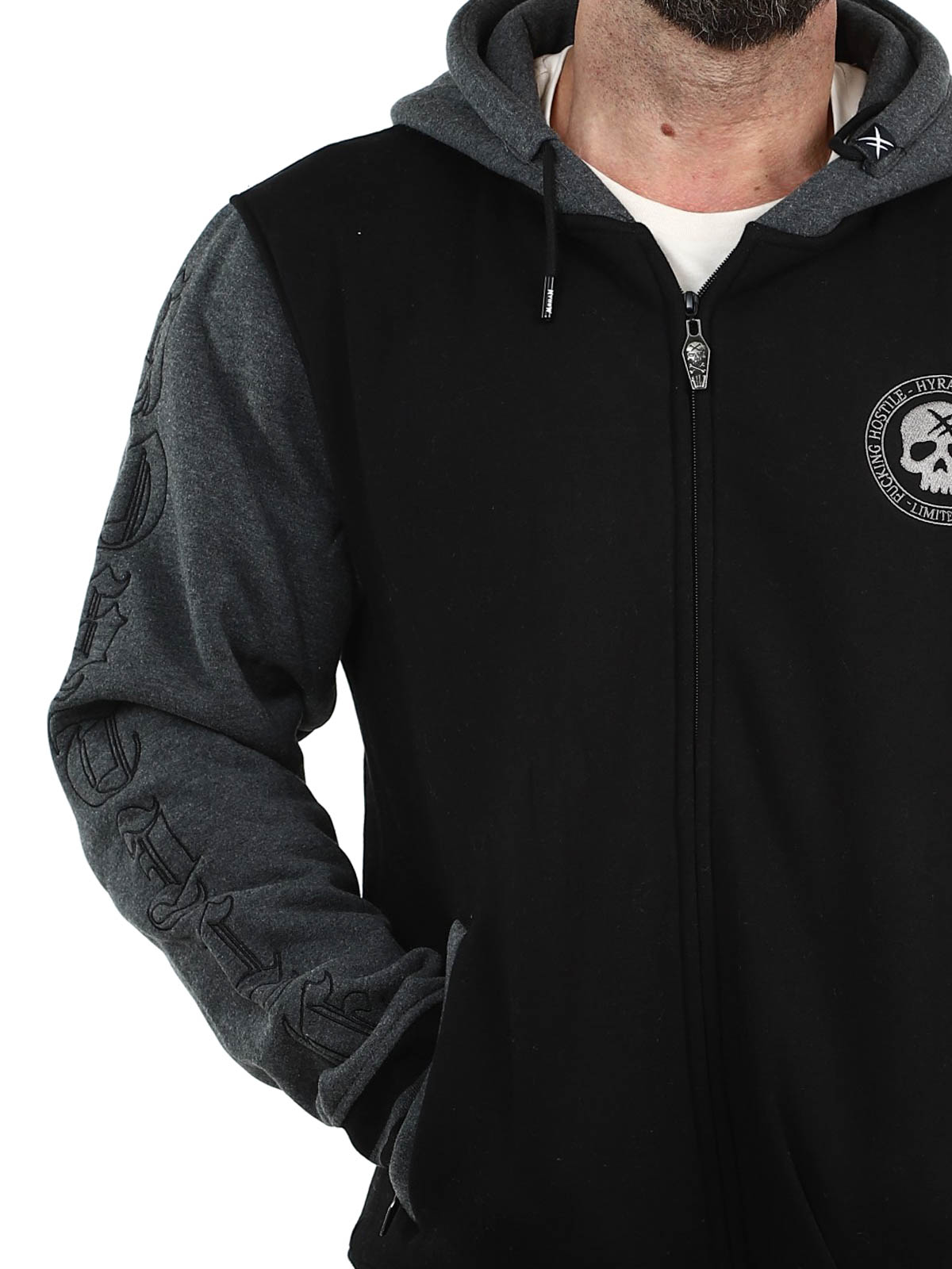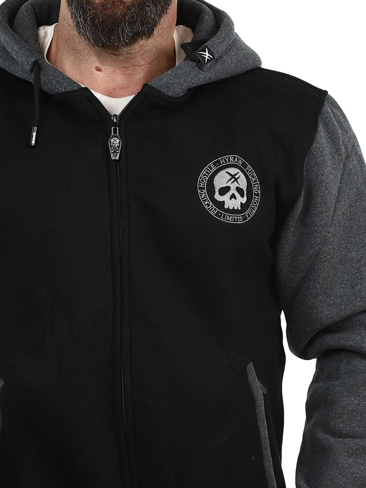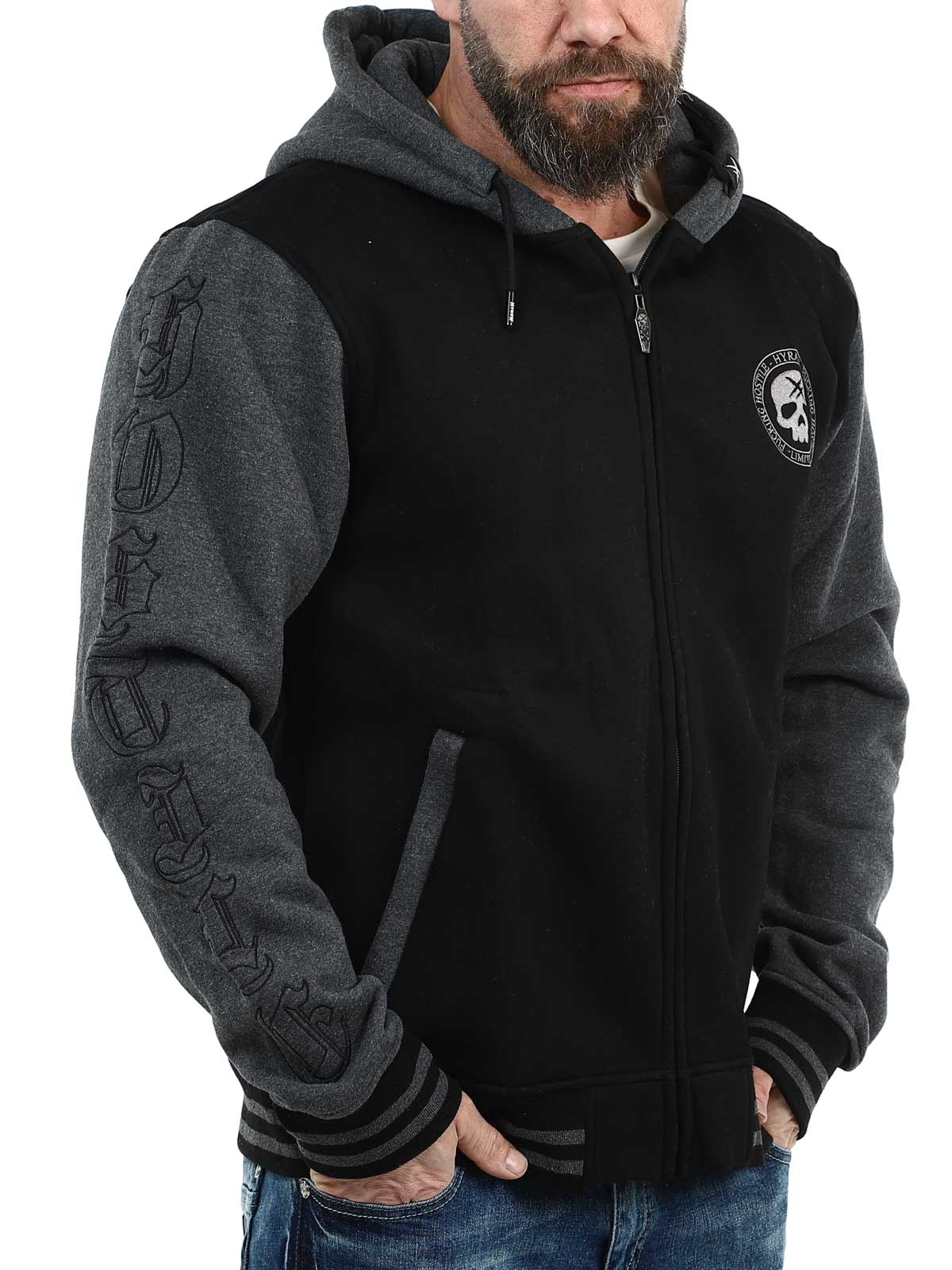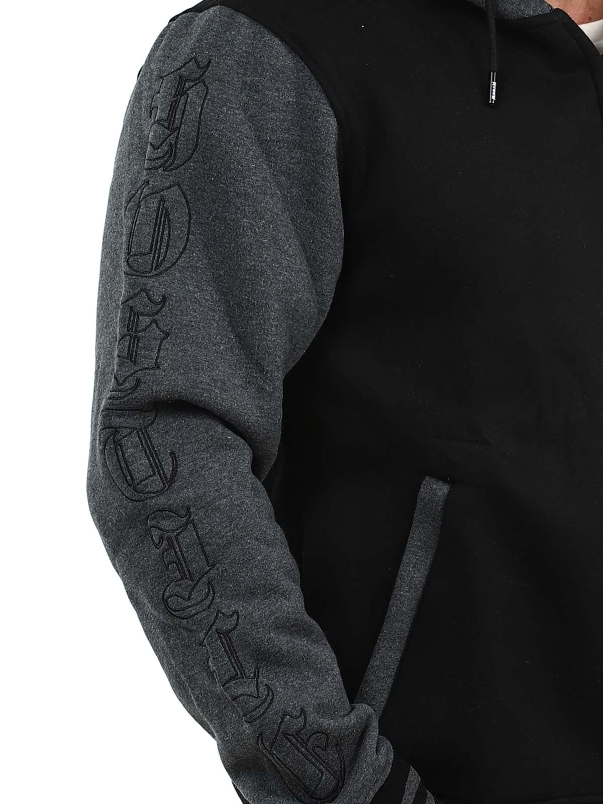 Musta huppari tummanharmaalla hupulla ja hihoilla. Suunniteltu brodeeratuilla painatuksilla rinnassa, selässä ja hihoissa. Hupparissa on harjattu sisäpinta, kaksi vetoketjullista taskua sekä resorit hihansuissa ja helmassa.