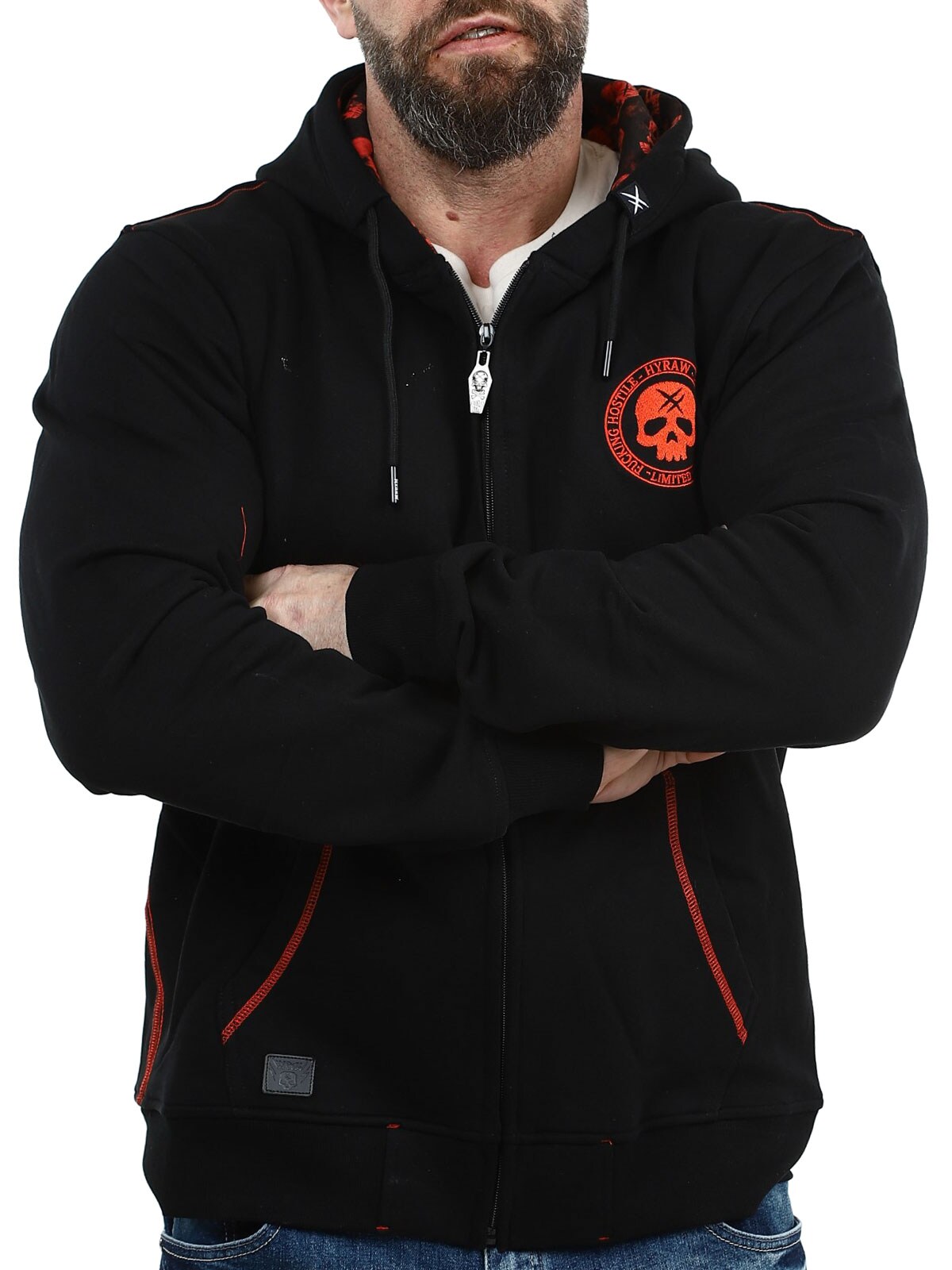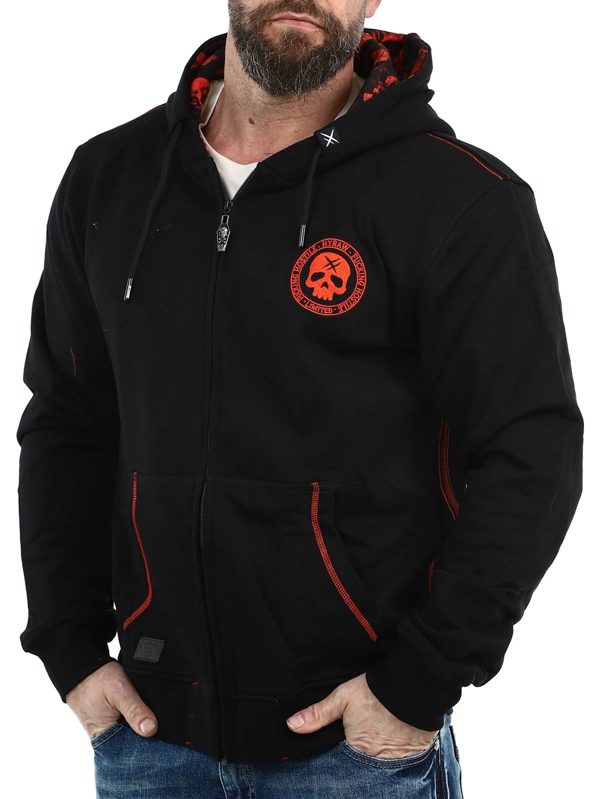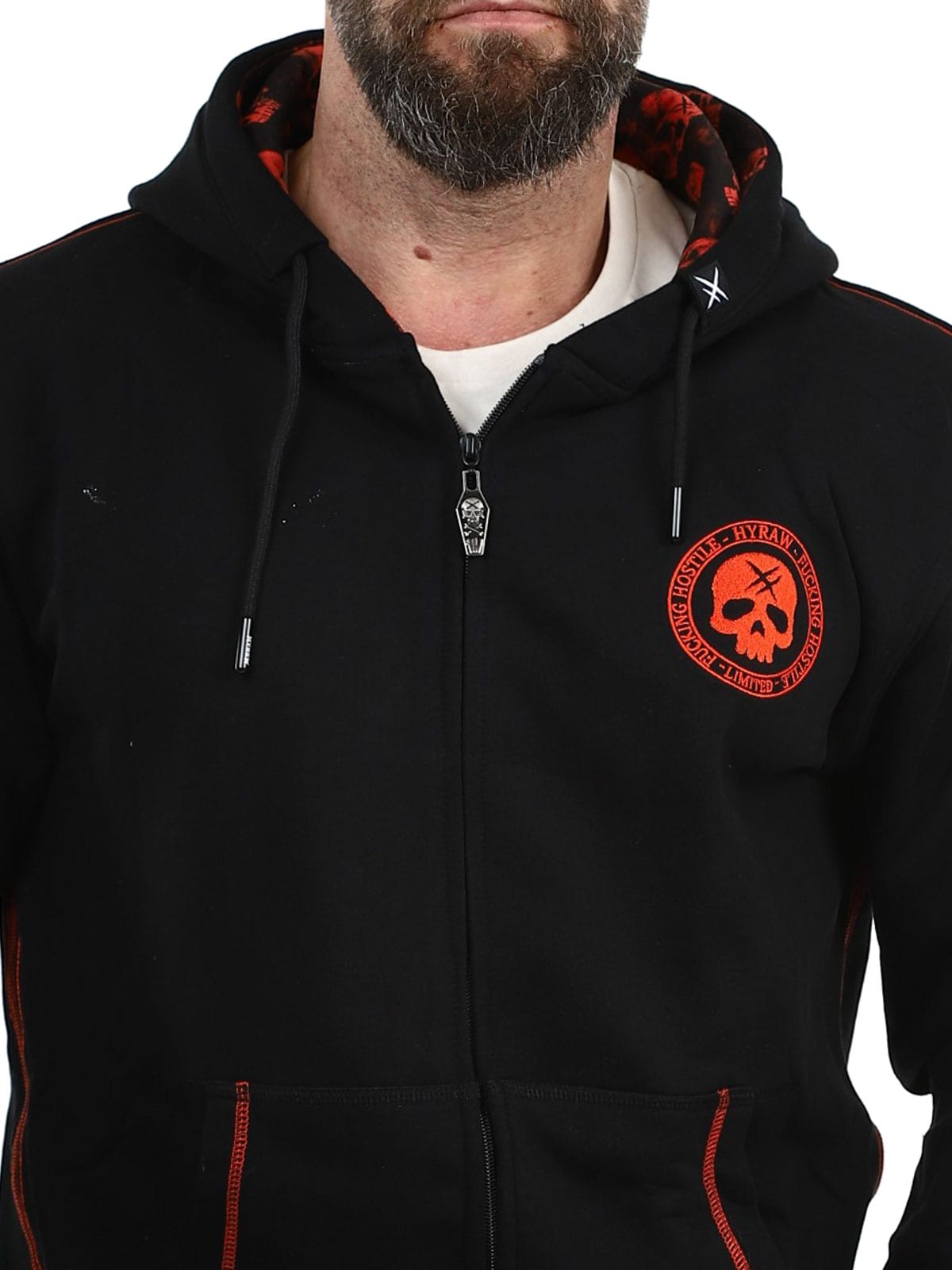 Näyttävä huppari, jossa on suuri punainen brodeerattu painatus selässä sekä pienempi painatus rinnassa. Hupparissa on huppu kiristysnyöreillä ja kaksi avointa taskua edessä. Hupun sisäpuolella on myös ainutlaatuinen painatus, joka erottuu selvästi, kun huppu on päässä, ja antaa vaatteelle näyttävän yksityiskohdan.