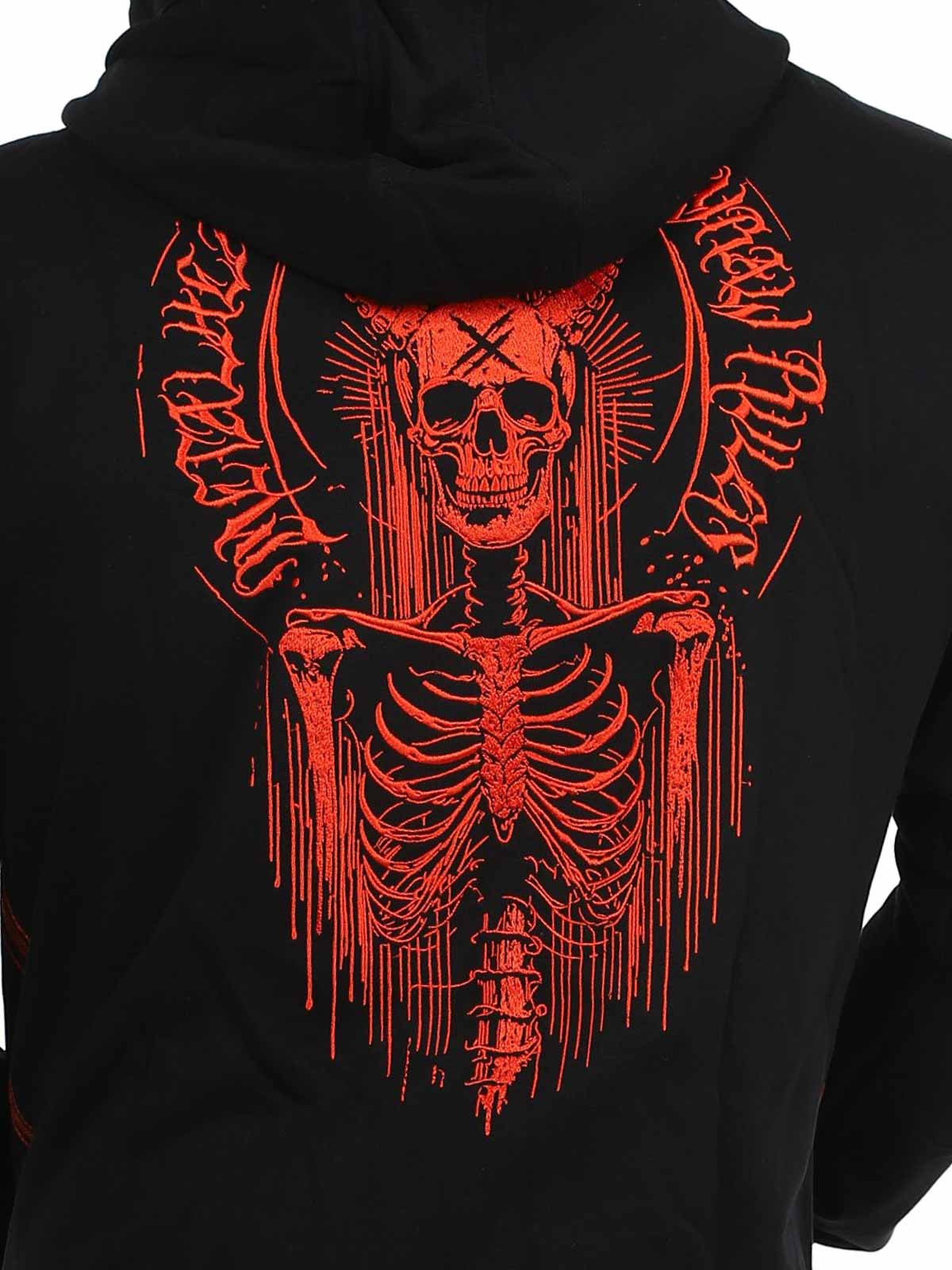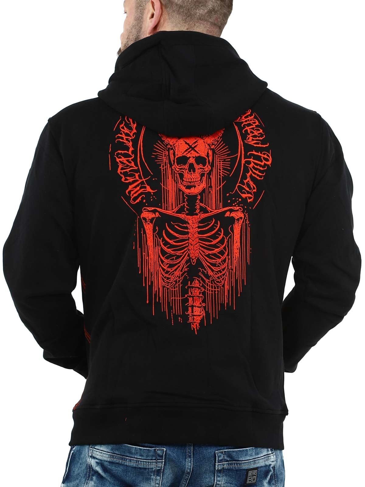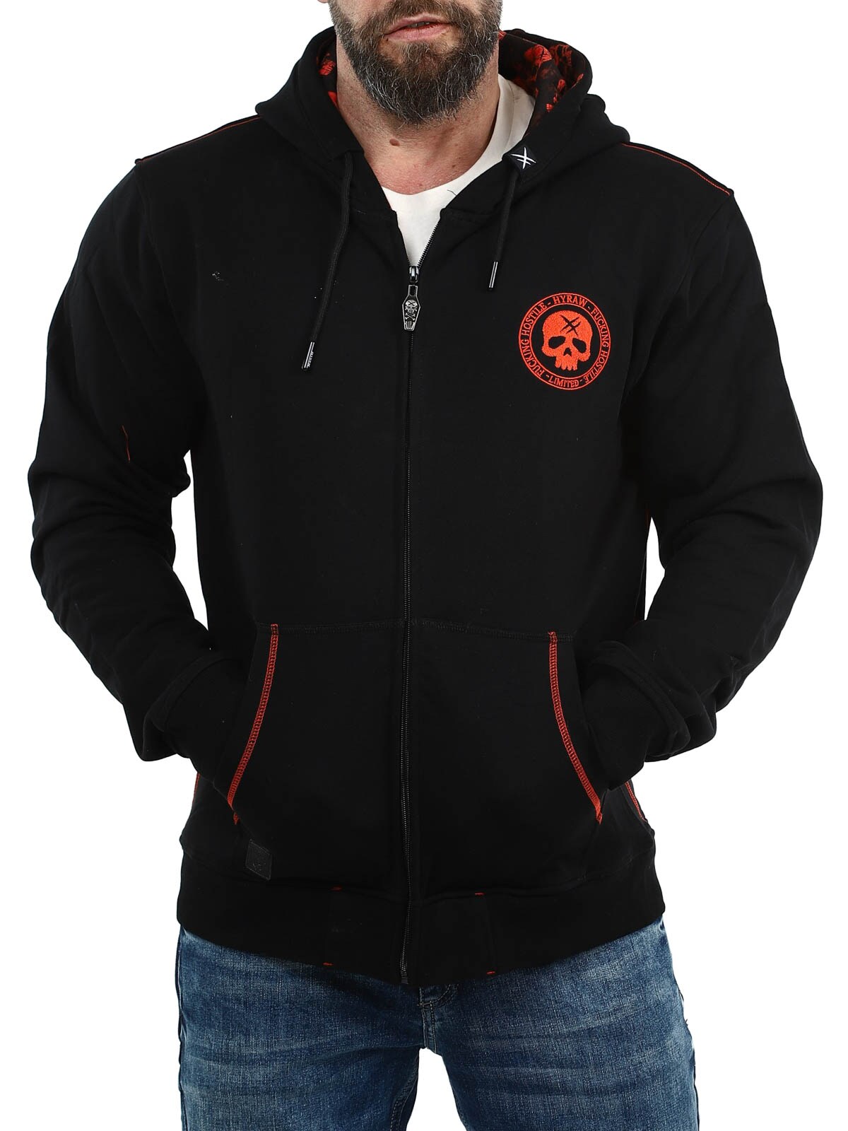 Näyttävä huppari, jossa on suuri punainen brodeerattu painatus selässä sekä pienempi painatus rinnassa. Hupparissa on huppu kiristysnyöreillä ja kaksi avointa taskua edessä. Hupun sisäpuolella on myös ainutlaatuinen painatus, joka erottuu selvästi, kun huppu on päässä, ja antaa vaatteelle näyttävän yksityiskohdan.