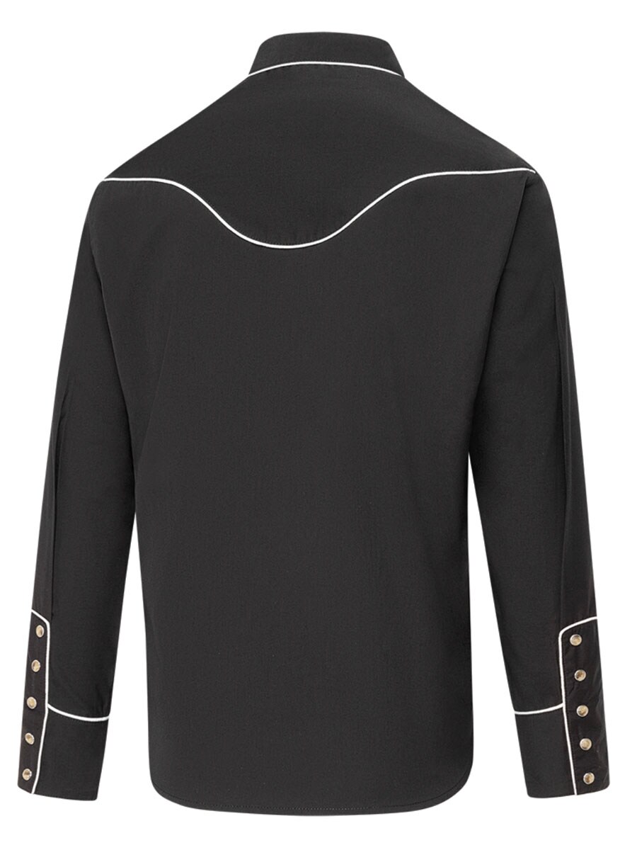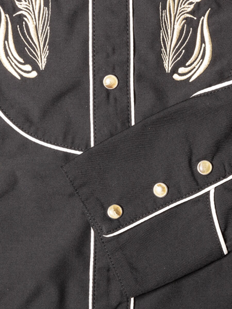 Musta westernpaita, jossa on tyylikäs muotoilu ja tunnusomaiset yksityiskohdat. Paidassa on koristeellinen kirjailu rinnassa, joka antaa sille autenttisen western-ilmeen ja selkeän cowboy-tyylin. Kontrastiväriset tereet korostavat paidan linjoja ja tuovat designiin tyylikkään yksityiskohdan. Polyesterin ja viskoosin sekoitus tekee paidasta pehmeän, mukavan ja kestävän.
