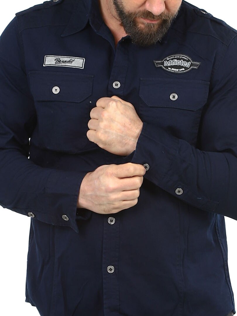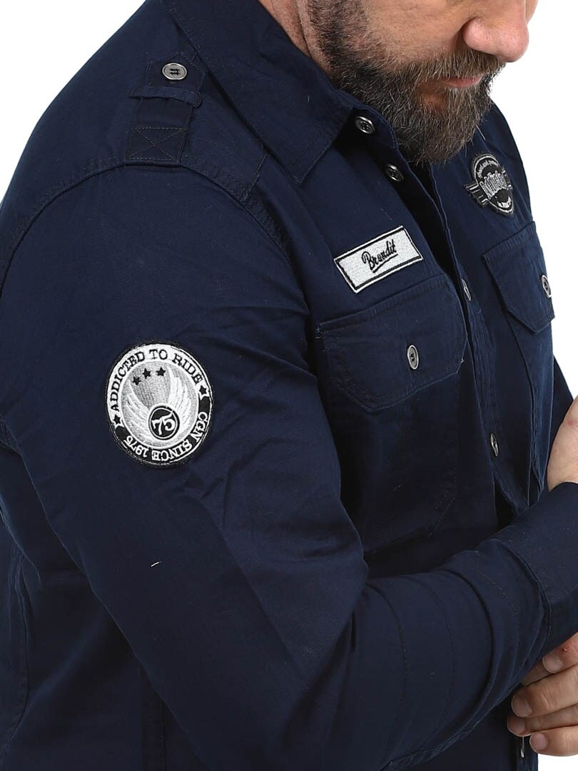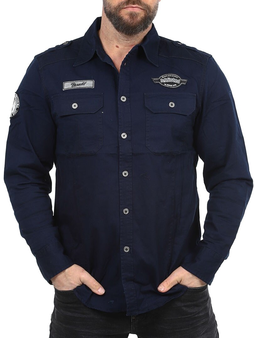 Retrohenkinen, malliltaan suora paita, jossa on kaksi napeilla suljettavaa rintataskua. Yksityiskohtana kangasmerkit hihassa ja rinnuksessa. Paidassa on pyöristetty helma.
