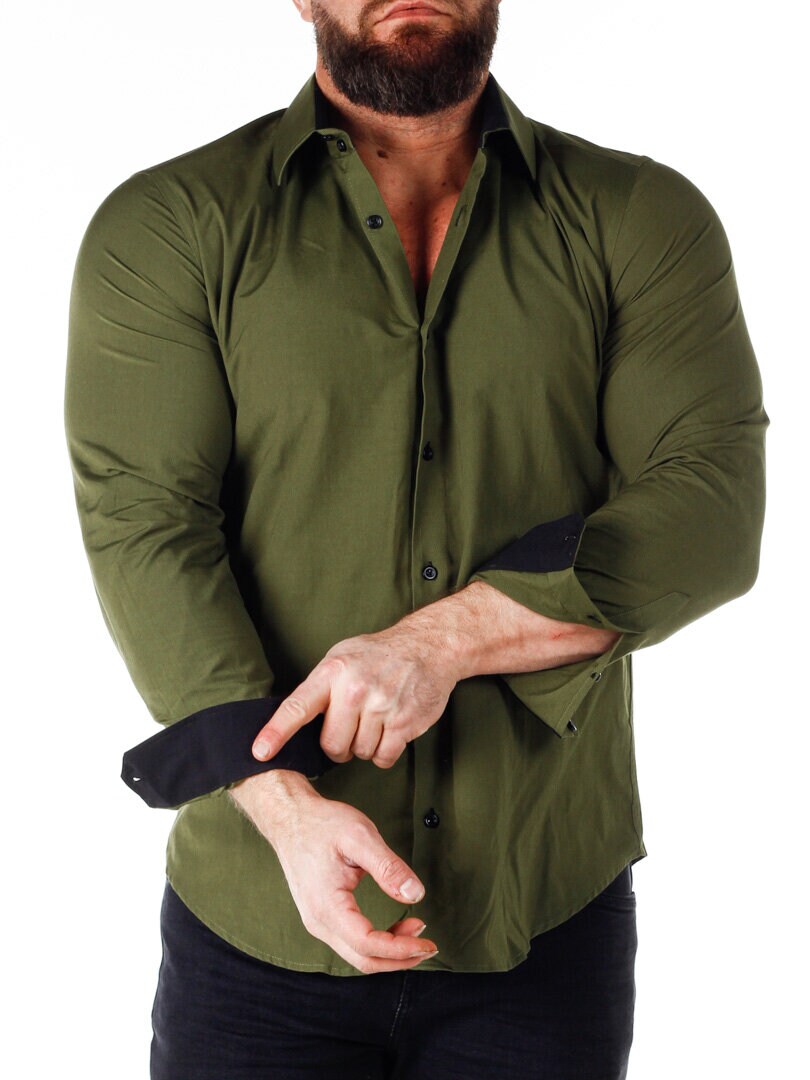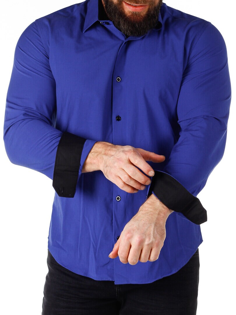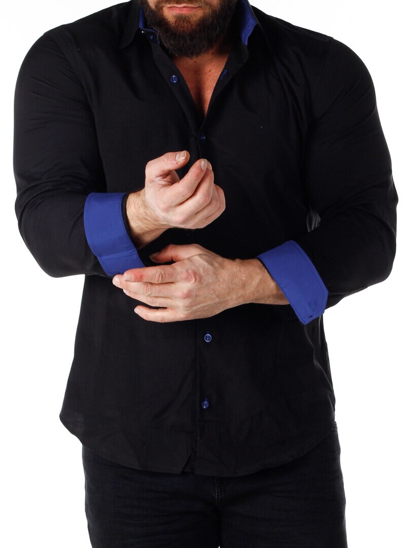 Puuvillapaita on malliltaan mukava ja siinä on hiukan joustavuutta. Musta pohjaväri, mutta napit, kauluksen sisäpuoli ja hihansuut kontrastivärissä. Kapeampi malli, jossa on pyöristetty helman alareuna ja vahvistettu kaulus, joka pitää muotonsa.