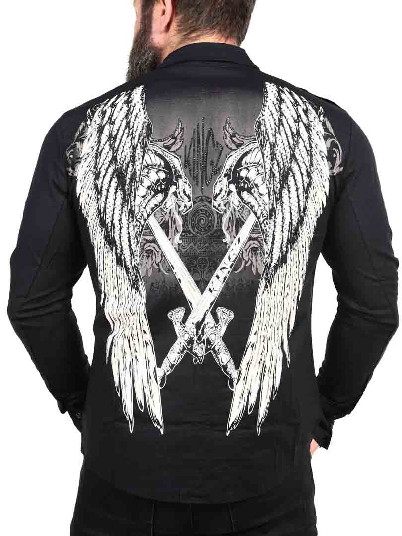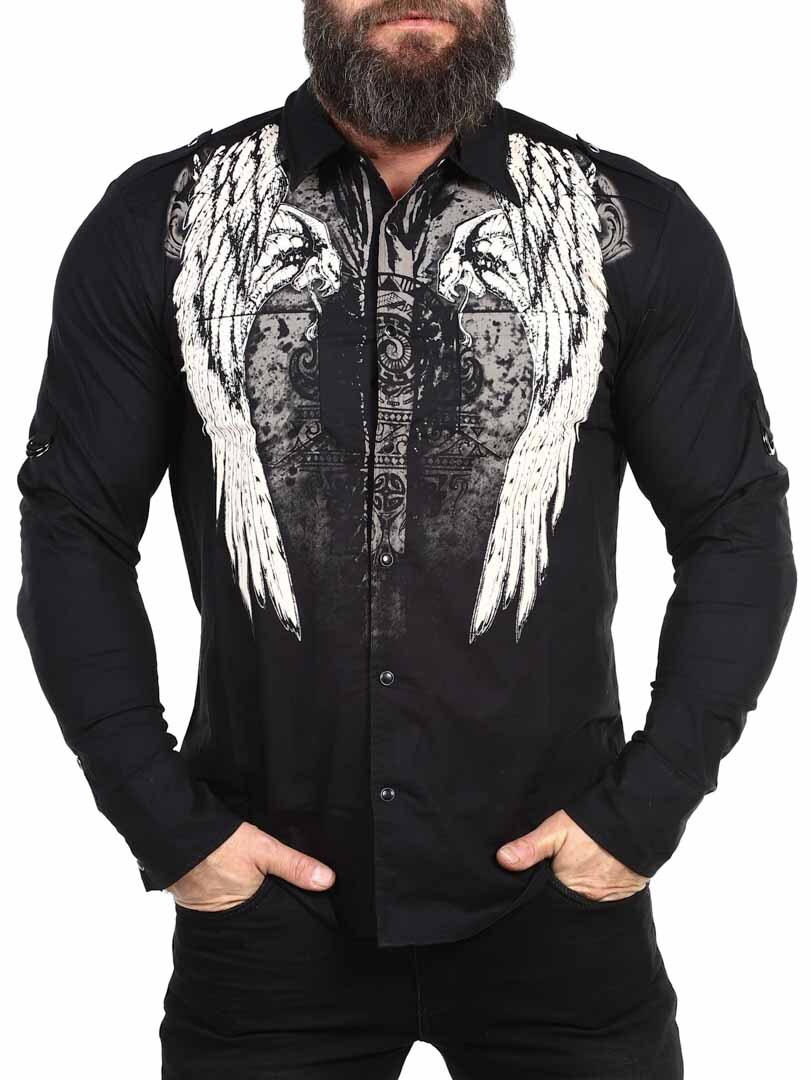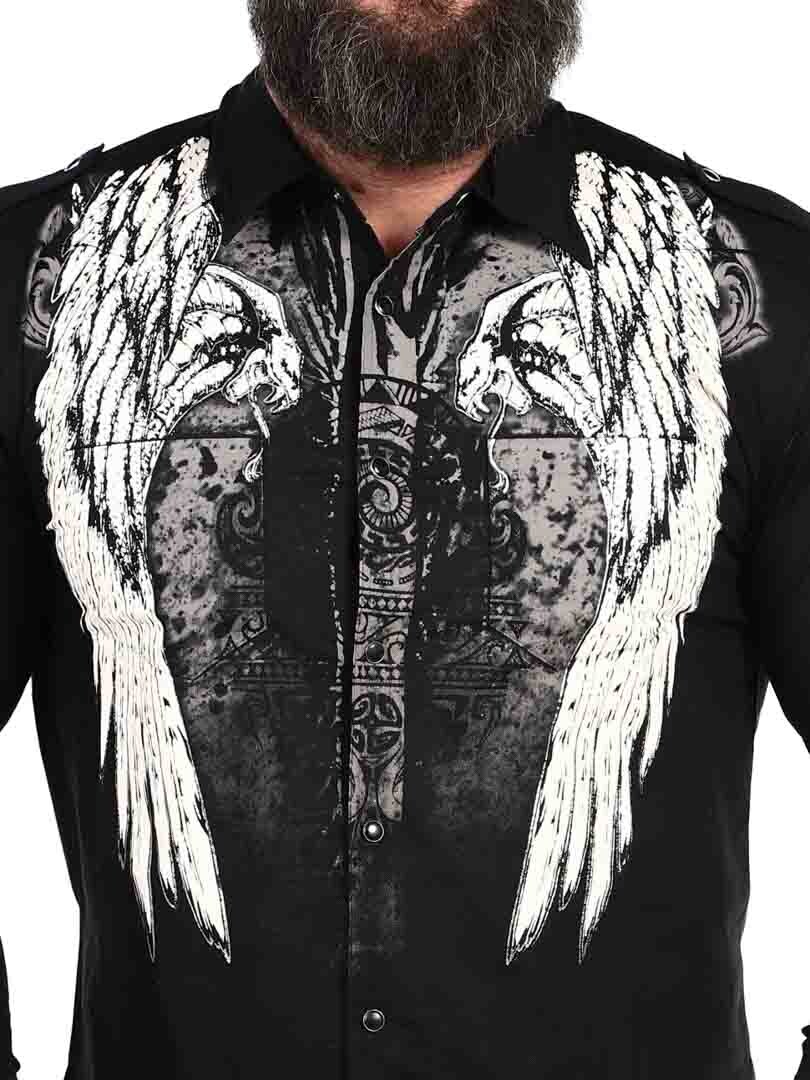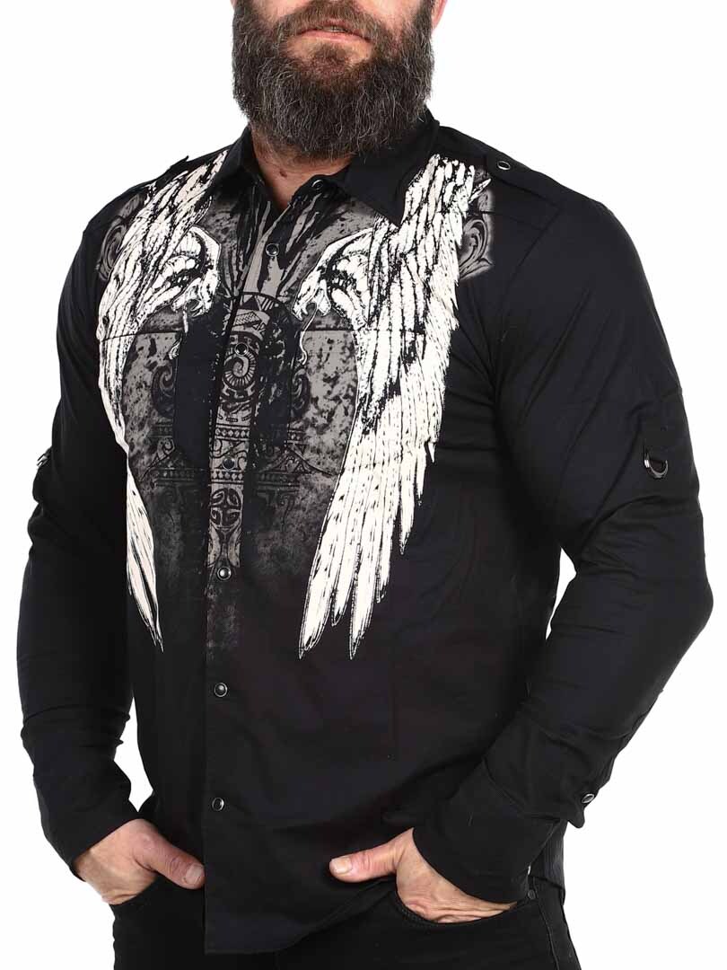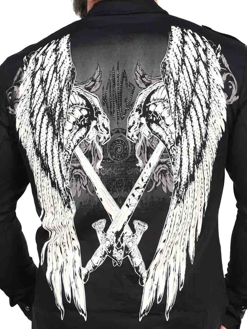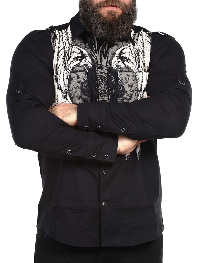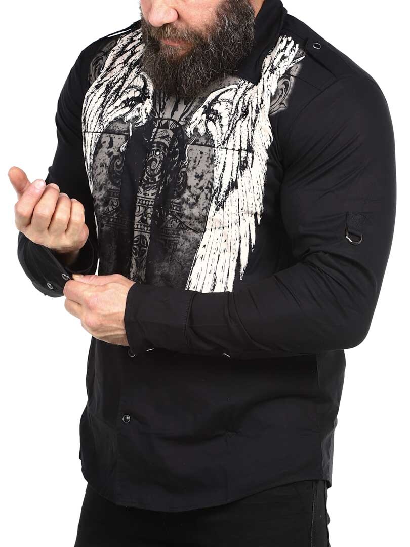 Musta paita, jossa on rohkeita kontrastivärisiä painatuksia. Varustettu yksivärisellä kauluksella, kangasnapeilla ja kahdella rintataskulla. Hihat voidaan taittaa ylös ja kiinnittää kiristysnauhalla.