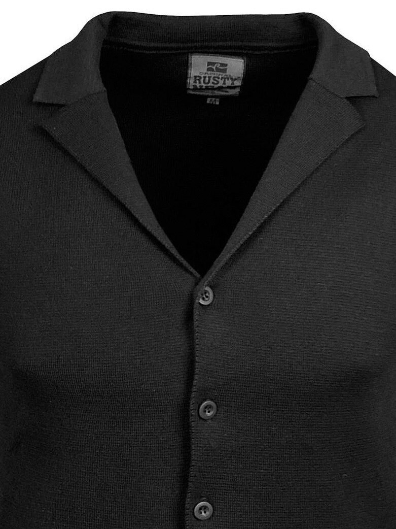 Musta puuvillainen neuleliivi V:n muotoisella kaula-aukolla ja kauluksella. Joustava napeilla suljettava malli ribbireunoilla. Tyylikäs ja yksivärinen suunnittelu, joka on helppo yhdistää moneen tyyliin.