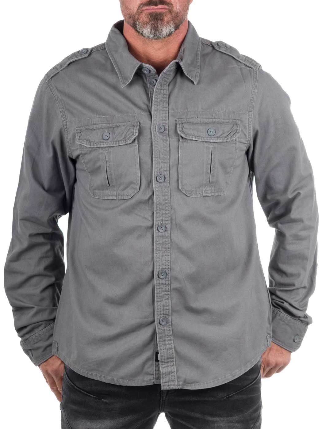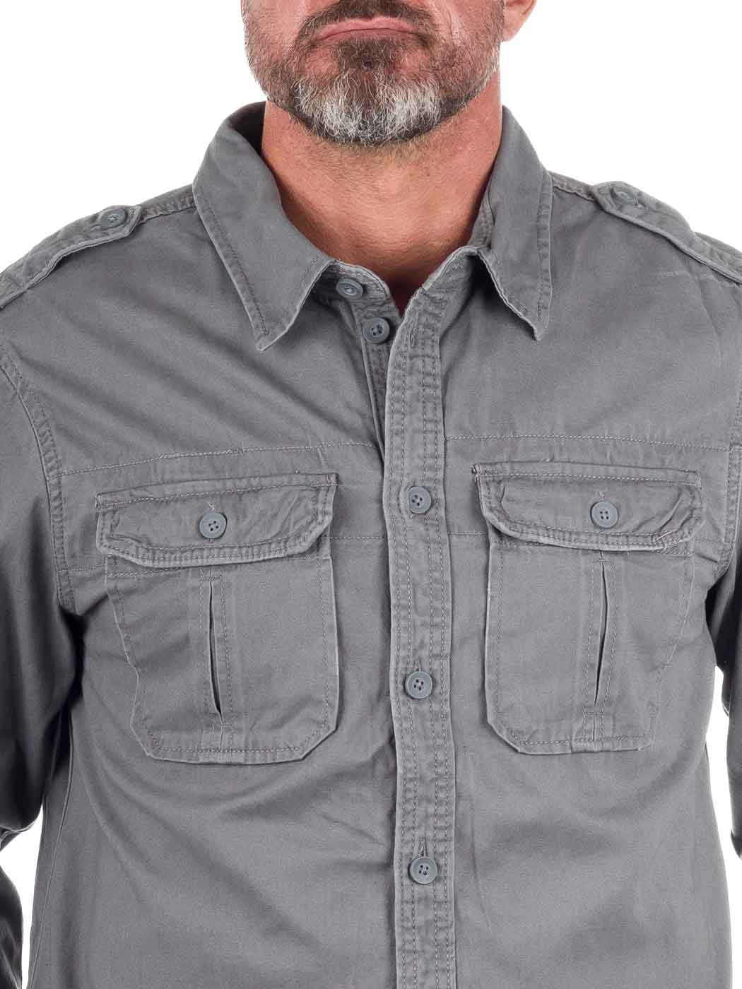 Tukeva ja tyylikäs paita paksusta puuvillamateriaalista, jossa olkapäillä hihnat, kaulus ja nappikiinnitteiset rintataskut. Yksityiskohtina vahvat saumat ja musta kangaspatch-logolla helmassa.