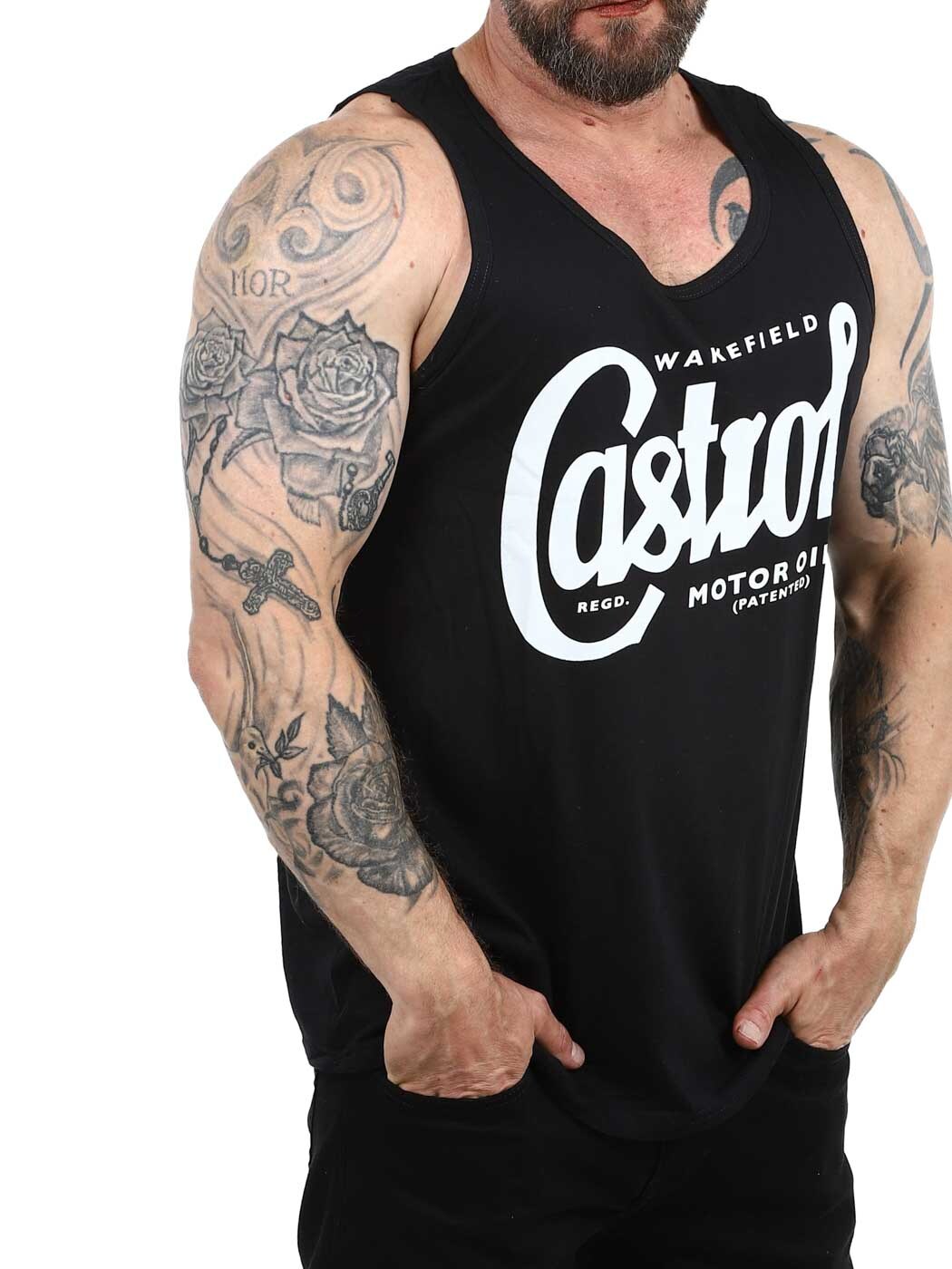 Tämä musta tankkitoppi klassisella Castrol Motor Oil -painatuksella on ehdoton hankinta kaikille retron, kilpa-ajojen ja ikonisen muotoilun ystäville. Tyylikäs valkoinen logo mustaa kangasta vasten luo mukavan kontrastin ja aidon vintage-ilmeen. Täydellinen lämpimiin päiviin, treeneihin tai rentoon katutyyliin.