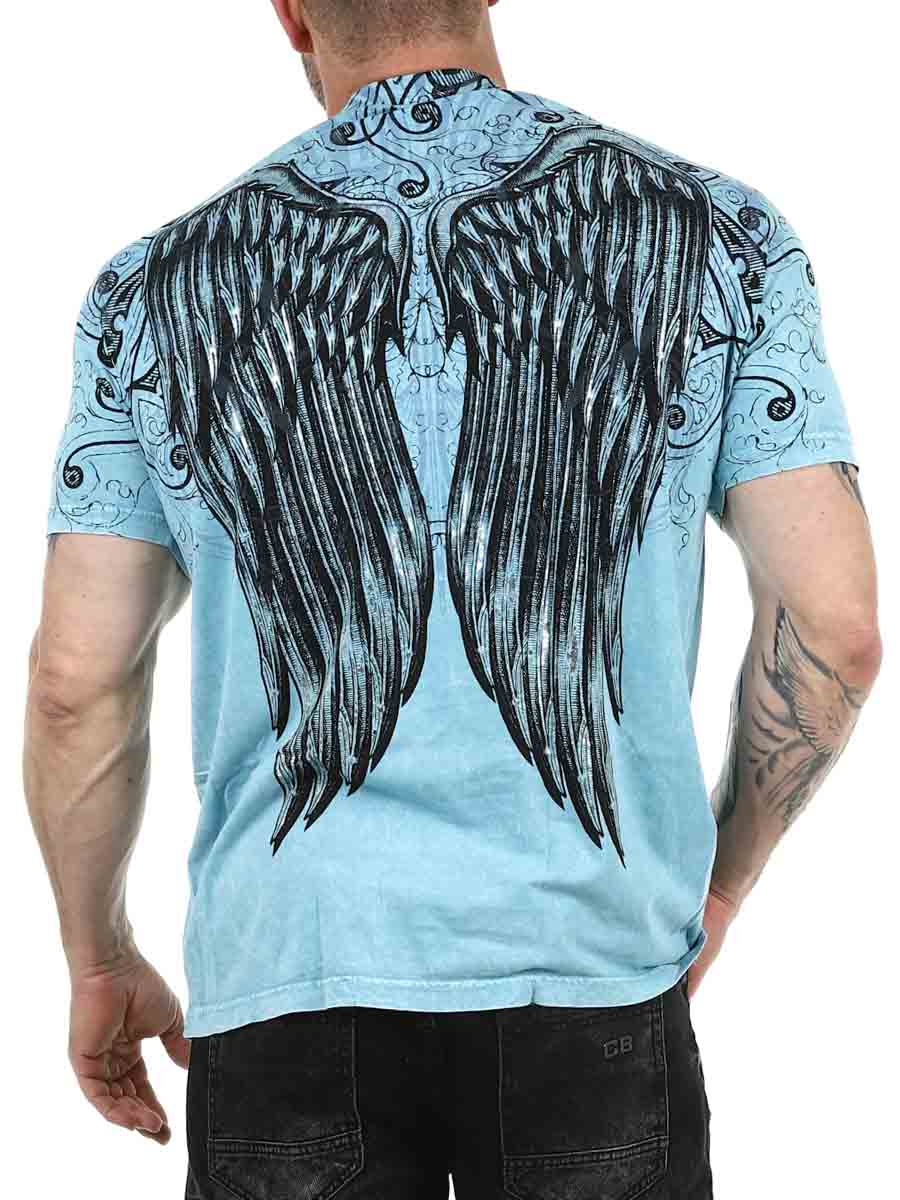 Uniikki t-paita, jossa on selkeä rock-asenne. Sininen, pesty pohja yhdistyy suureen siipikuvioon edessä ja takana, mikä luo voimakkaan kokonaisilmeen. Täydellinen sinulle, joka haluat t-paidan, joka todella erottuu!