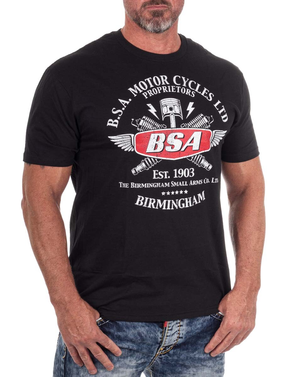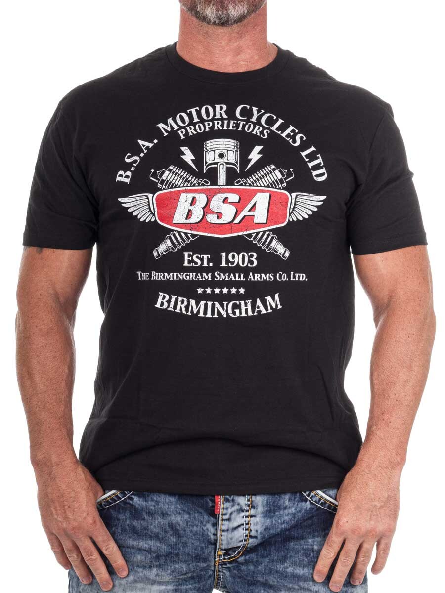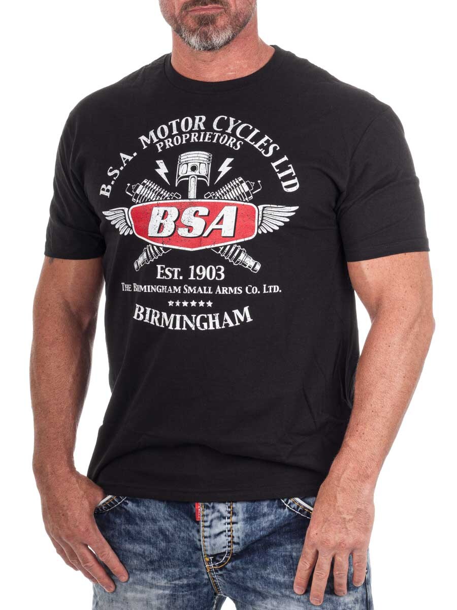 T-paita, jossa on klassinen B.S.A. Motor Cycles Ltd:n moottoripyöräpainatus, inspiroituna legendaarisesta brittiläisestä merkistä Birmingham Small Arms Company. Valmistettu pehmeästä puuvillamateriaalista, joka takaa mukavuuden ja kestävyyden. Suora malli ja pyöreä pääntie.