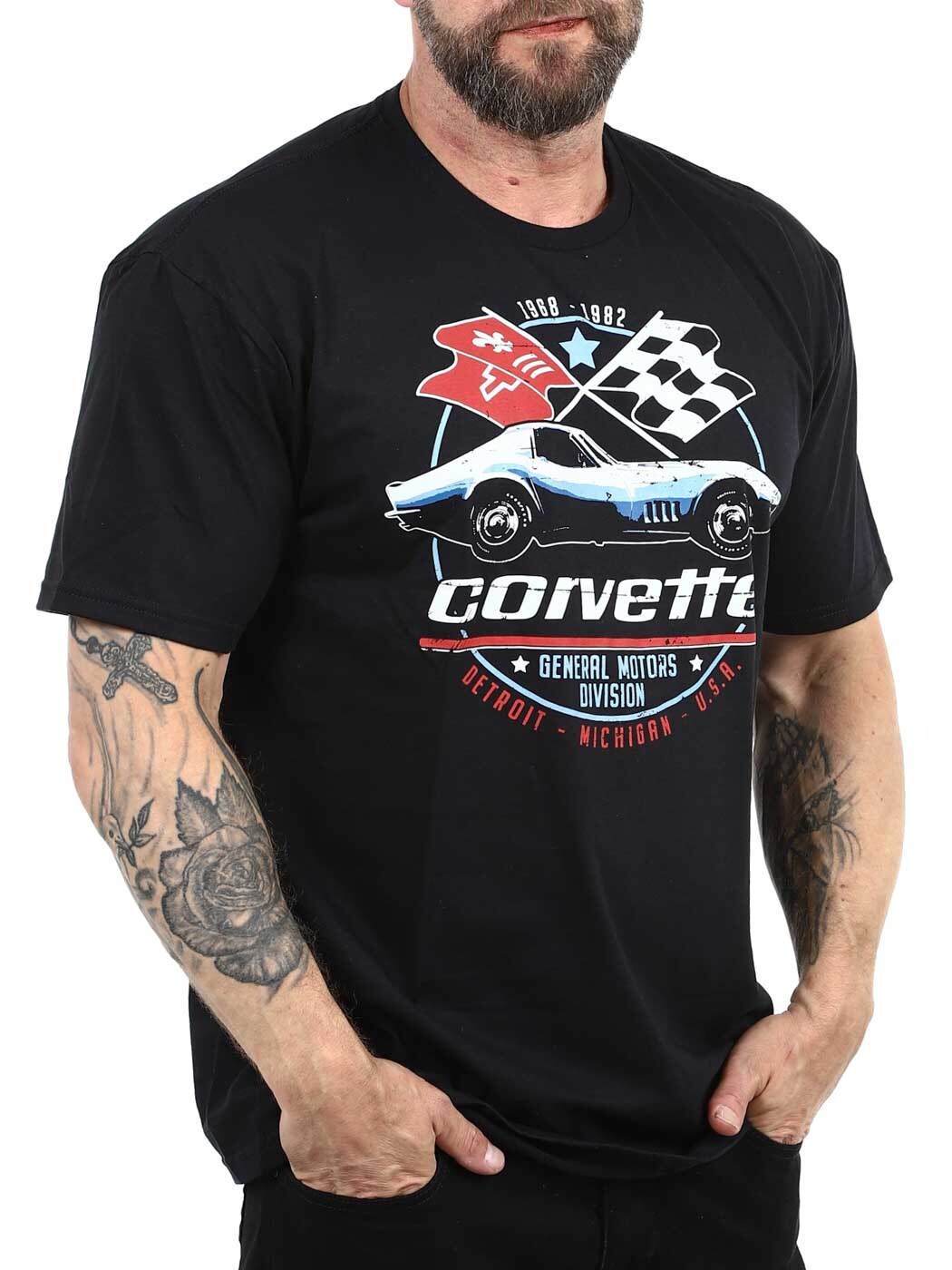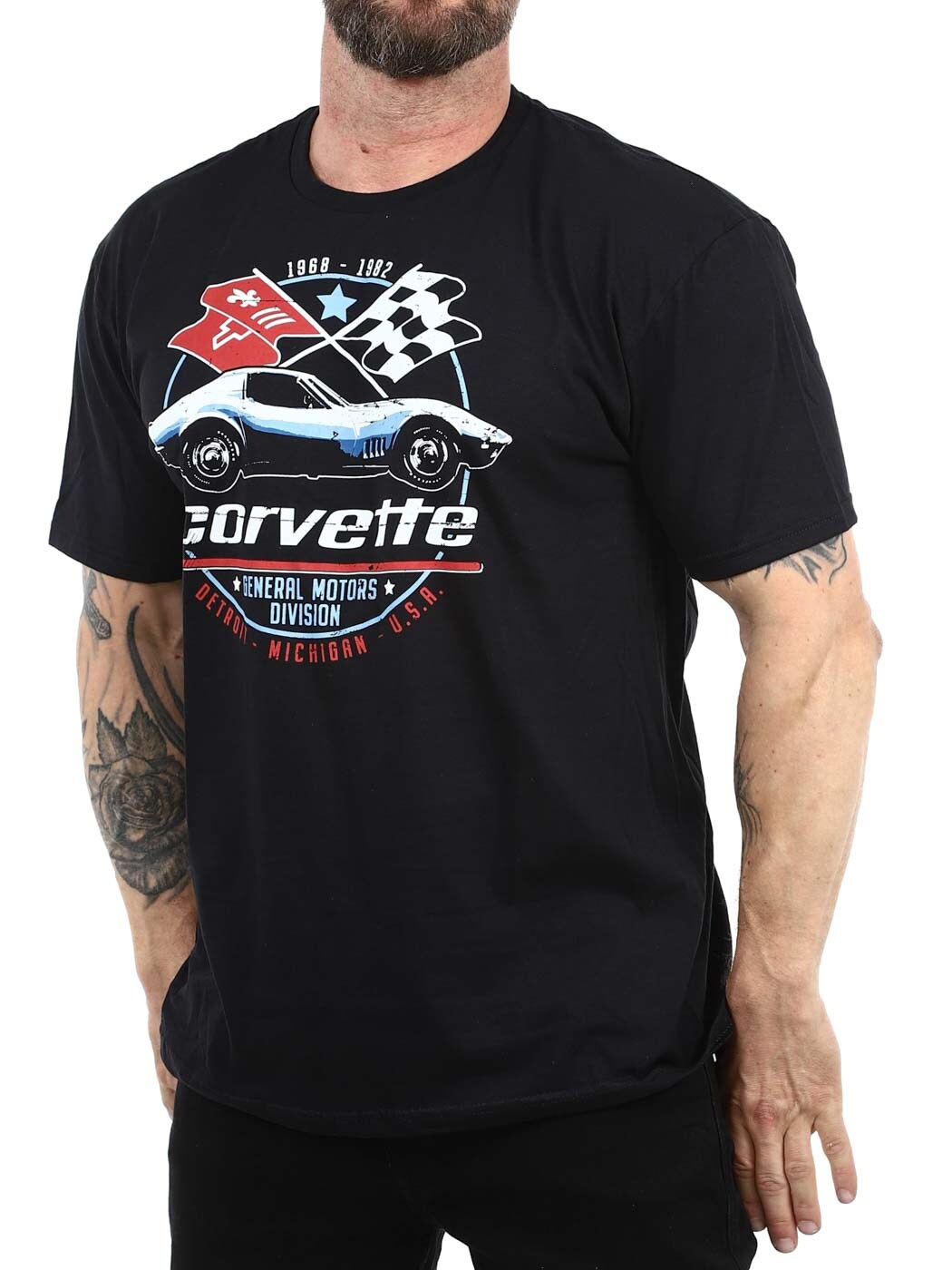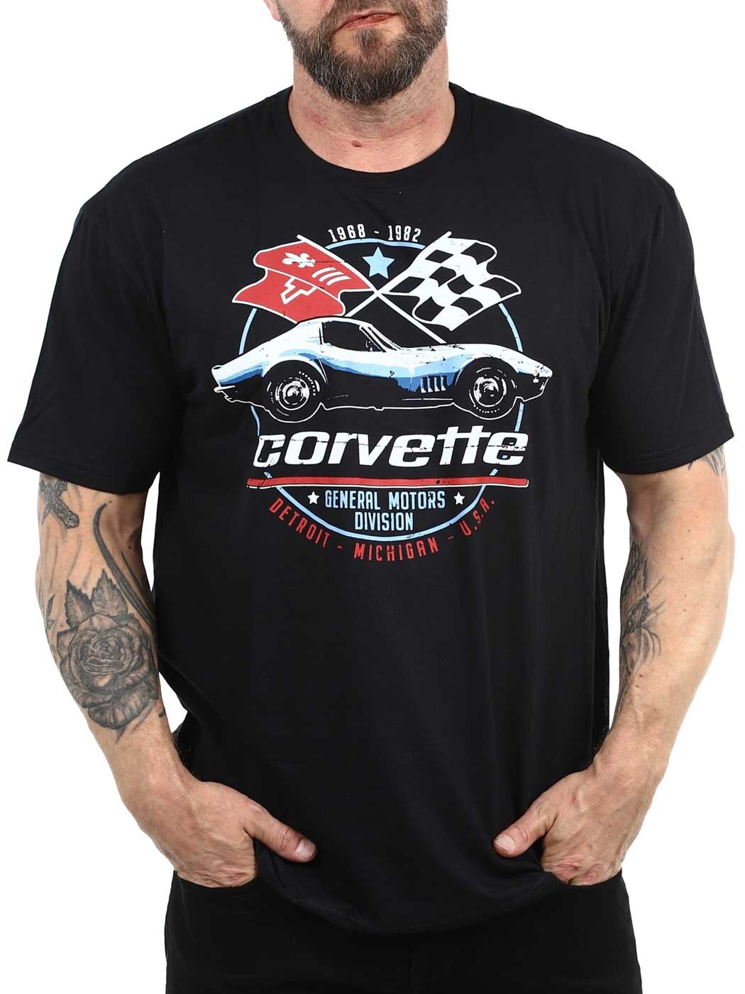 Musta T-paita, johon on painettu värikäs vintage-kuva klassisesta Corvetesta vuosilta 1968-1982. Ehdoton hankinta autoharrastajille, jotka haluavat ilmaista intohimonsa tyylillä!