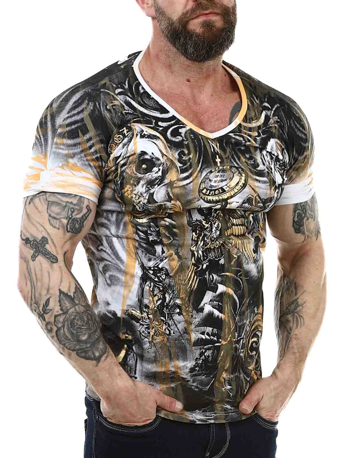 Valkopohjainen t-paita, jossa on kontrastivärinen painatus sekä edessä että takana. Kapea malli joustavasta ja mukavasta puuvillamateriaalista V-aukkosella pääntiellä.