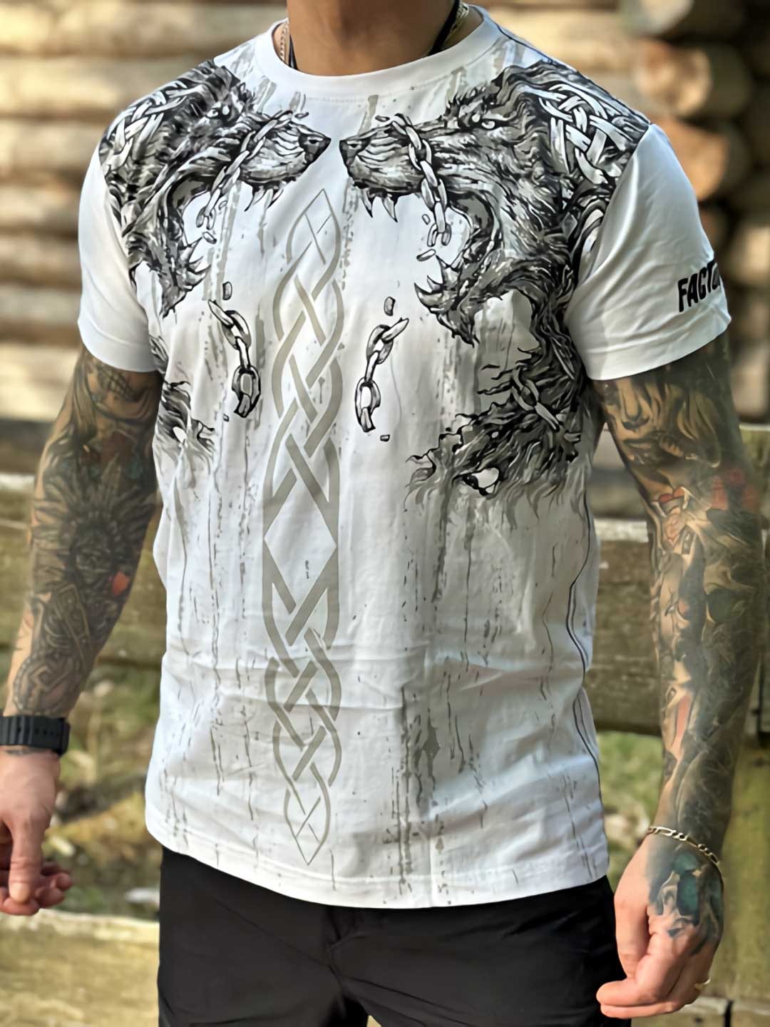 Ilmeikäs t-paita, jossa on suuret graafiset susikuviot, ketjuyksityiskohtia ja tribal-henkisiä painatuksia, jotka ulottuvat sekä etu- että takapuolelle. Täydellinen valinta sinulle, joka pidät rouheasta tyylistä ja haluat käyttää t-paitaa, joka herättää huomiota.