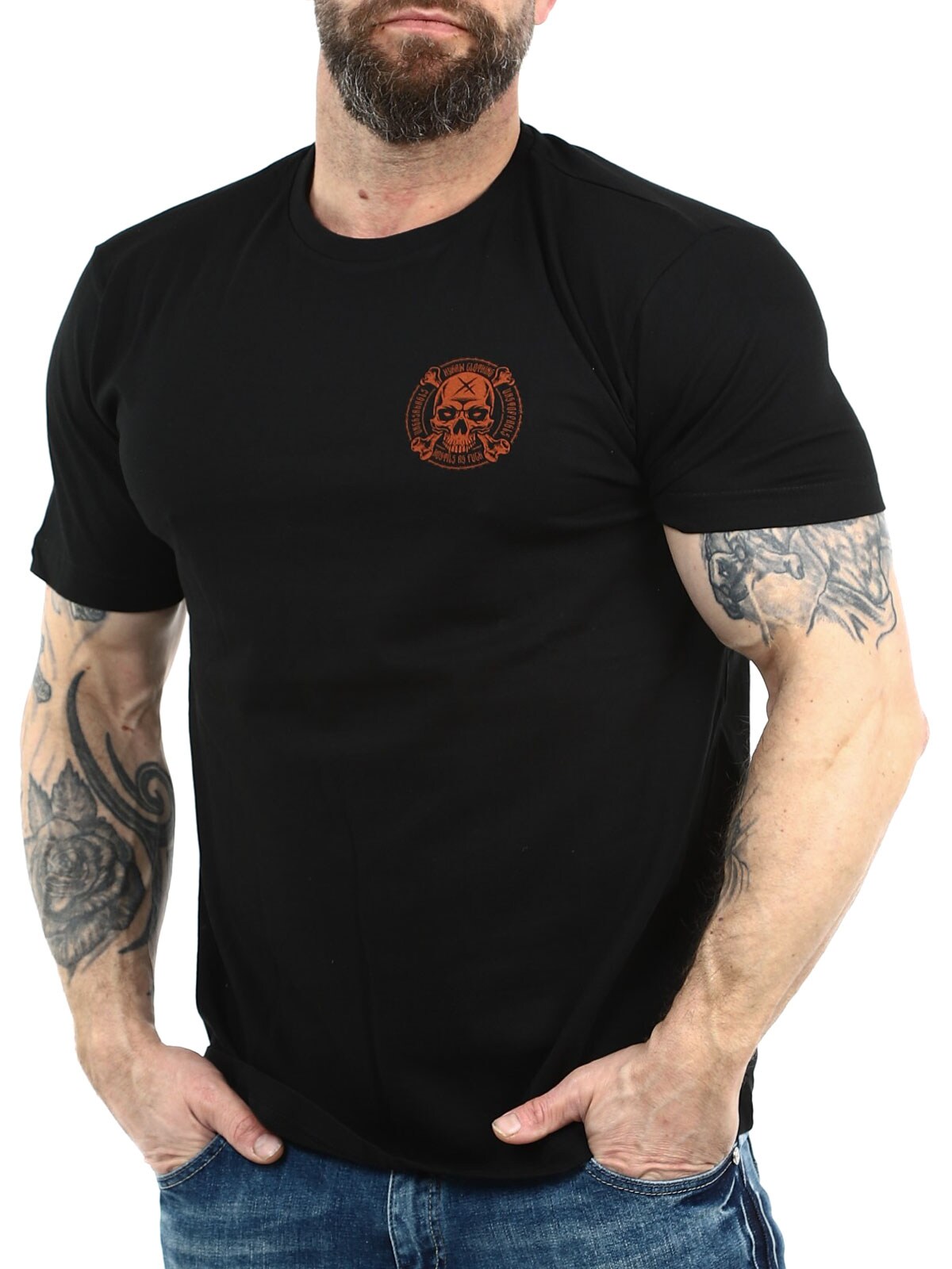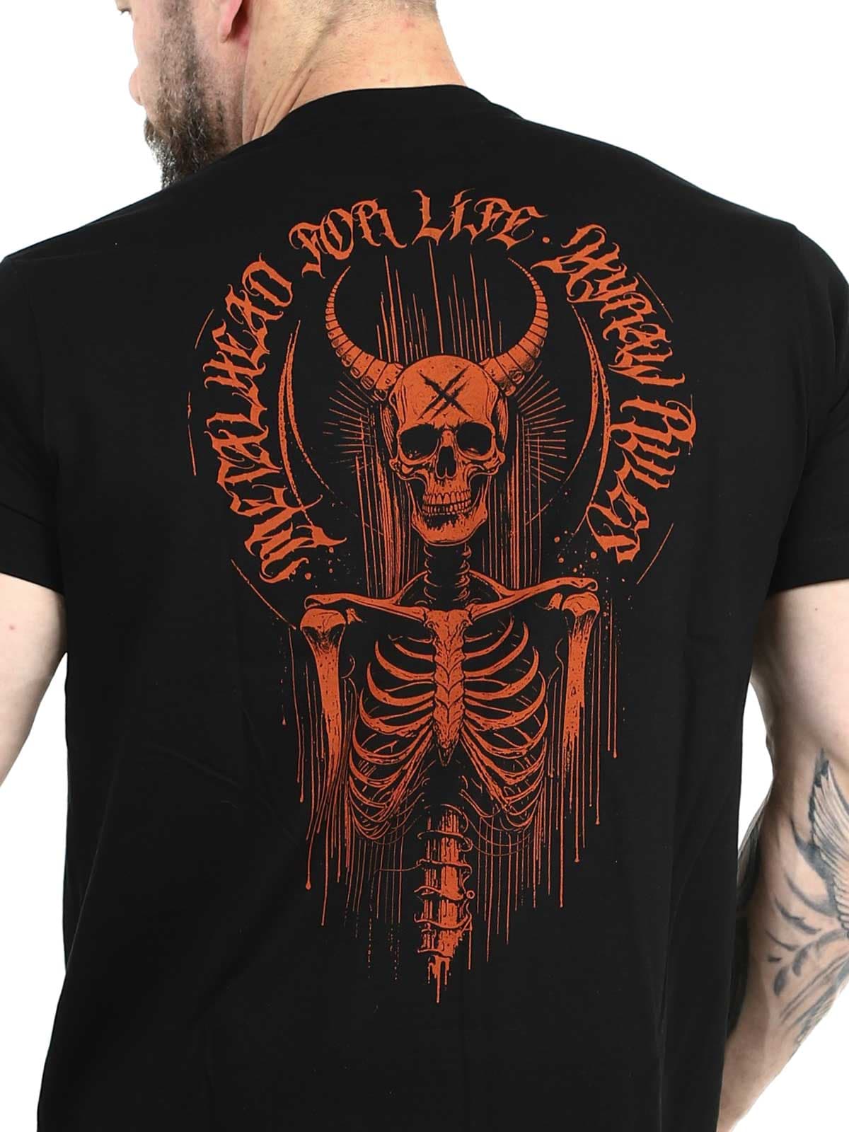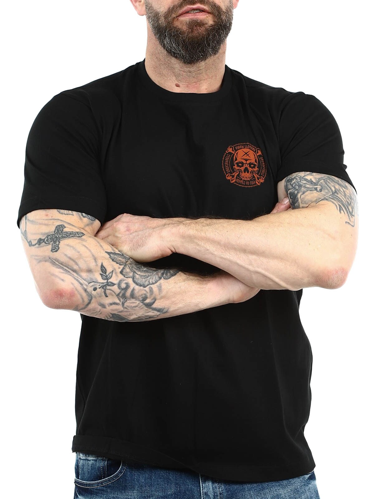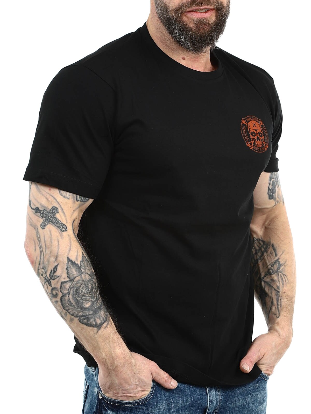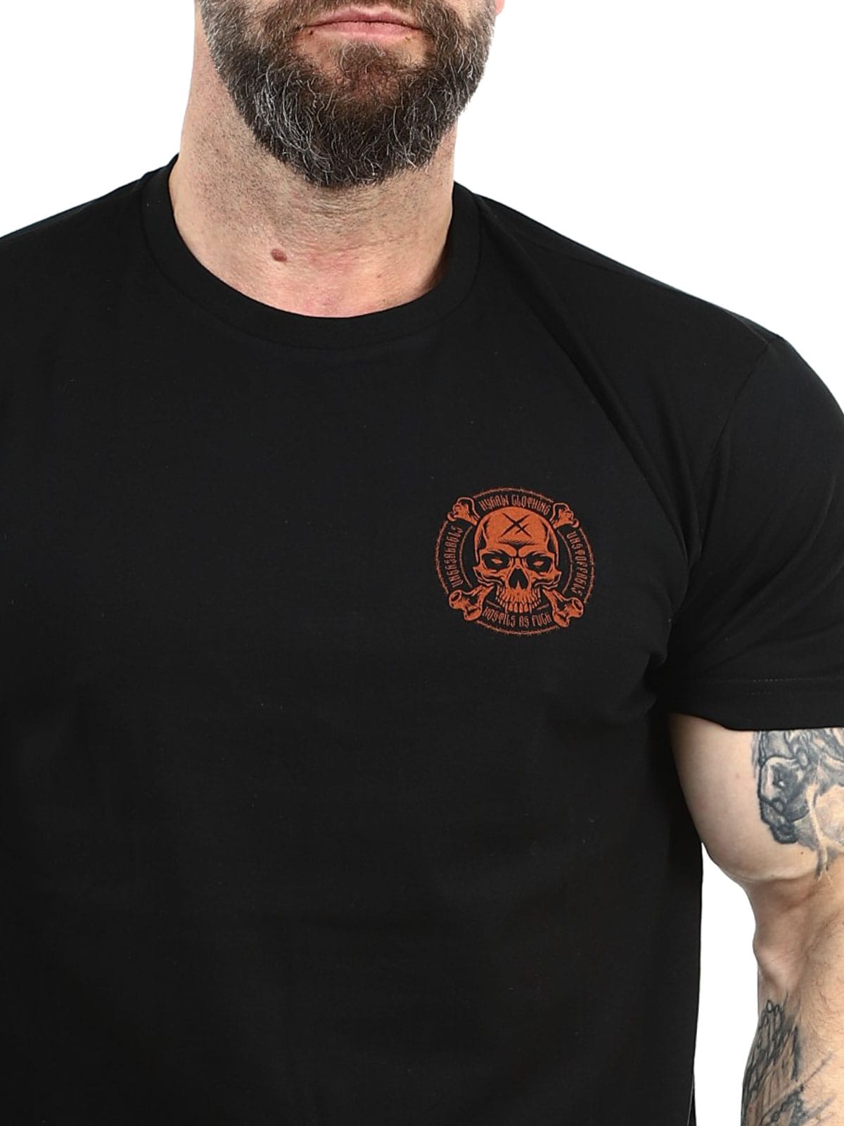 Musta T-paita suurella painatuksella edessä ja pienemmällä painatuksella takapuolella. Suora malli pyöreällä ja ribatulla kaula-aukolla. Valmistettu 100 % puuvillasta!