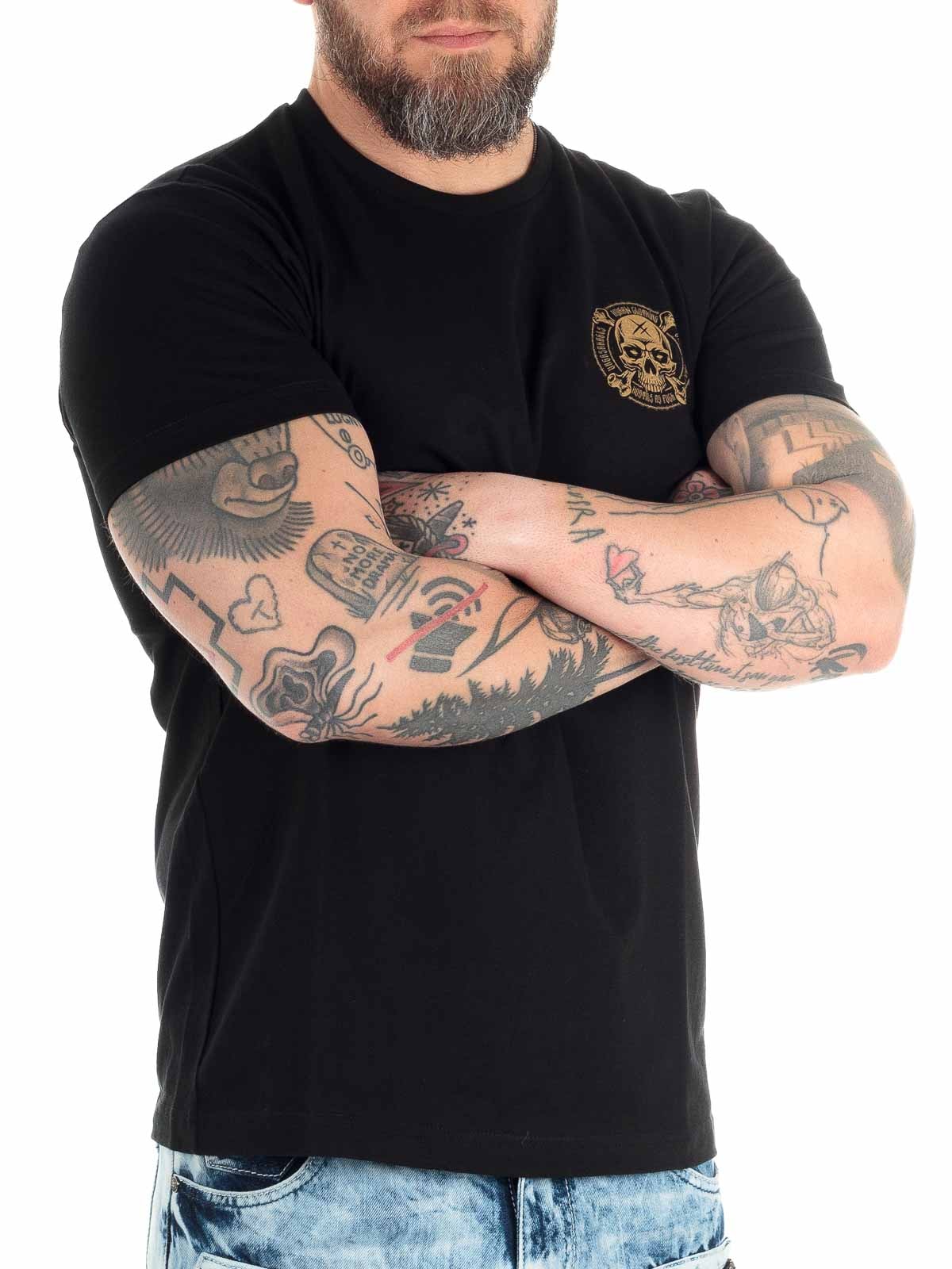 Musta T-paita suurella painatuksella edessä ja pienemmällä painatuksella takapuolella. Suora malli pyöreällä ja ribatulla kaula-aukolla. Valmistettu 100 % puuvillasta!