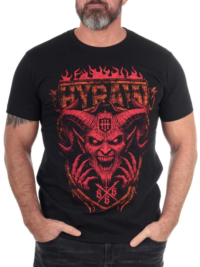 Hyraw Team Satan T-paita mustana on uhkarohkea osa vuoden 2025 talvimallistoa, jossa on tumma, taiteellinen painatus painettuna Ranskassa.