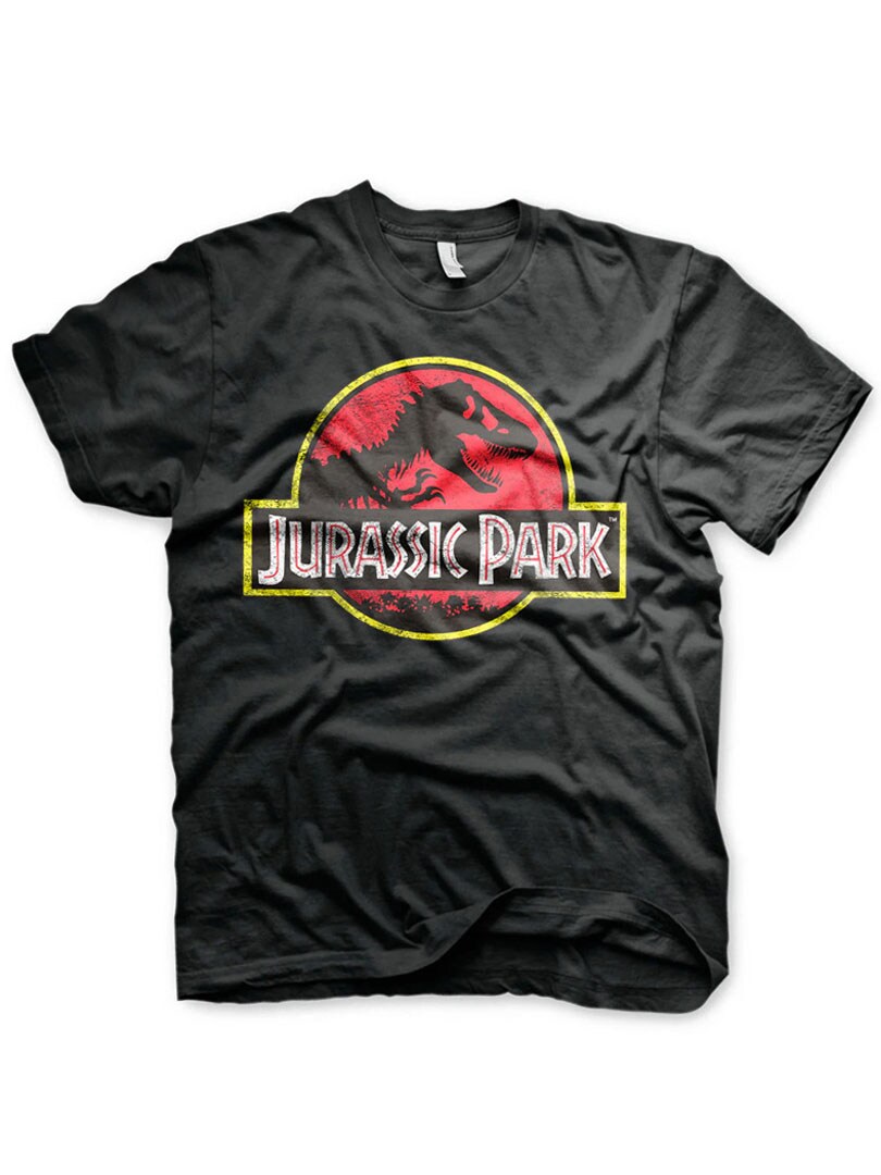 Musta t-paita, jossa on Jurassic Park -painatus edessä. T-paidassa on klassinen istuvuus ja pyöreä pääntie – täydellinen valinta seikkailun ja elokuvahistorian ystäville.