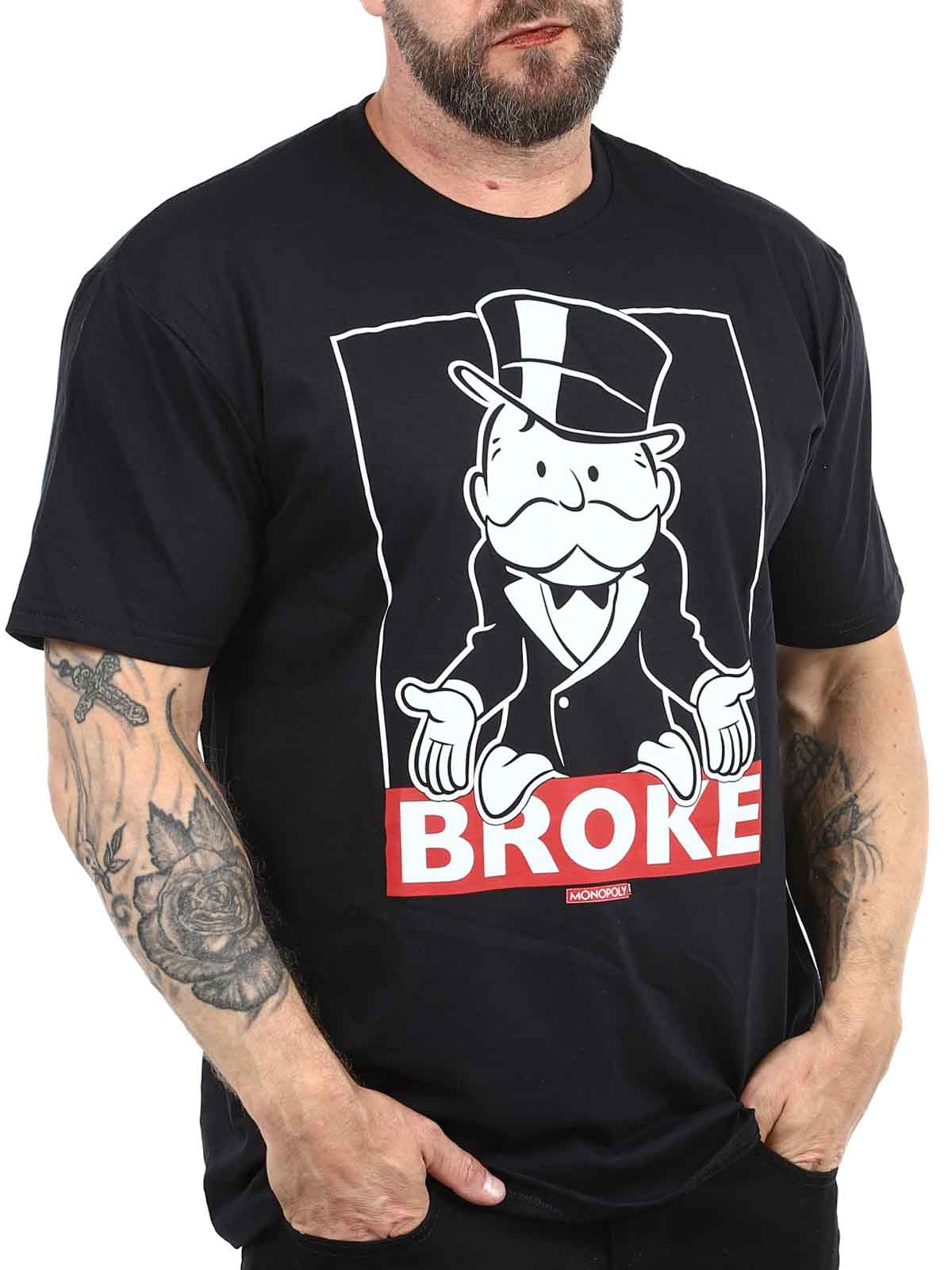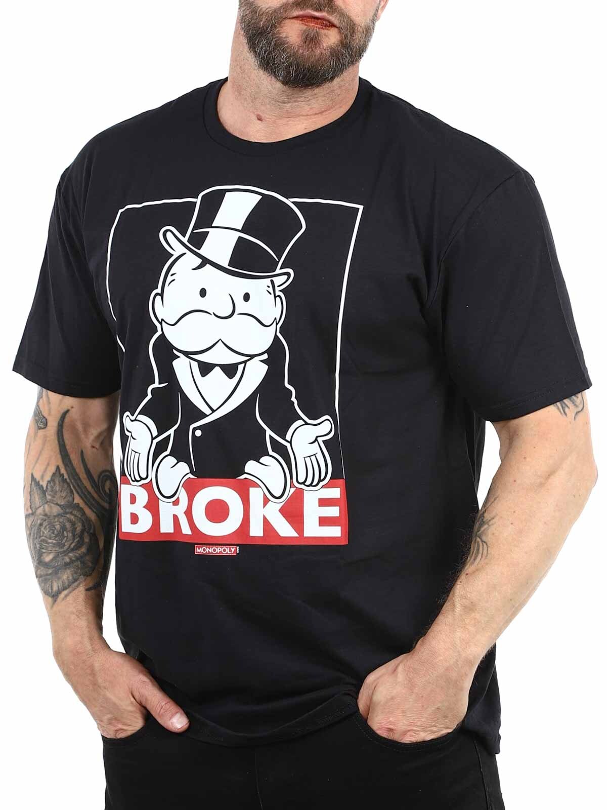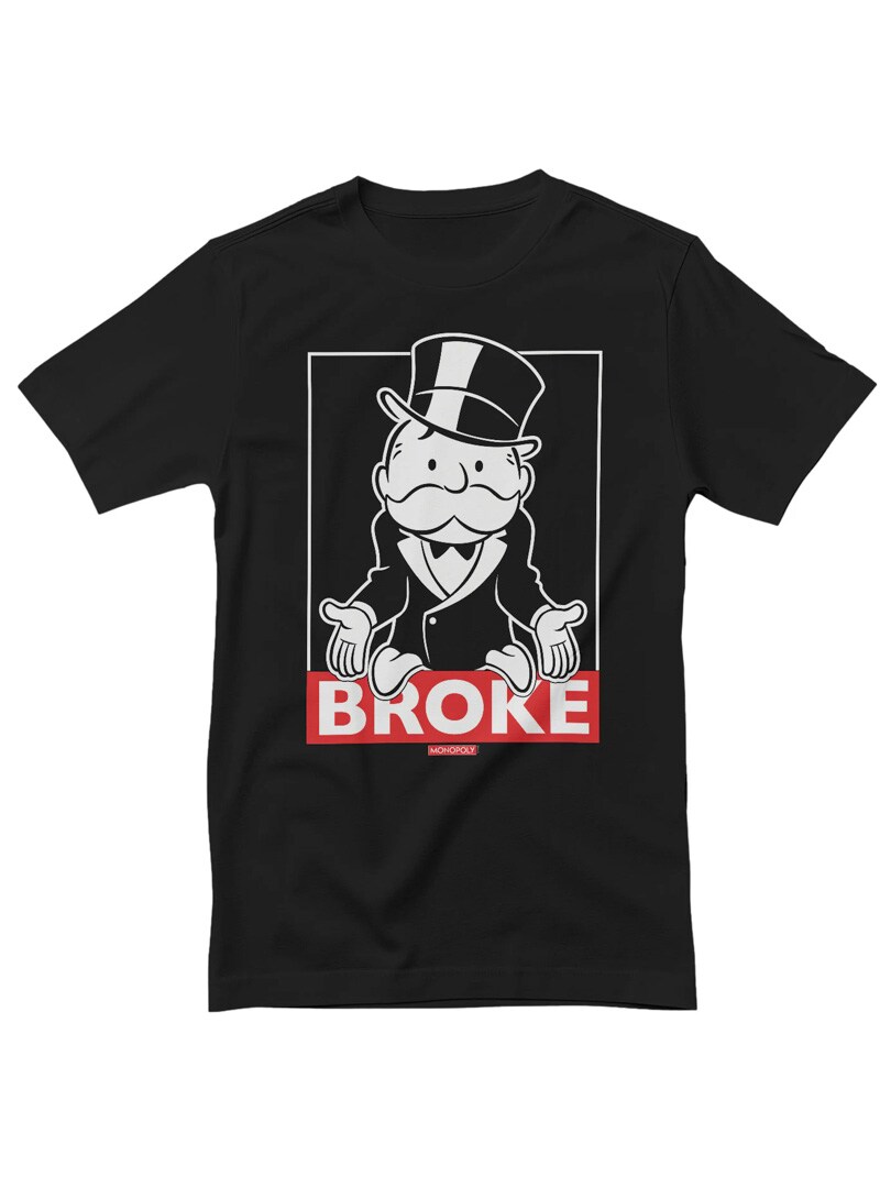 Musta T-paita, jossa esiintyy Mr. Monopoly klassisessa ”varaton"-asennossaan. Paidassa lukee teksti ”BROKE”, ja se suorastaan huokuu älykästä ja itseironista huumoria. Täydellinen vaate sekä lautapelifaneille että niille, jotka rakastavat terävää sarkasmia.