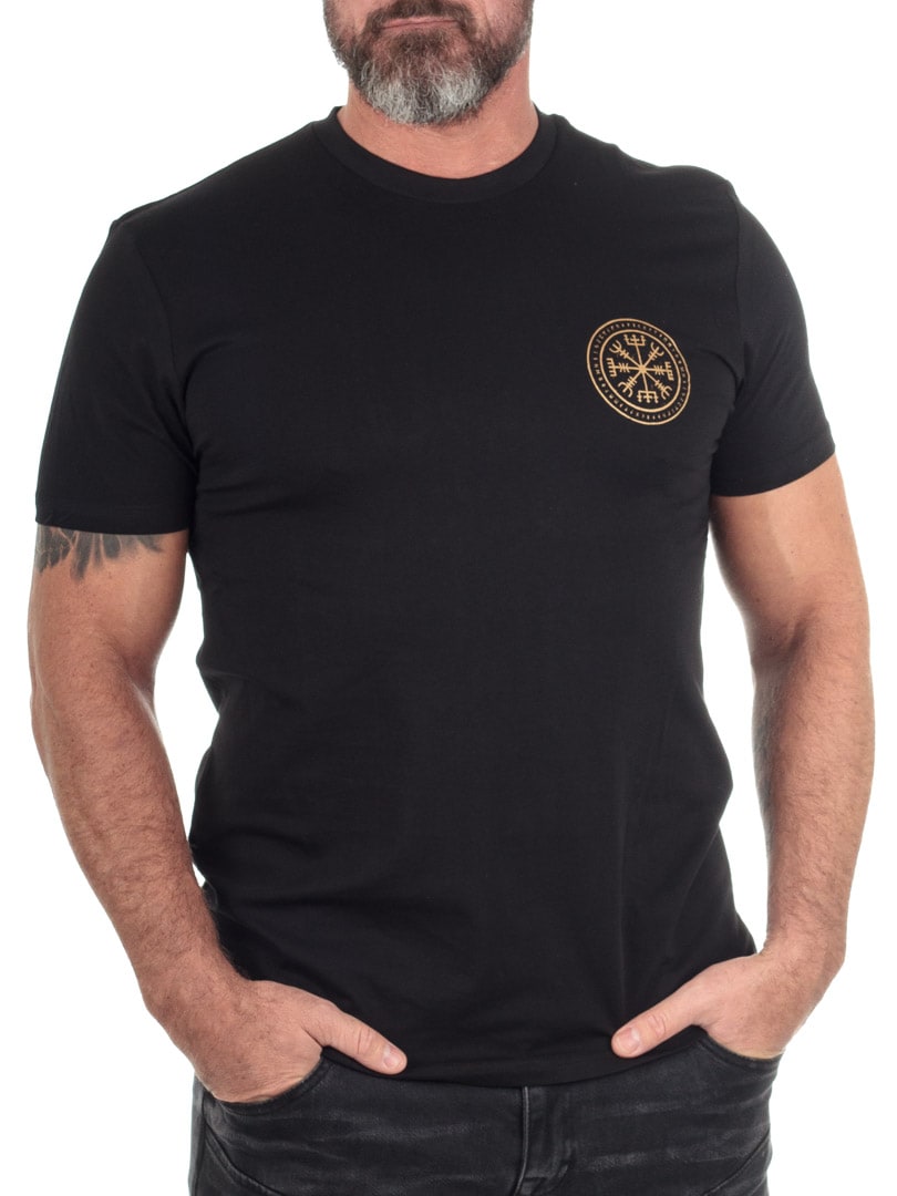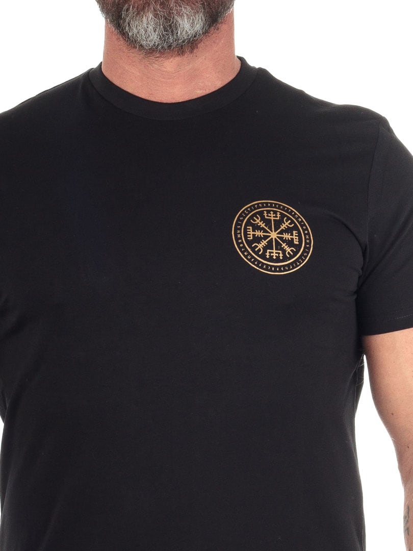 Tämä t-paita tarjoaa täydellisen tasapainon asenteen ja tyylin välillä yksityiskohtaisen muotoilunsa ansiosta. Selkää hallitsee suuri, huomiota herättävä Fenris-suden ja riimukompassin motiivi, kun taas rintaa koristaa pienempi, kullanvärinen symboli hillitymmän ilmeen luomiseksi edestäpäin. Paidassa on klassinen istuvuus ja ribattu, pyöreä pääntie, mikä tekee siitä mukavan päällä. Se on valmistettu 100 % puuvillasta ja on ostettavissa vain RockDenimiltä.