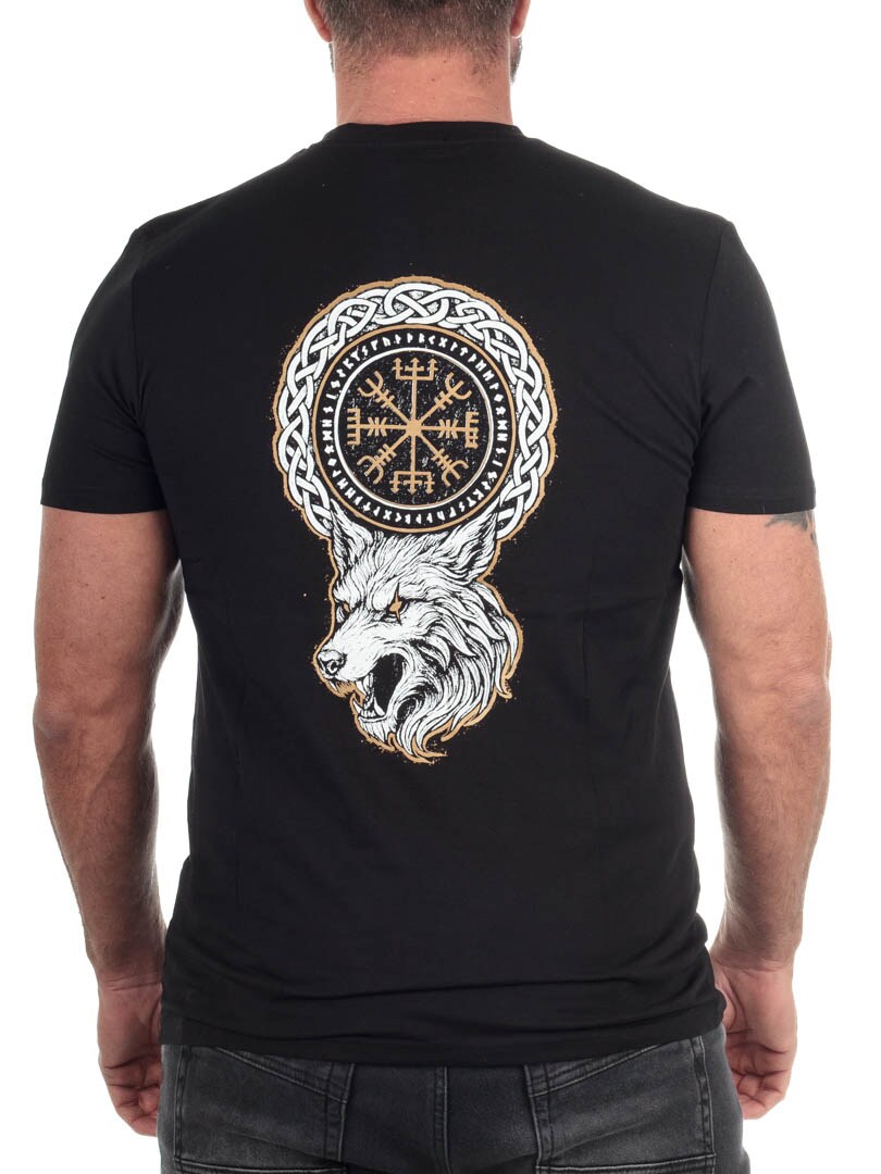 RockDenim RD Fenris T-paita mustana on mukava puuvillapaita, joka erottuu voimakkaalla viikinkivaikutteisella susipainatuksella.
