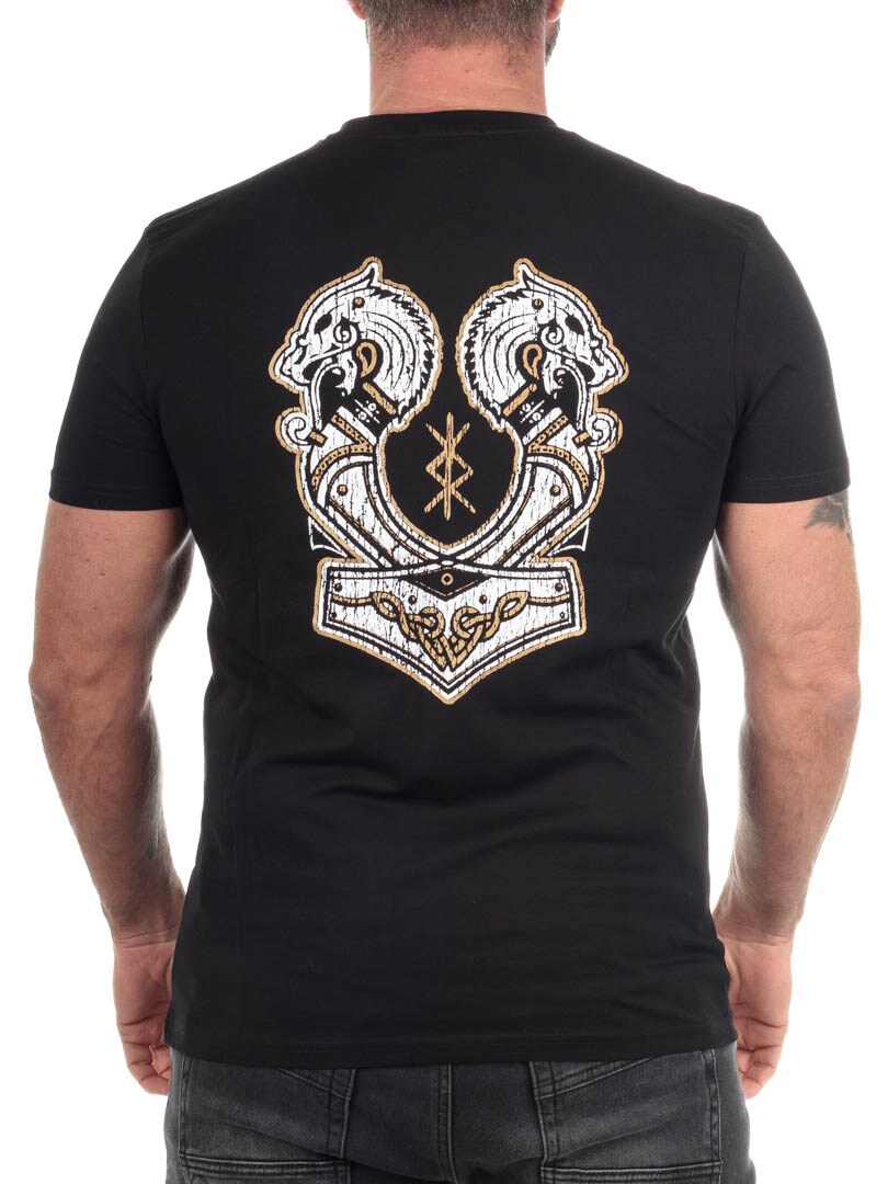 Tämä t-paita tarjoaa täydellisen tasapainon asenteen ja tyylin välillä harkitun muotoilunsa ansiosta. Selkää hallitsee suuri, huomiota herättävä lohikäärmeenpäiden ja Mjölnerin motiivi, kun taas rintaa koristaa hienovarainen kultainen riimu hillitymmän etupuolen ilmeen saamiseksi. Paidassa on klassinen istuvuus ja ribbattu, pyöreä pääntie, mikä tekee siitä mukavan käyttää koko päivän. Se on valmistettu 100% puuvillasta ja on saatavilla vain RockDenimiltä.