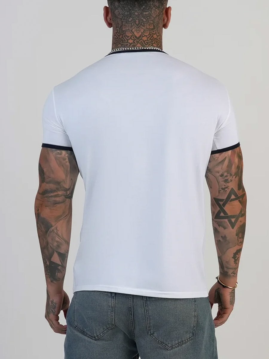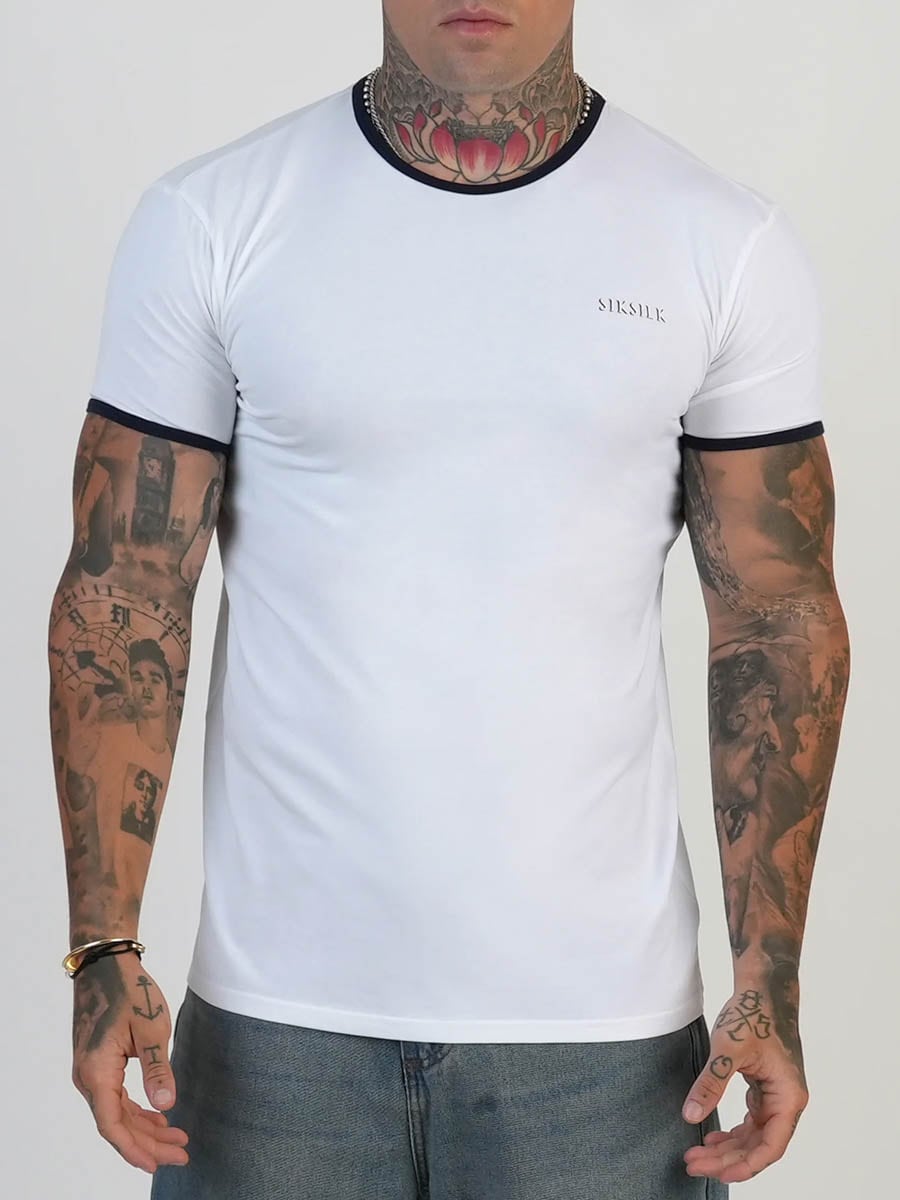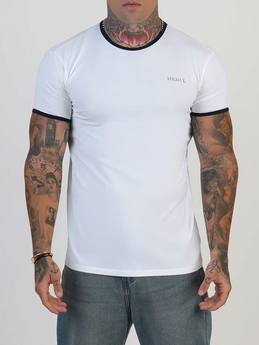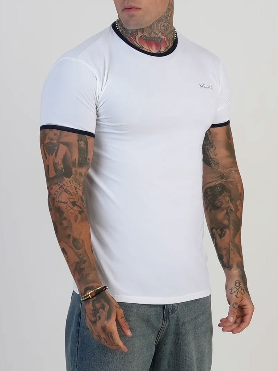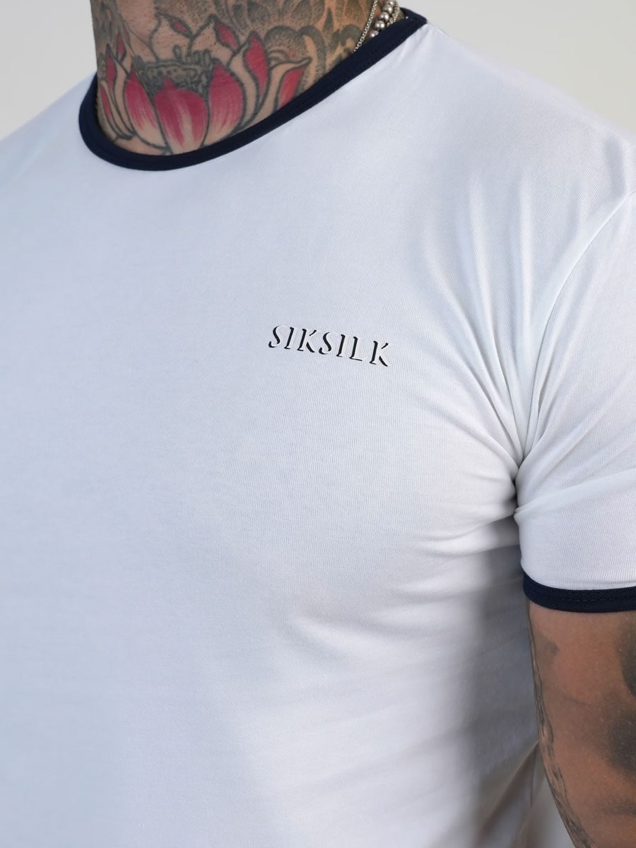 Valkoinen tyylikäs t-paita tummansinisillä yksityiskohdilla. Paidassa on pyöreä pääntie ja logo rinnassa, joka tuo modernin ja eksklusiivisen ilmeen. Valmistettu pehmeästä ja joustavasta materiaalista, joka tekee paidasta mukavan koko päivän käytössä.