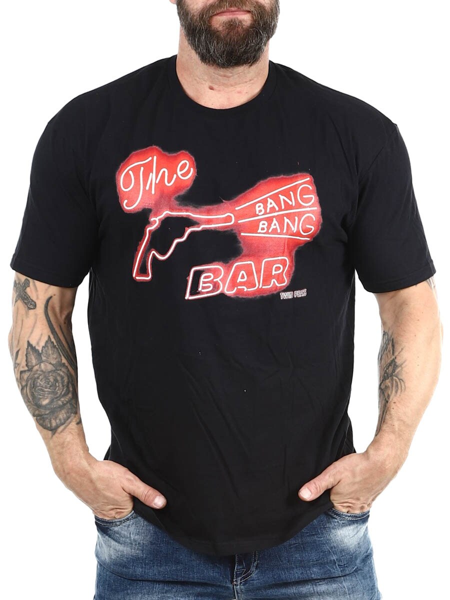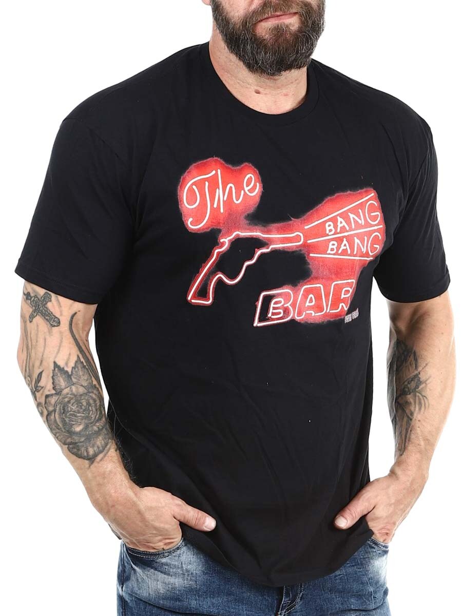 Musta t-paita, jossa on retrohenkinen neonpainatus esittämässä revolveria ja tekstiä “The Bang Bang Bar”. Valmistettu pehmeästä puuvillasta, joka takaa mukavan istuvuuden – täydellinen valinta vintage-tyylistä ja asenteesta pitäville.