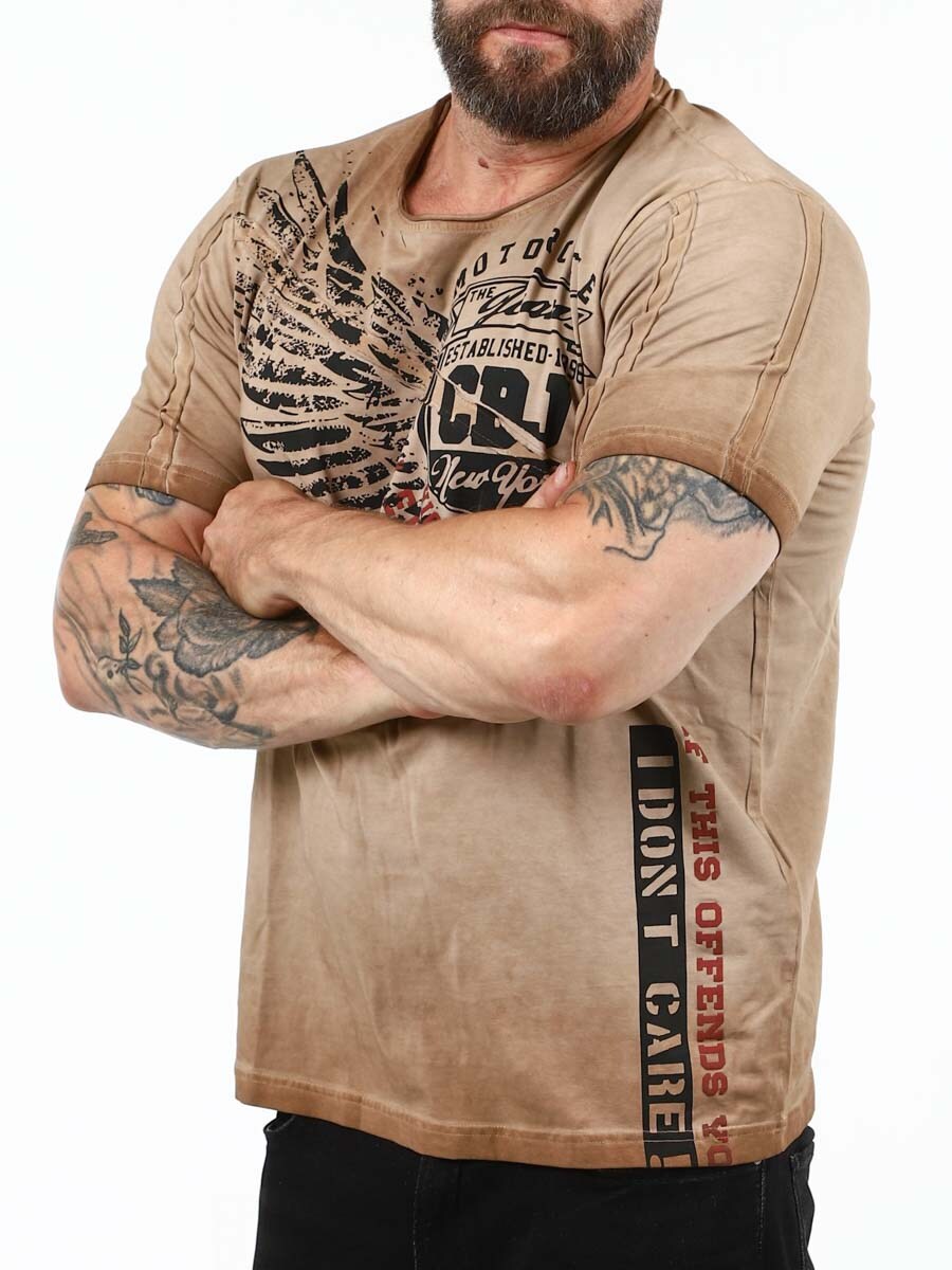 Tyylikäs T-paita, jossa on pyöreä kaula-aukko ja viimeistelemättömät reunat. Siinä on tyylikäs painatus, joka huokuu itsevarmuutta ja kapinallista asennetta. Valmistettu pehmeästä ja joustavasta materiaalista.