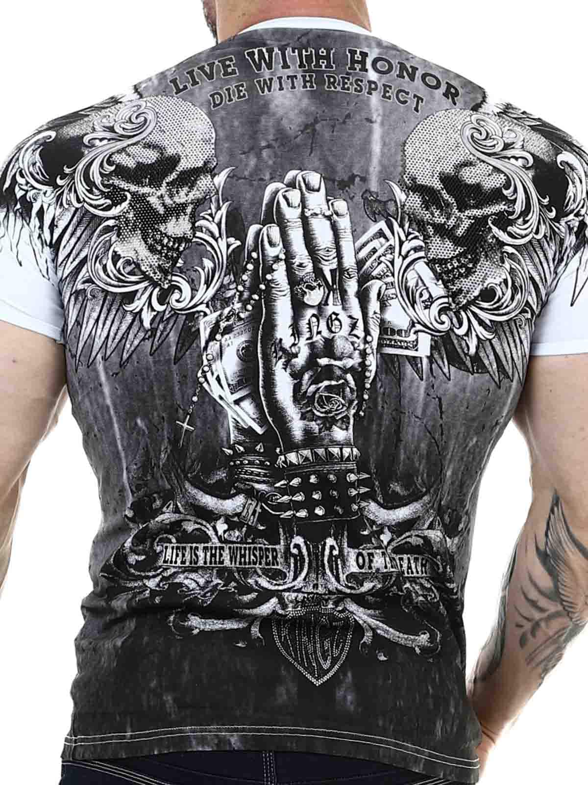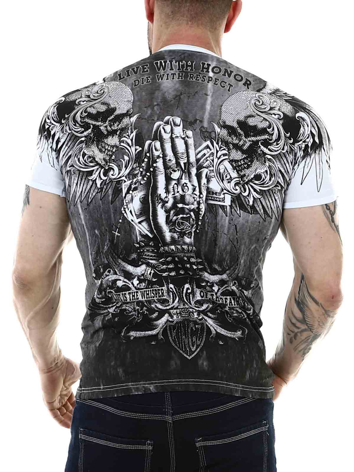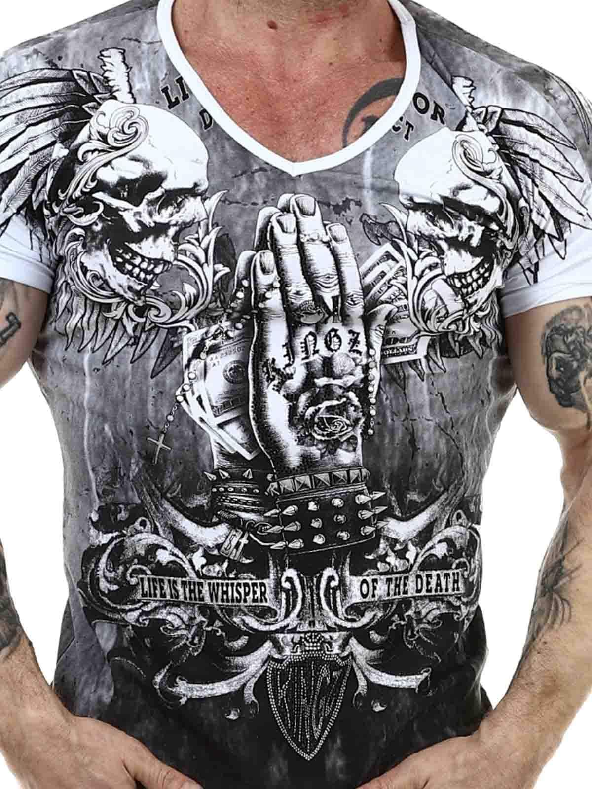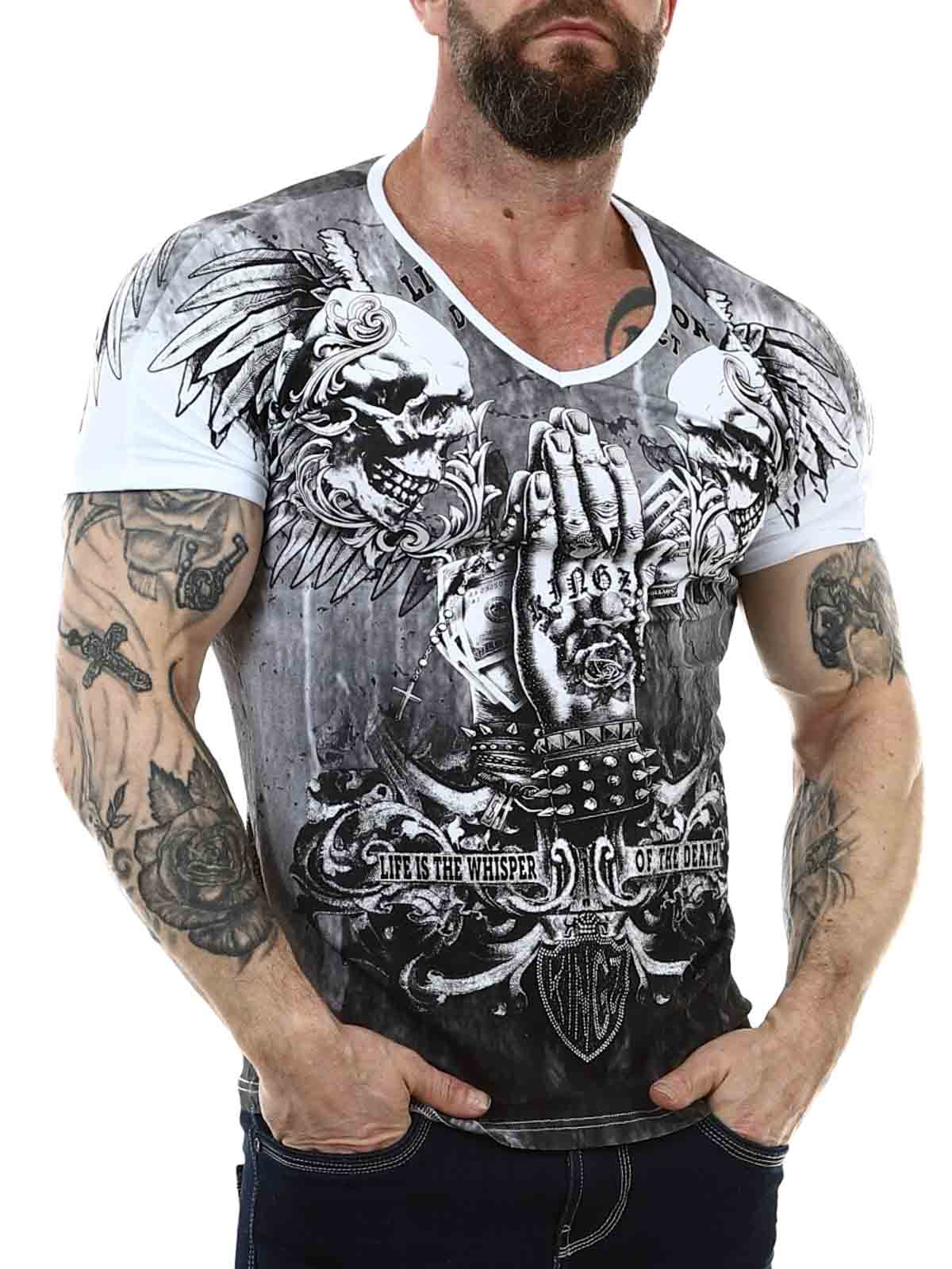 Valkoinen V-aukkoinen t-paita mukavasta puuvillamateriaalista, jossa on hieman joustoa. Rokkityylinen musta–hopea printti koristaa sekä etu- että takapuolta. Strassikivet korostavat kuvion ilmettä useissa kohdissa.