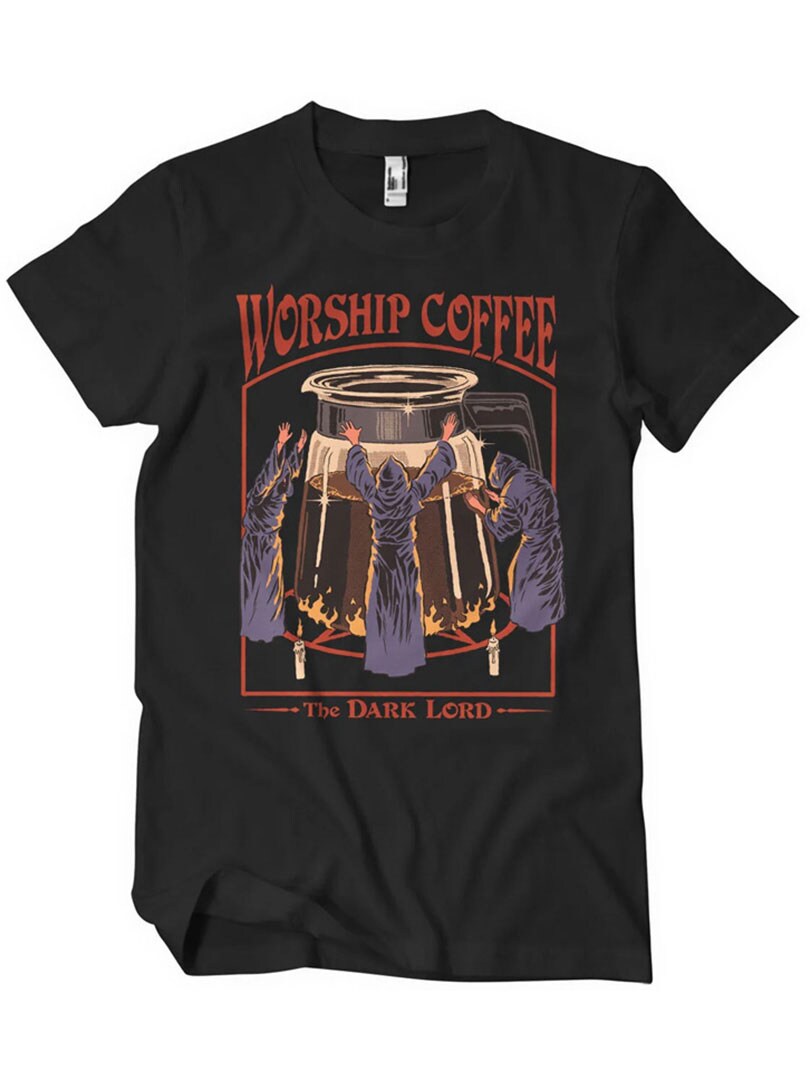 Musta t-paita, jossa on painatus edessä ja teksti Worship Coffee. Leikkisän synkkä design, joka sopii täydellisesti huumorintajuisille kahvin ystäville. T-paidassa on klassinen istuvuus ja pyöreä pääntie, joka takaa mukavuuden arjessa.
