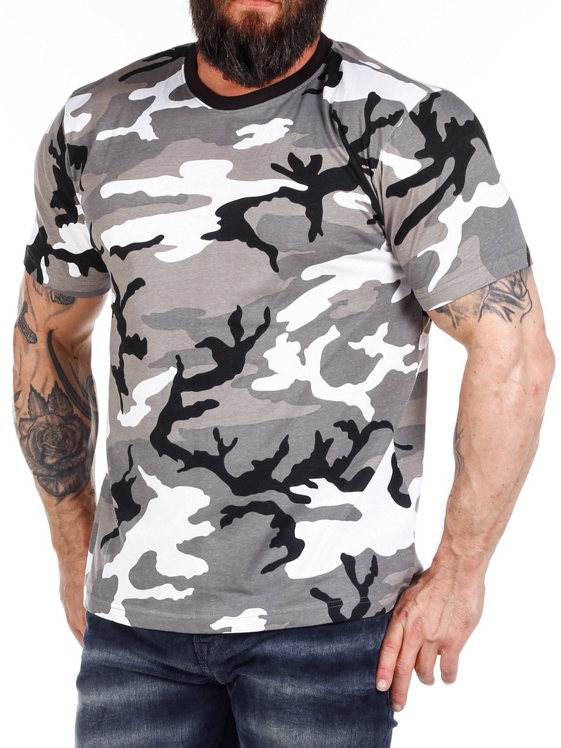 Tyylikäs T-paita armeijahenkisellä kuviolla, jossa on mustaa, beigeä, harmaata ja valkoista. Pyöreä kaula-aukko mustalla ja joustavalla reunuksella. Tämä T-paita soveltuu loistavasti yhdistettäväksi mustiin farkkuihin!