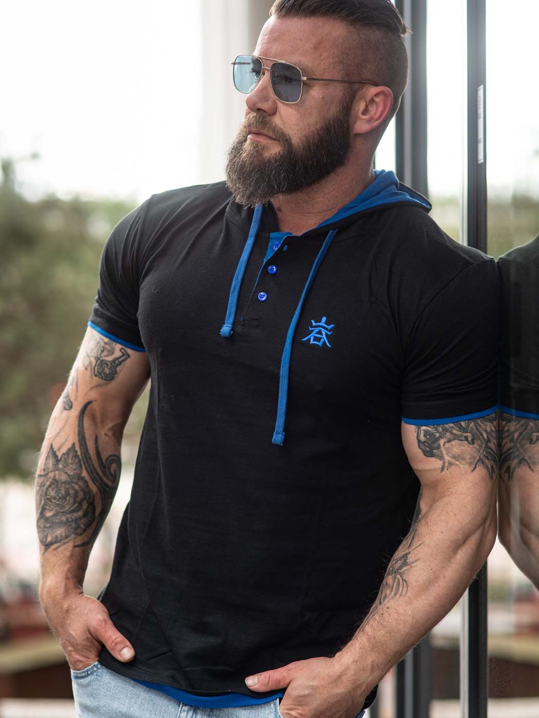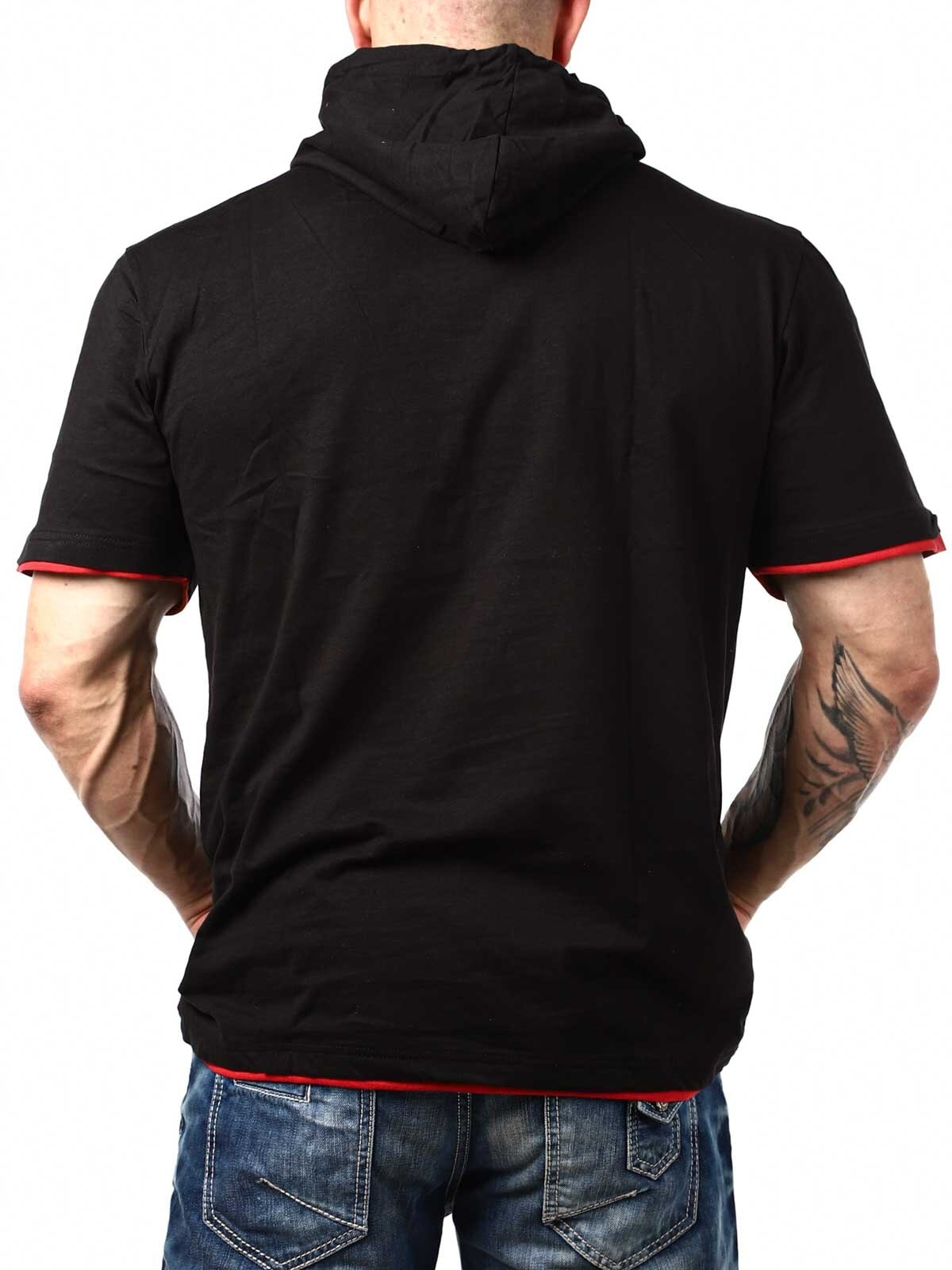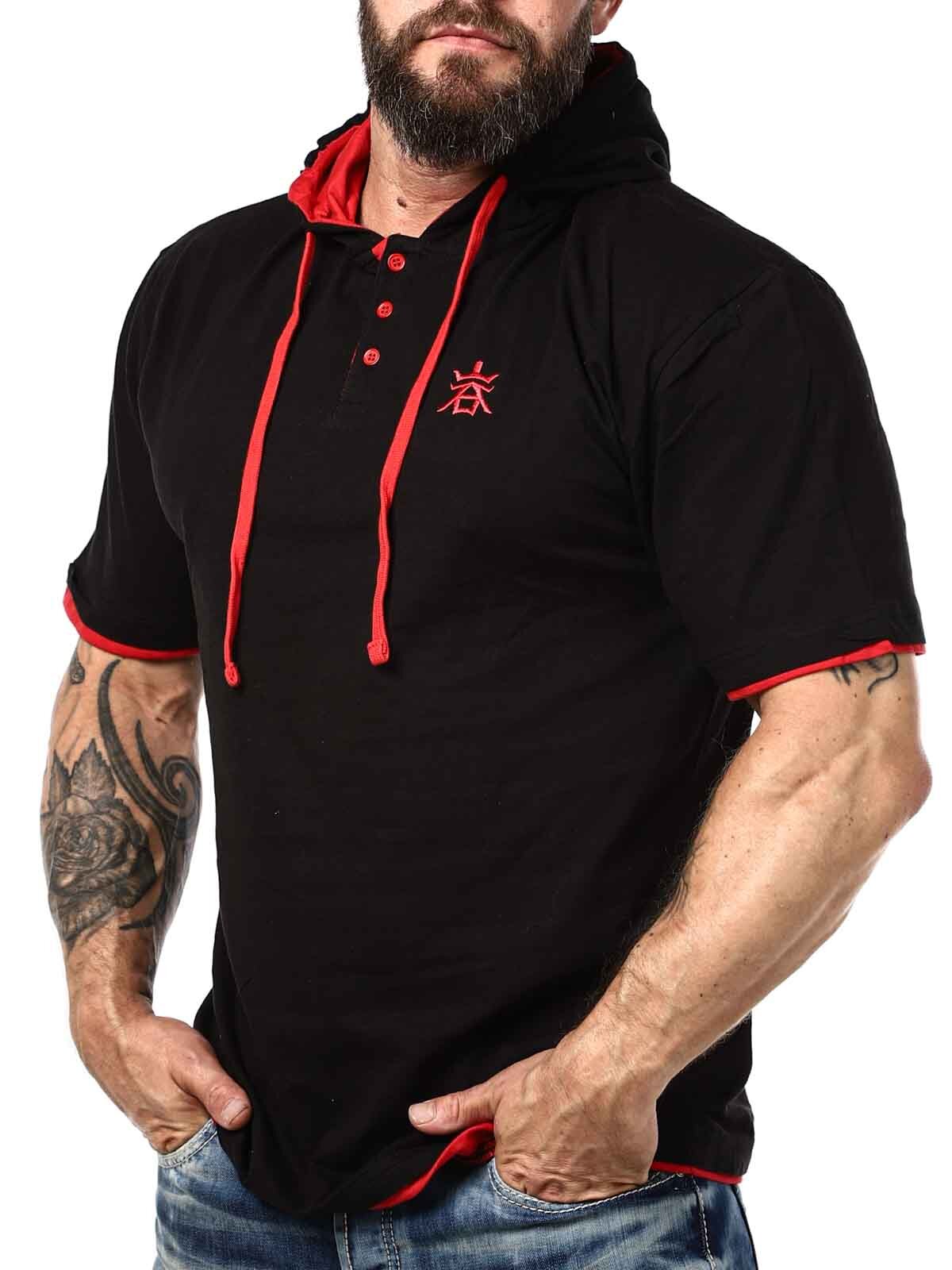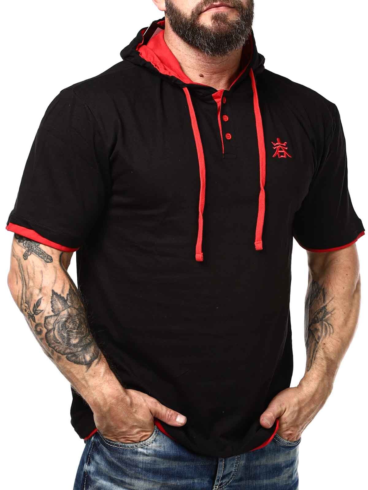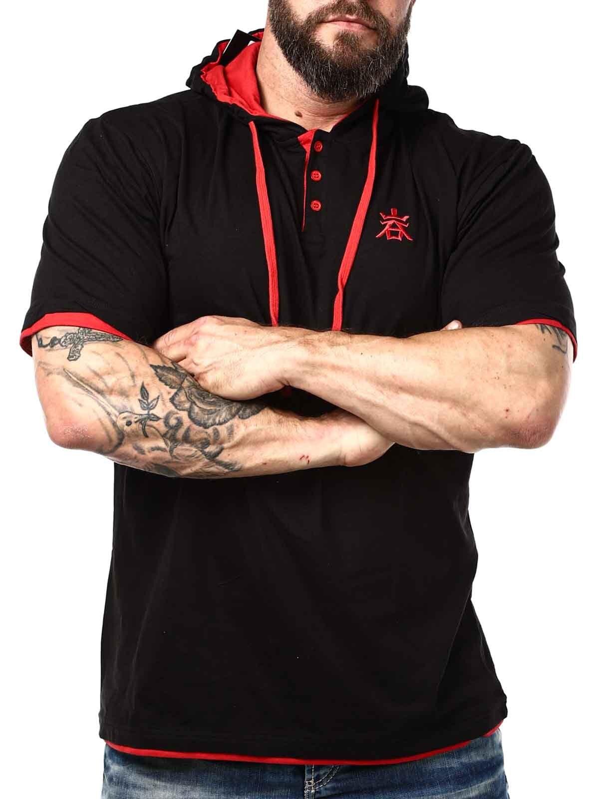 Musta T-paita punaisilla yksityiskohdilla. Paita on malliltaan klassinen, ja siinä huppu ja etupuolella napit kaula-aukossa. Tämän ainutlaatuisen T-paidan löydät vain RockDenimiltä!