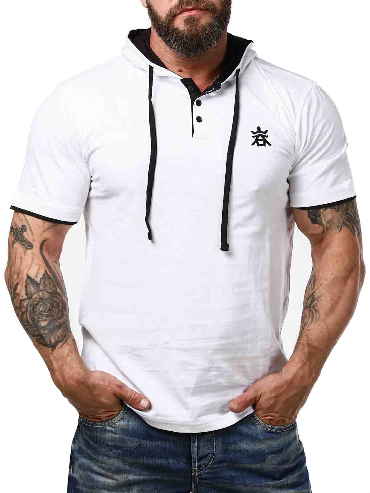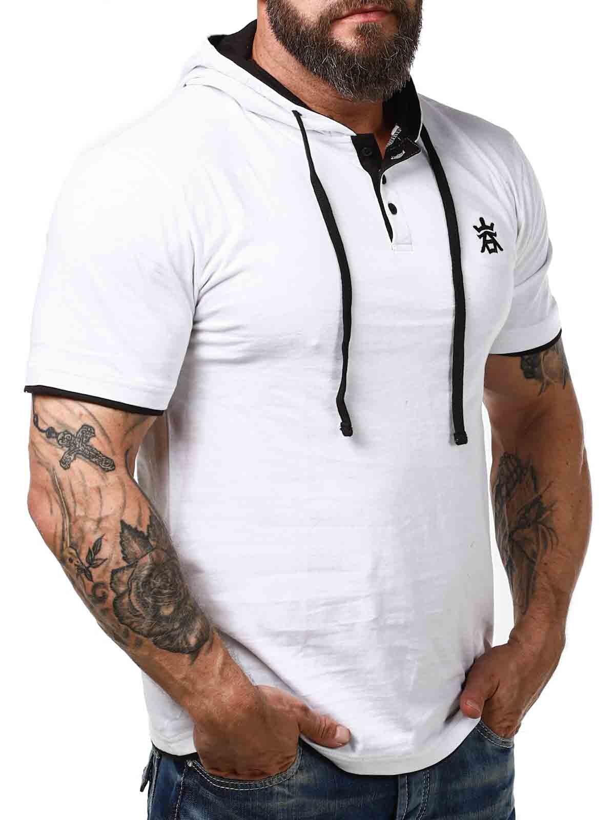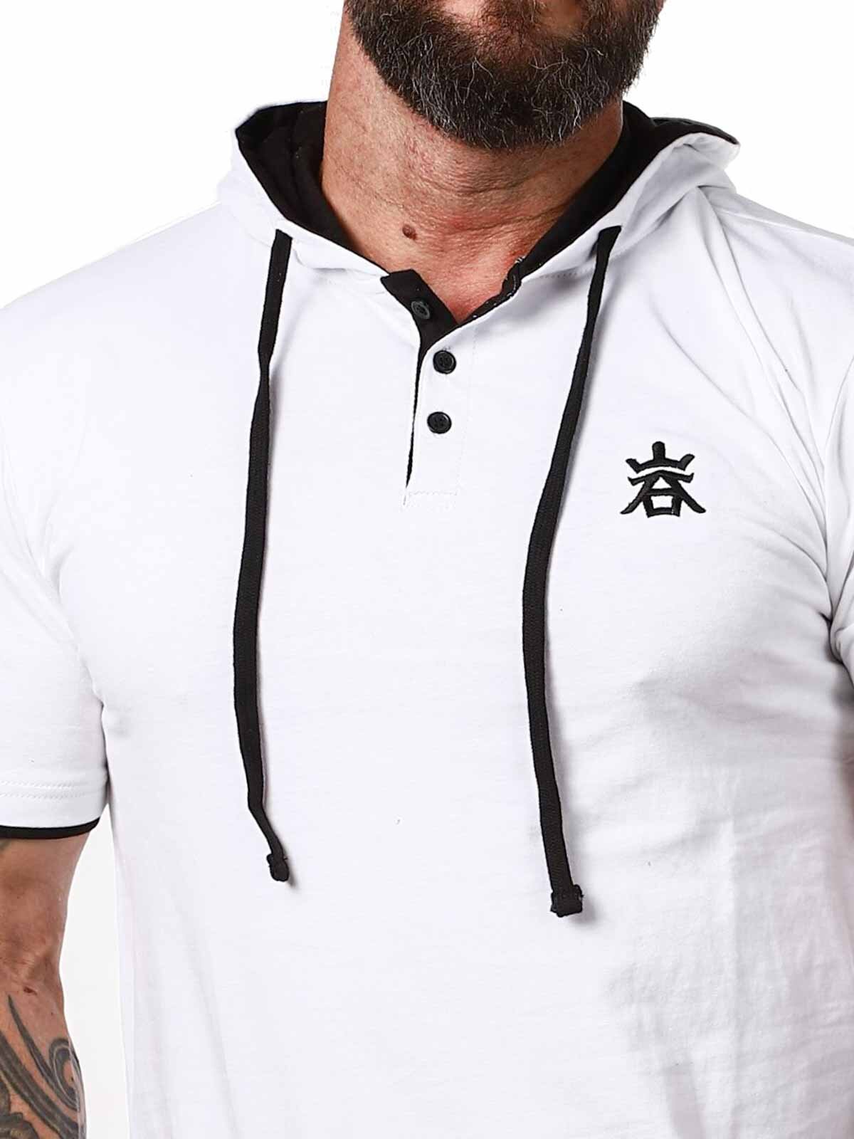 Valkoinen T-paita mustilla yksityiskohdilla. Paita on malliltaan klassinen, ja siinä huppu ja etupuolella napit kaula-aukossa. Tämän ainutlaatuisen T-paidan löydät vain RockDenimiltä!