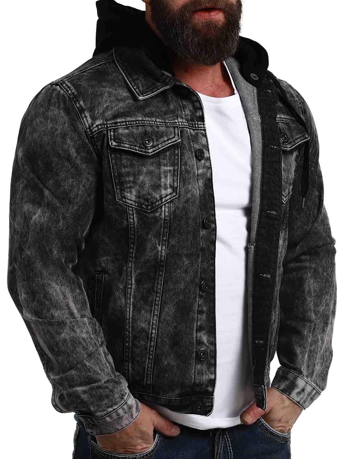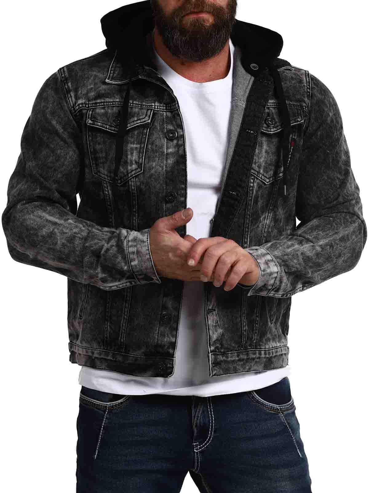 Kivipestystä farkkukankaasta valmistettu takki, jossa on huppu collegemateriaalista. Takissa on kaksi napillista rintataskua ja kaksi avointa sivutaskua. Huppu voidaan irrottaa!