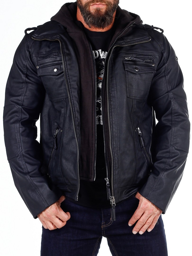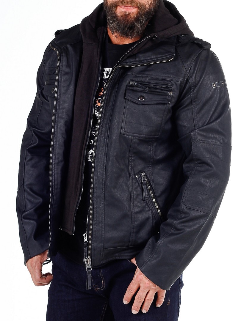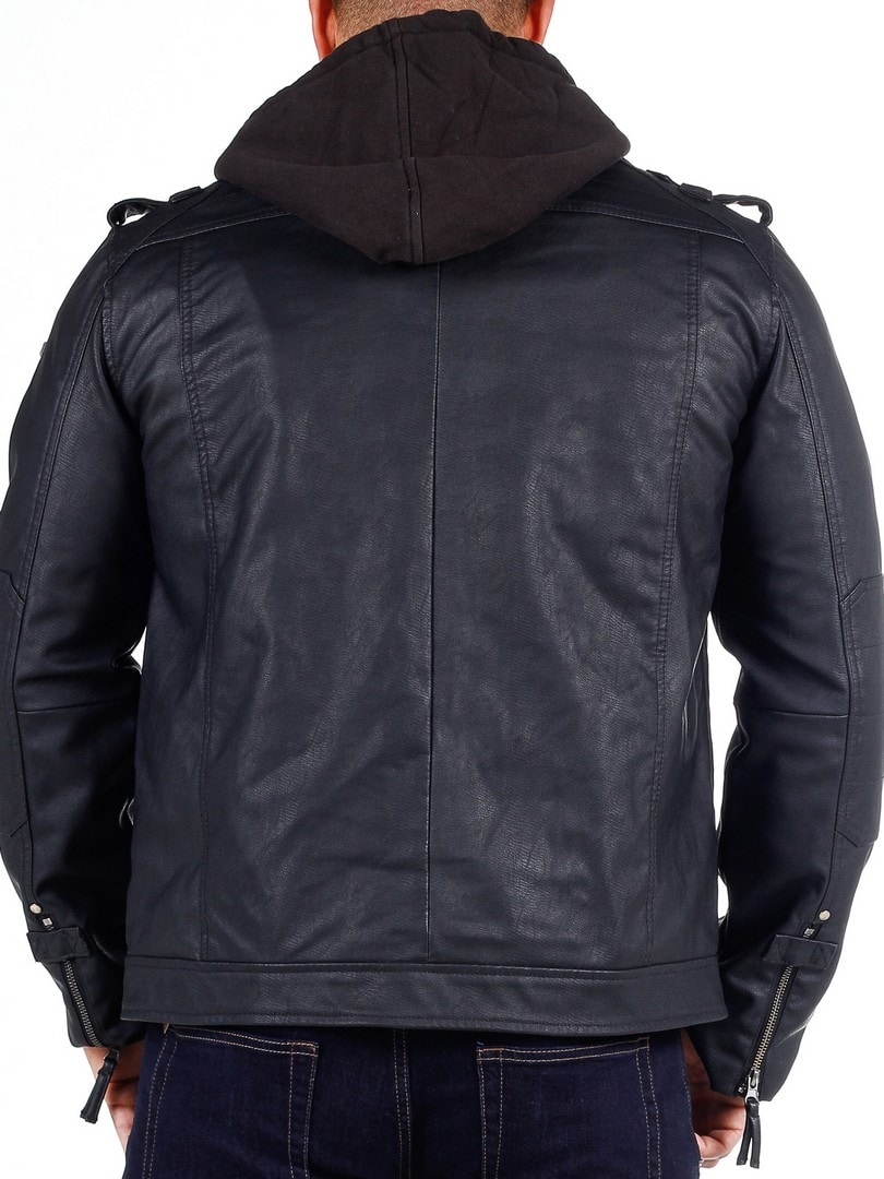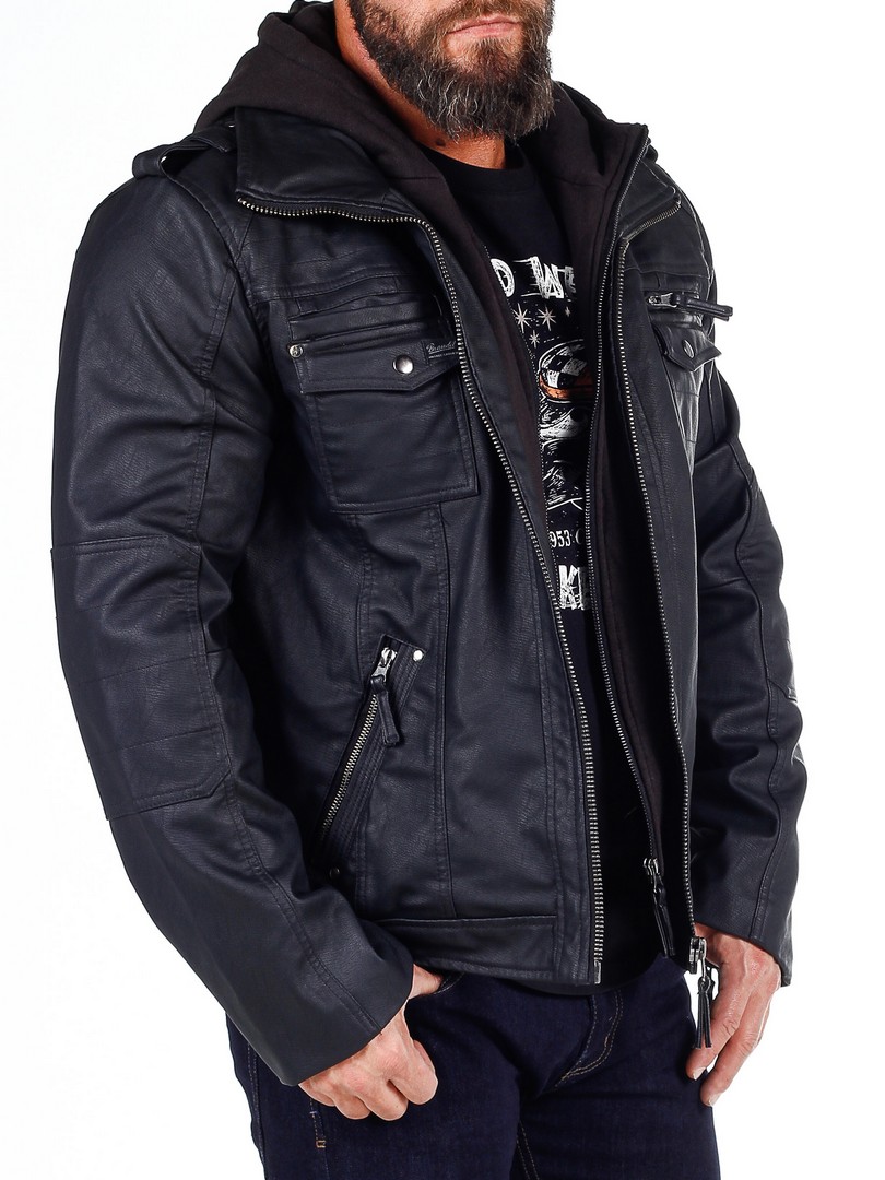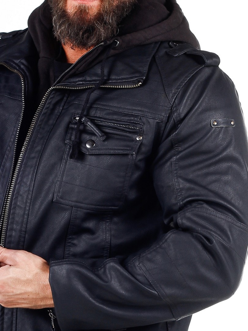 Takki on mustaa keinonahkaa ja siinä on huppu, jonka voi helposti irrottaa vetoketjulla. Kolme rintataskua, kaksi suljetaan nappipainikkeilla ja yksi vetoketjulla. Kaksi tilavaa vatsataskua. Takissa on korkea koulus ja se suljetaan hopeisella vetoketjulla. Tyylikkäinä yksityiskohtina saumoja, päälleommeltuja kangasosioita hihoissa ja lenkit olkapäillä.