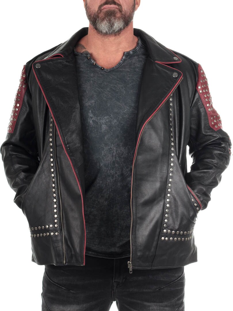 Pehmeästä, aidosta nahasta valmistettu topattu takki, jossa on kontrastiset punaiset paneelit sekä koristeelliset niitit, jotka luovat rouhean ja erottuvan ilmeen. Selkäpuolella on suuri viikinkihenkinen painatus, joka korostaa takin ainutlaatuista tyyliä. Takissa on useita käytännöllisiä taskuja, säädettävät hihansuut ja helma. Takki sinulle, joka haluat rock-henkistä tyyliä – premium-tuntumalla!