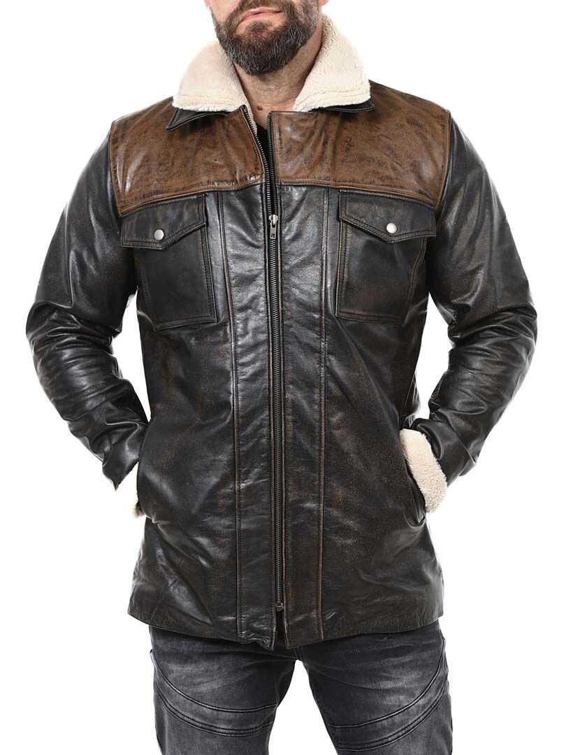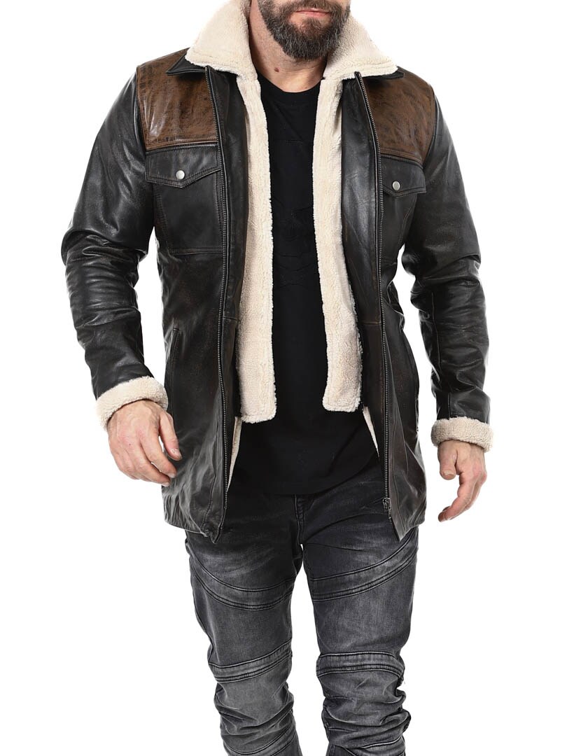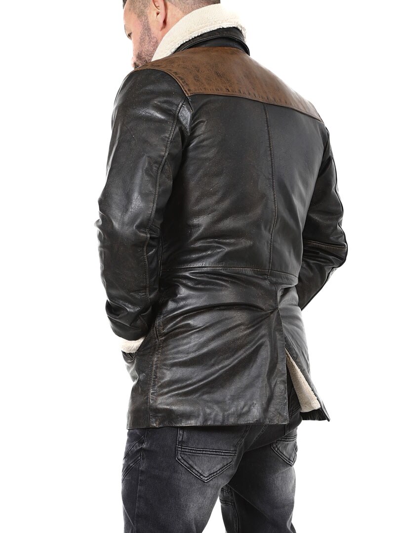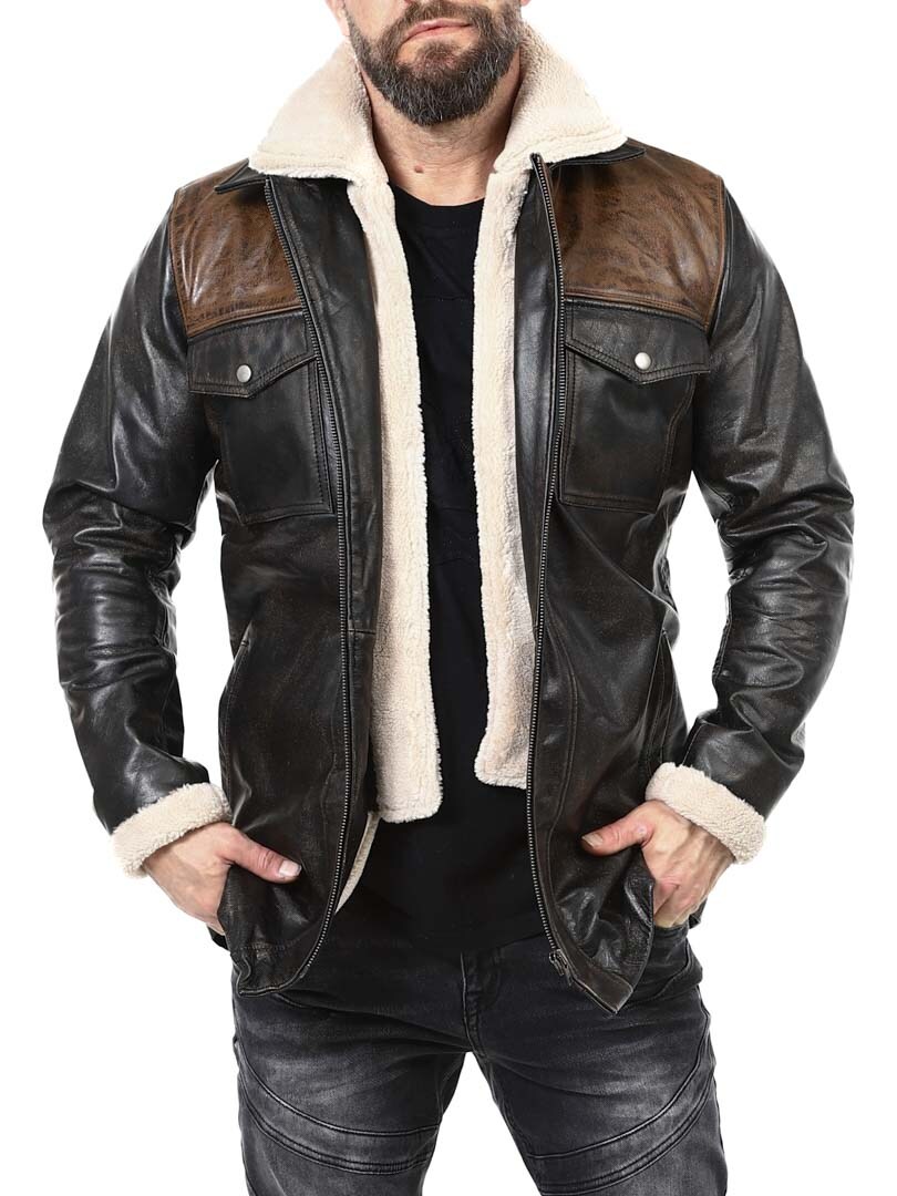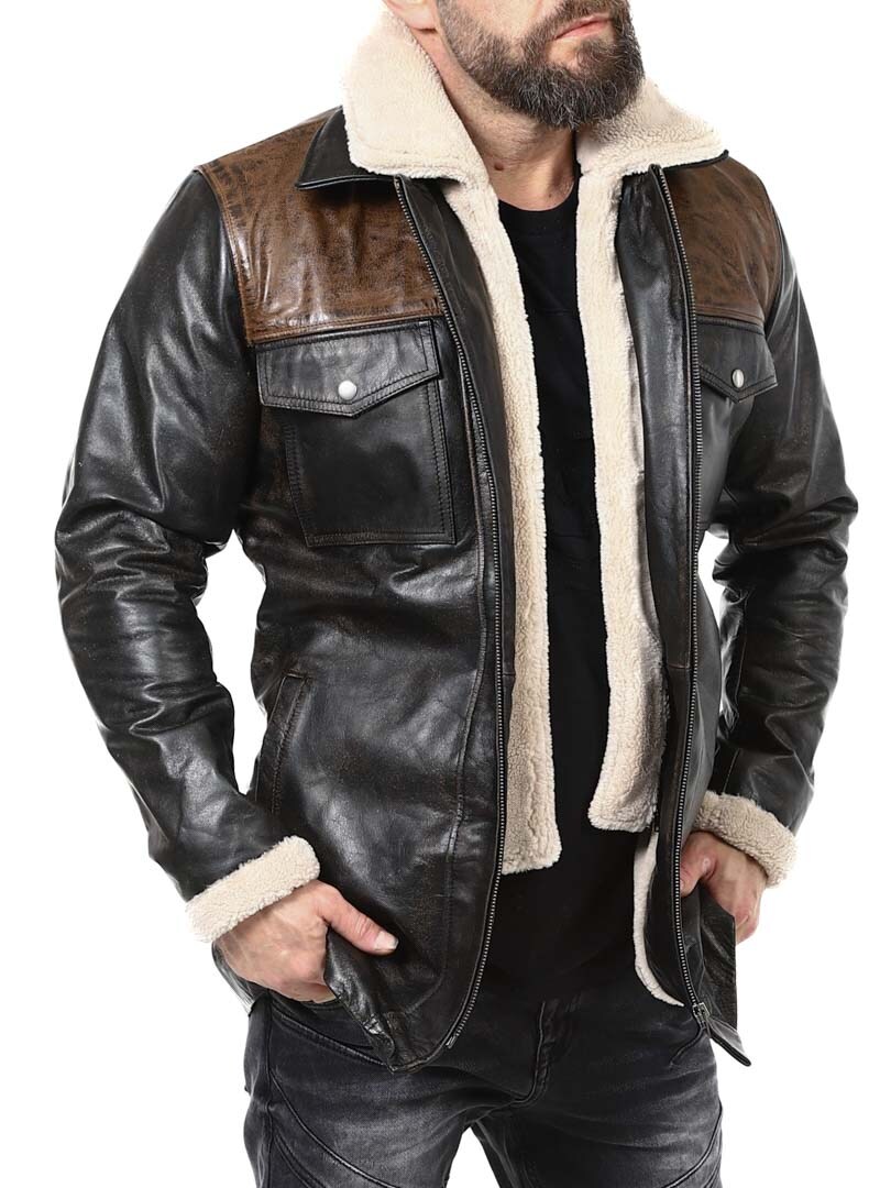 Vankka ja näyttävä takki, joka on valmistettu aidosta puhvelinnahasta – muotoilu huokuu itsevarmuutta ja asennetta. Mustan nahan ja kontrastiväristen ruskeiden olkapääosien yhdistelmä luo erottuvan ilmeen. Sisäpuolella lämmin teddyvuori tuo mukavuutta ja lämpöä kylminä päivinä. Takissa on useita taskuja ja irrotettava teddykaulus, jotta voit helposti vaihdella tyyliäsi sään ja tilanteen mukaan. Tämä takki on miehelle, joka arvostaa tyyliä, voimaa ja kestävää laatua – yksinoikeudella RockDenimiltä!