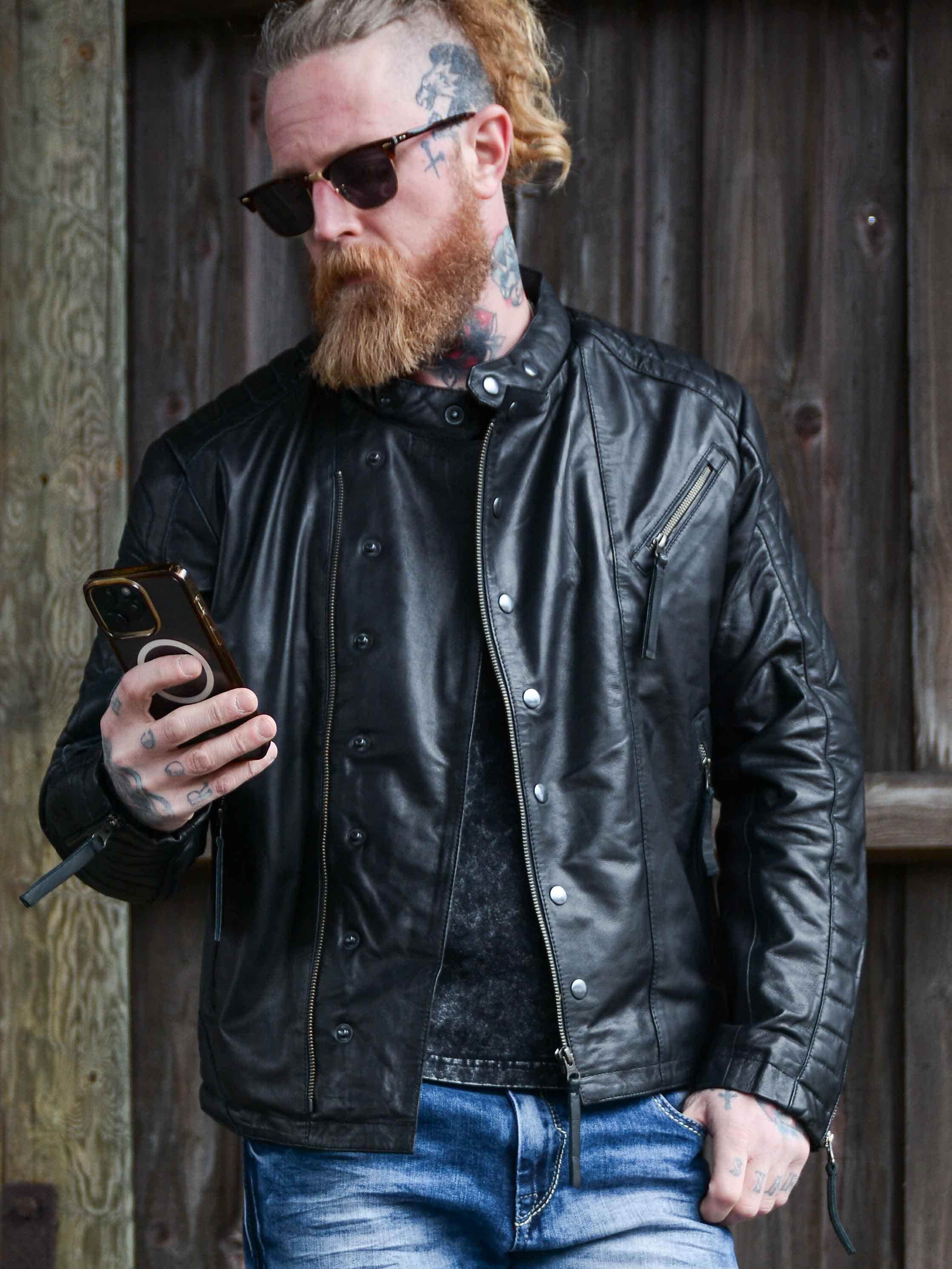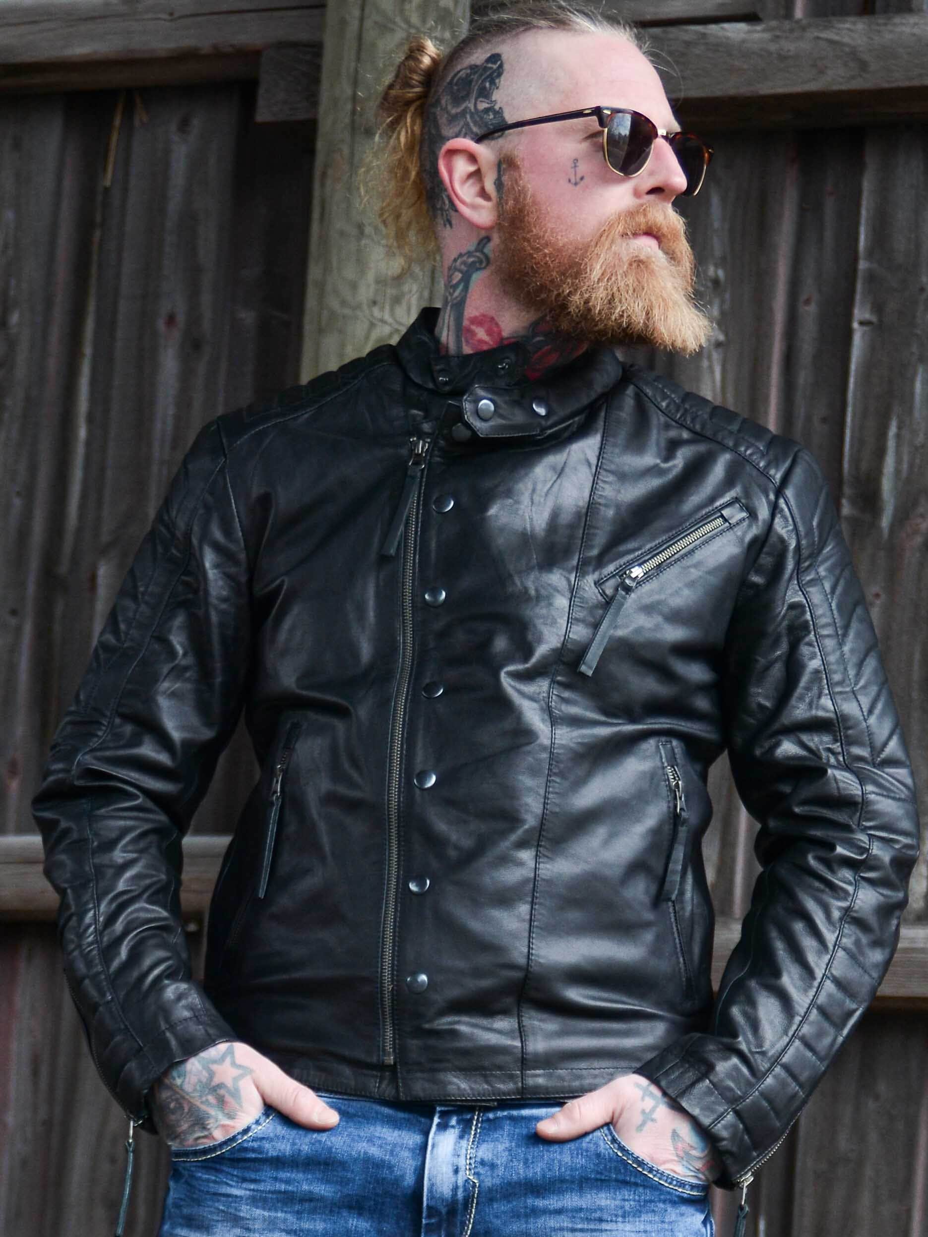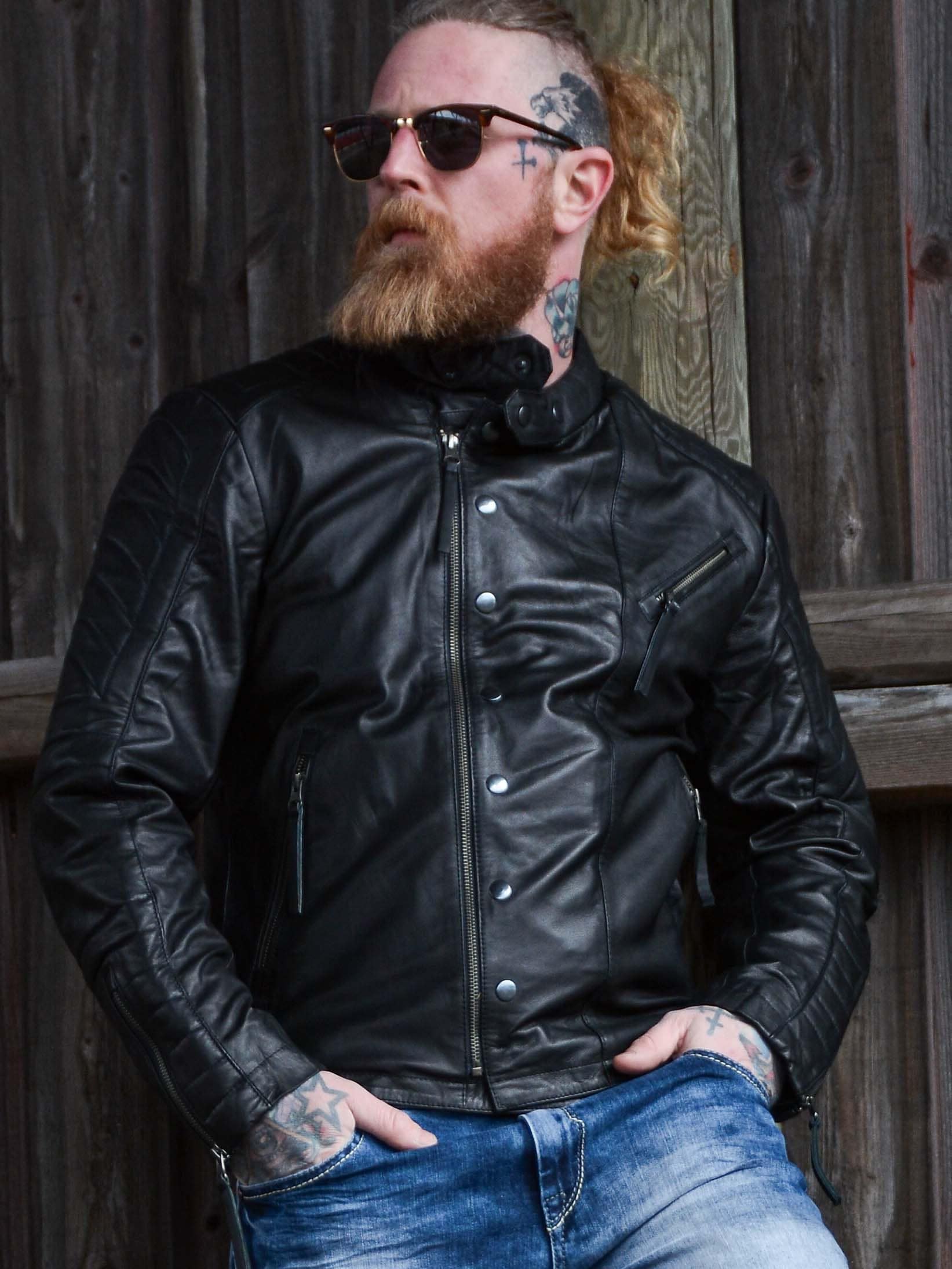 Näyttävä nahkatakki pehmeästä ja joustavasta lampaannahasta, jossa korostetut yksityiskohdat luovat voimakkaan ilmeen. Mallissa on edessä vetoketju- ja nappikiinnitys sekä topatut osiot olkapäissä, hihoissa ja selässä, jotka vahvistavat biker-henkistä ilmettä. Kolme käytännöllistä ulkotaskua ja kaksi sisätaskua tekevät takista sekä tyylikkään että toimivan. Eksklusiivinen nahkatakki asenteella – täydellinen sinulle, joka haluat yhdistää mukavuuden ja luonteen!