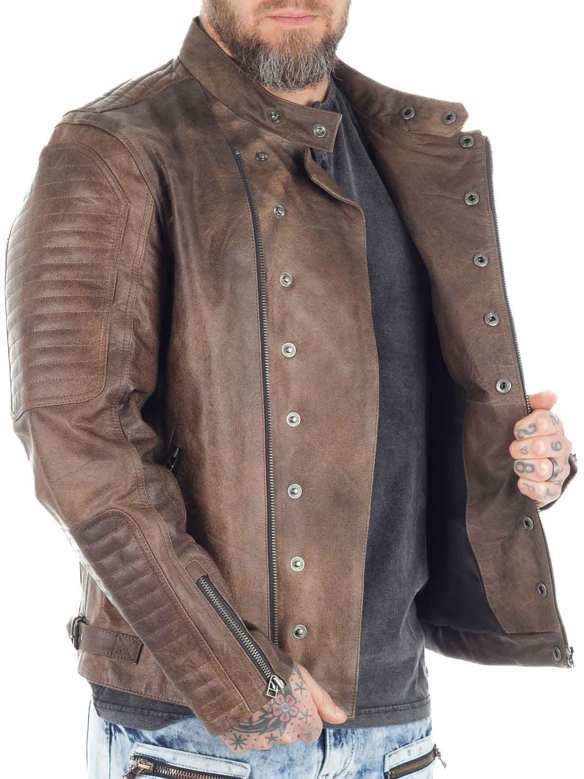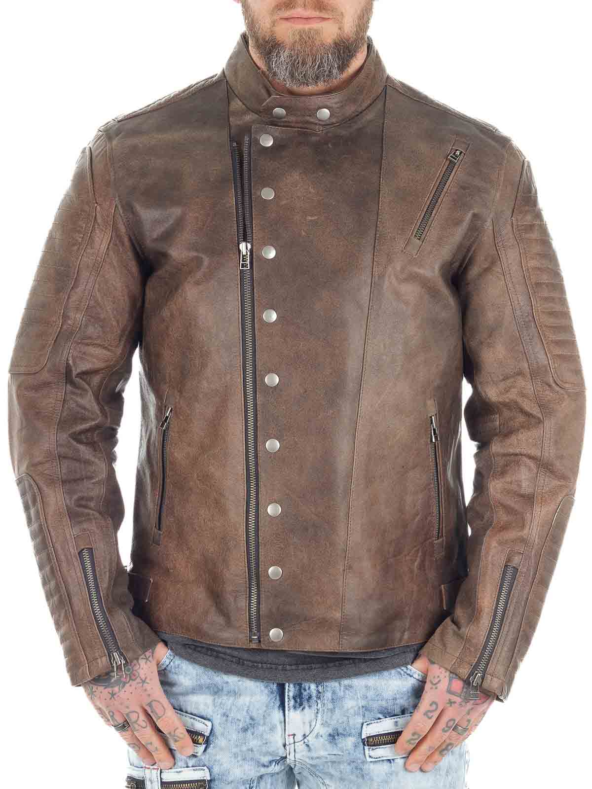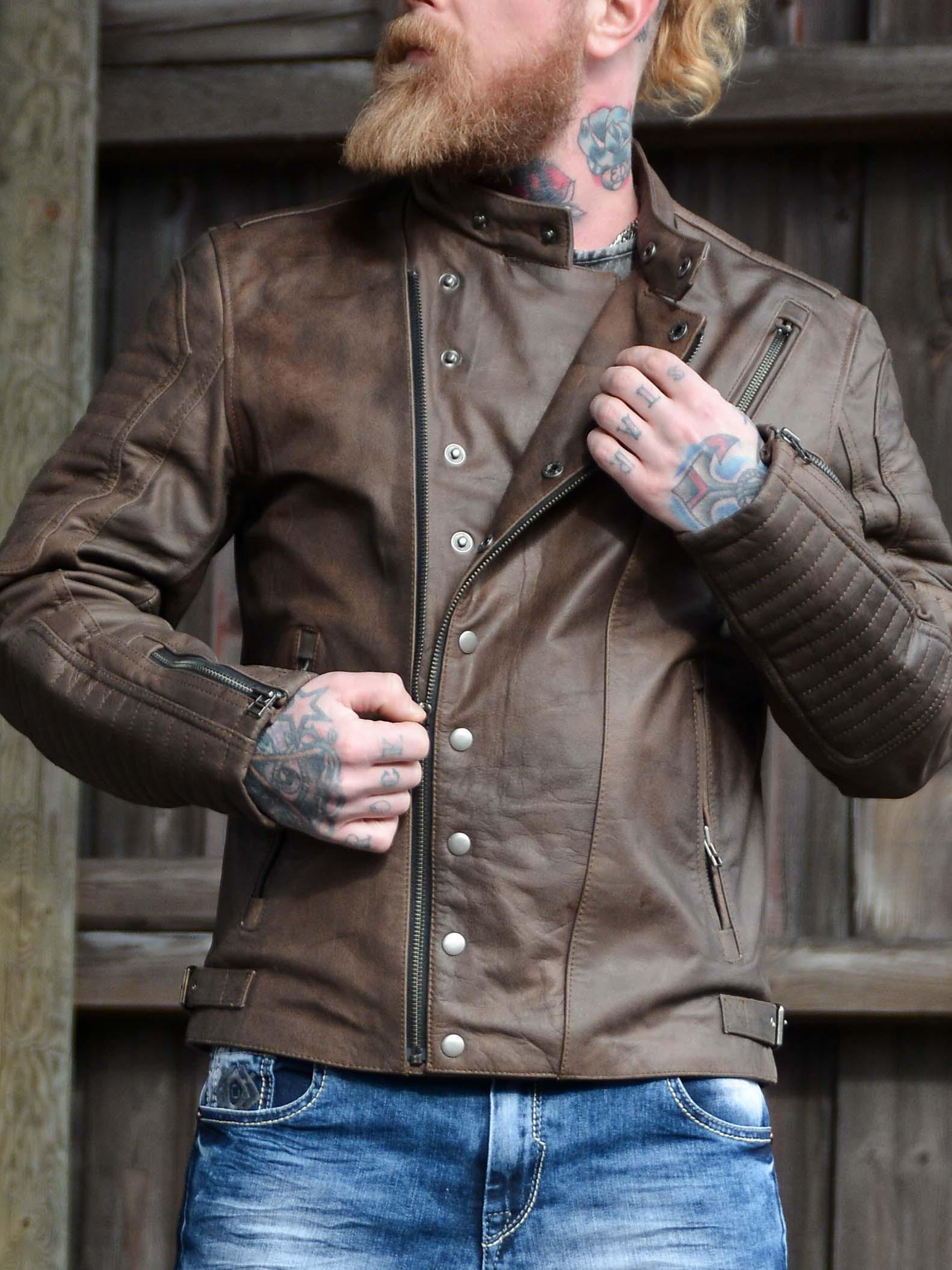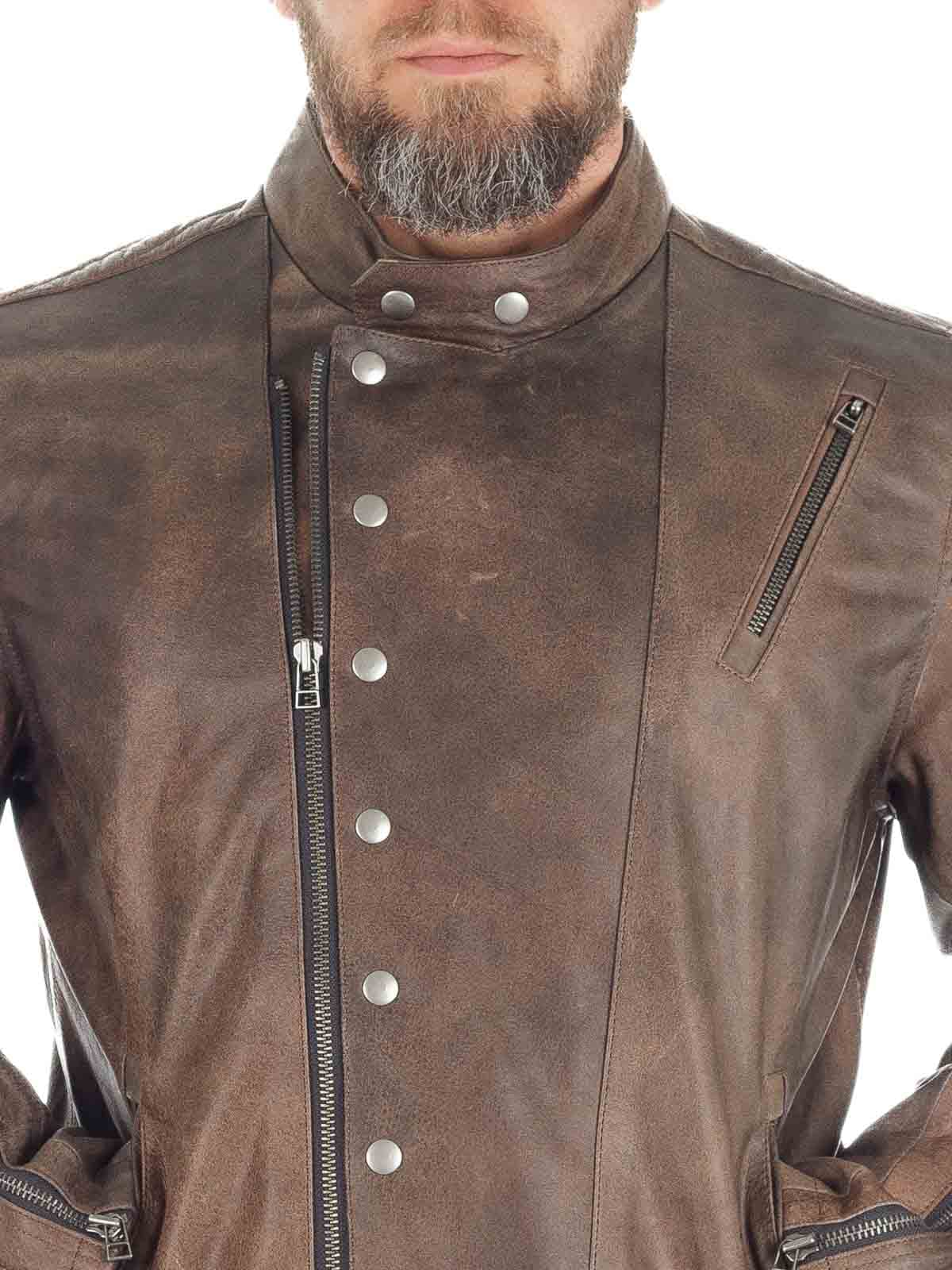 Tämä näyttävä takki on valmistettu aidosta puhvelinnahasta ja siinä on vintage-henkinen ilme. Vetoketju ja koristeellinen nappikiinnitys korostavat takin rouheaa luonnetta. Kolme ulkotaskua ja kaksi sisätaskua tarjoavat käytännöllistä säilytystilaa tärkeimmille tavaroillesi. Voimakas nahkatakki sinulle, joka haluat pukeutua maskuliinisella tyylillä!