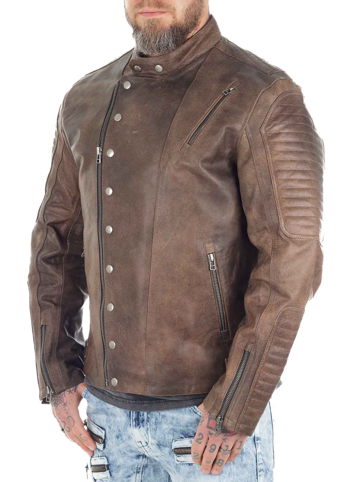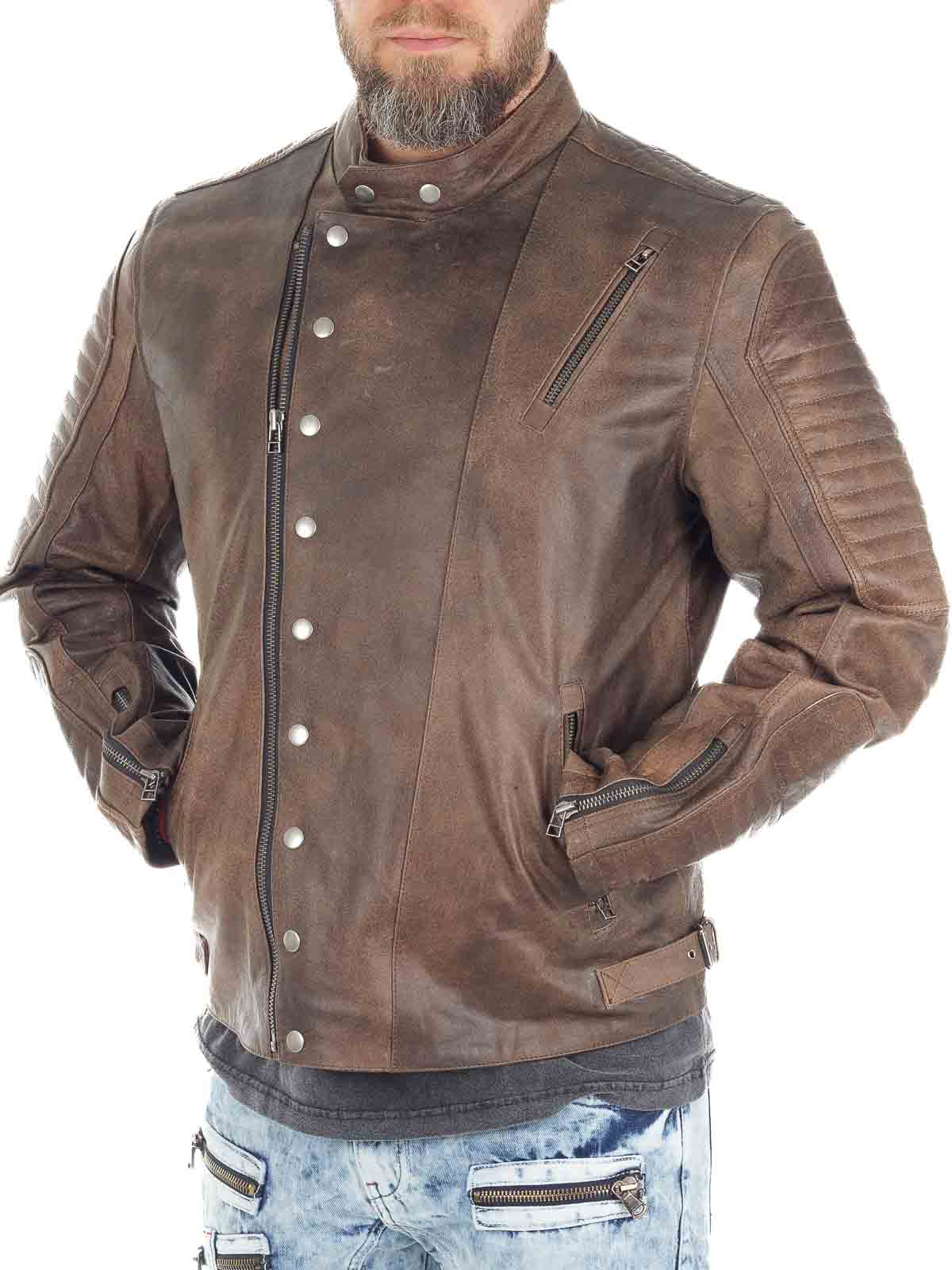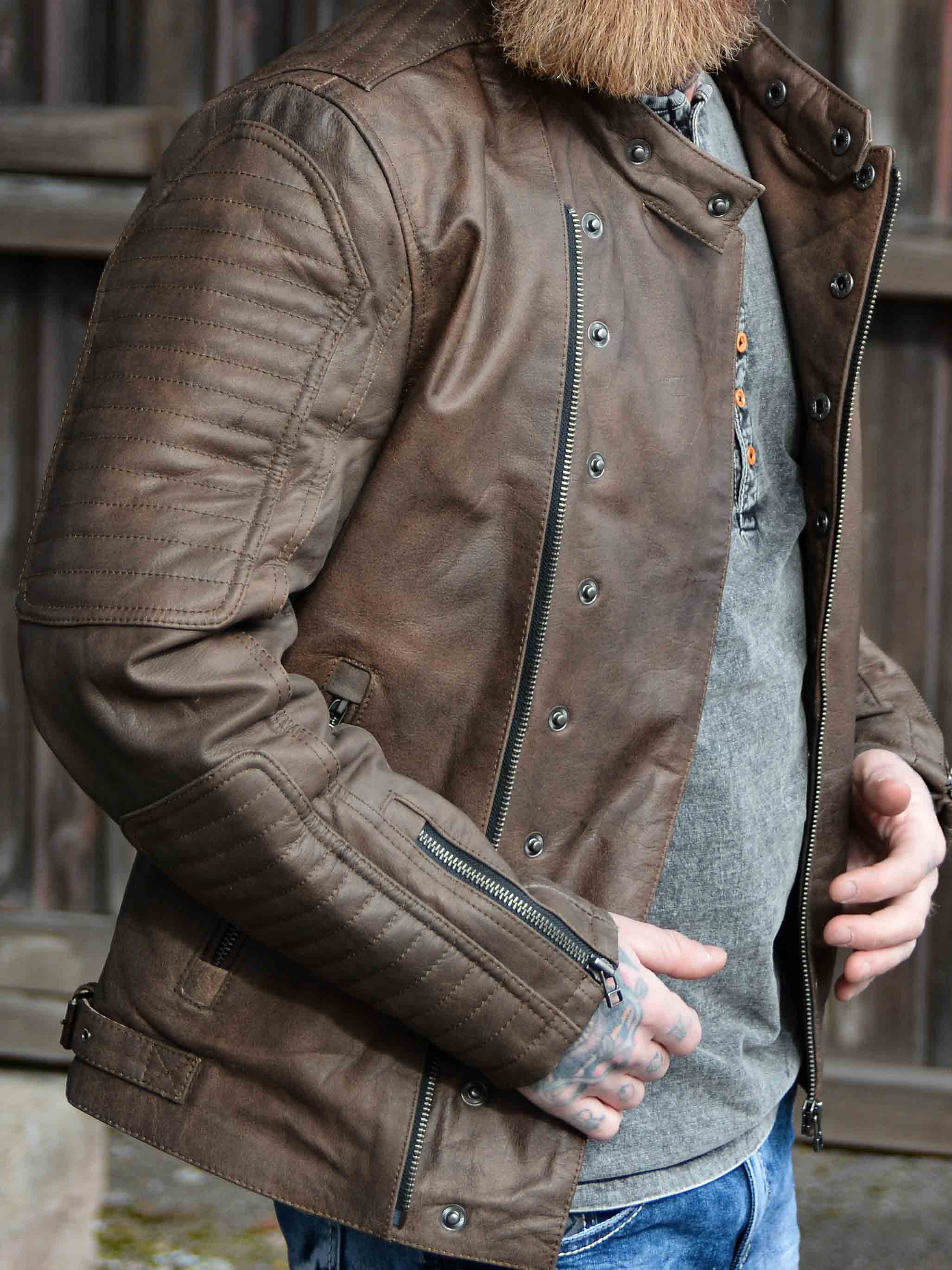 Tämä näyttävä takki on valmistettu aidosta puhvelinnahasta ja siinä on vintage-henkinen ilme. Vetoketju ja koristeellinen nappikiinnitys korostavat takin rouheaa luonnetta. Kolme ulkotaskua ja kaksi sisätaskua tarjoavat käytännöllistä säilytystilaa tärkeimmille tavaroillesi. Voimakas nahkatakki sinulle, joka haluat pukeutua maskuliinisella tyylillä!