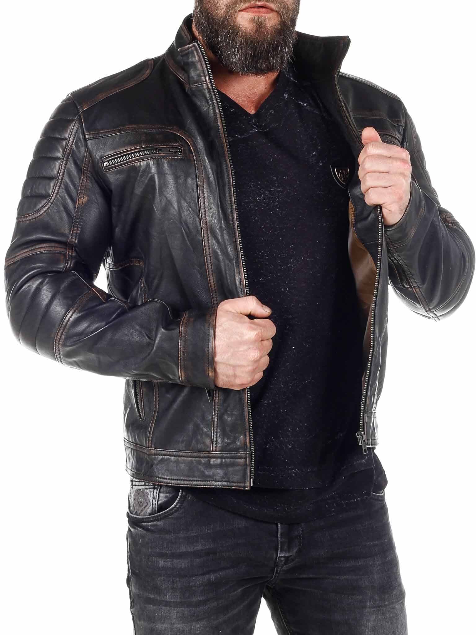 Tyylikäs nahkatakki vaaleammilla osioilla, jotka antavat sille näyttävän vintagelookin. Hihansuut säädettävissä vetoketjuilla, topattuja osioita. Neljä suljettavaa etutaskua ja kaksi sisätaskua. Takki sulkeutuu vetoketjulla.