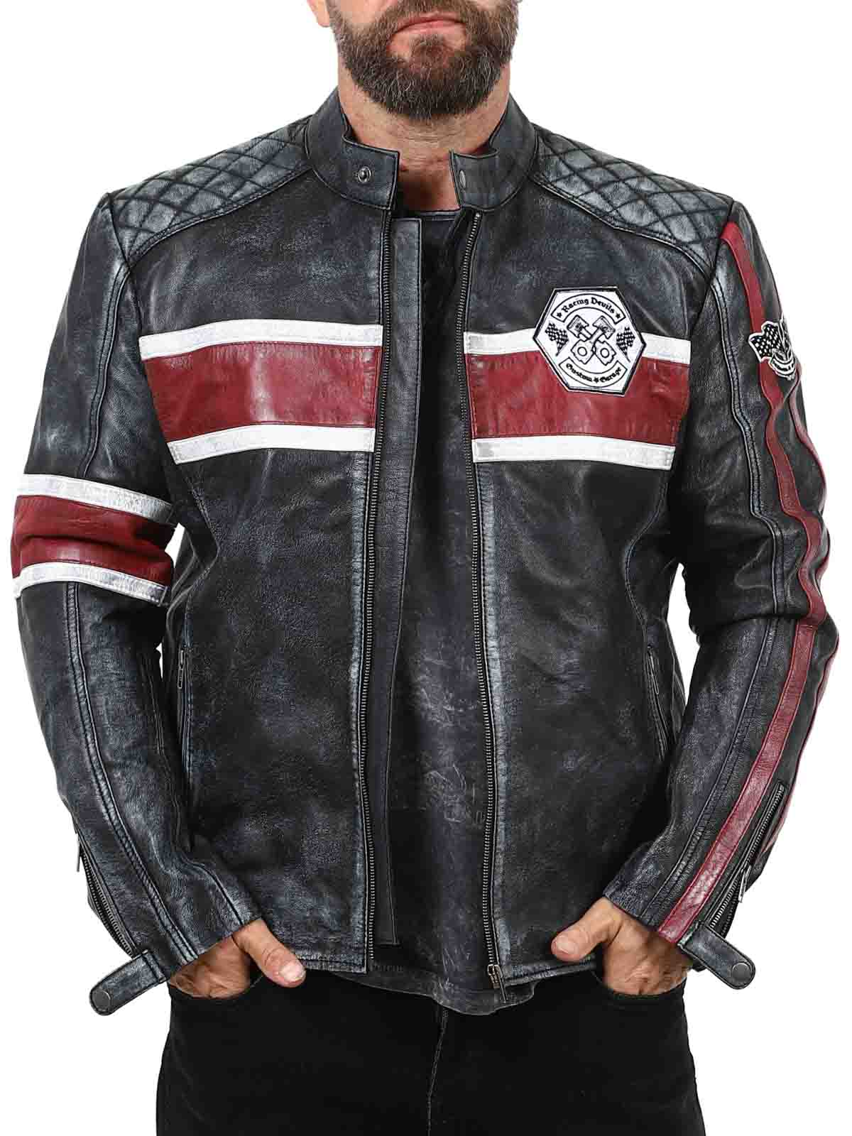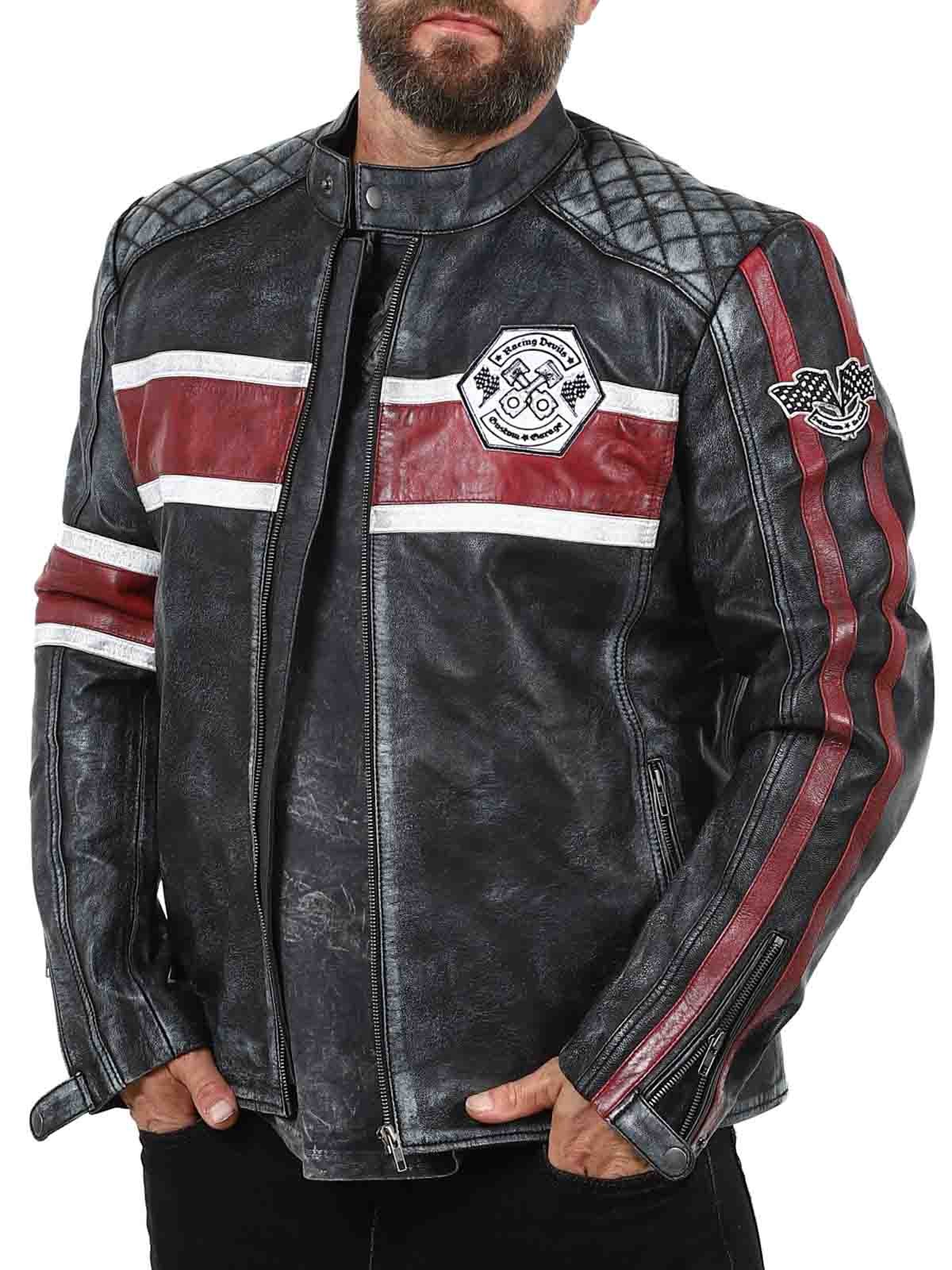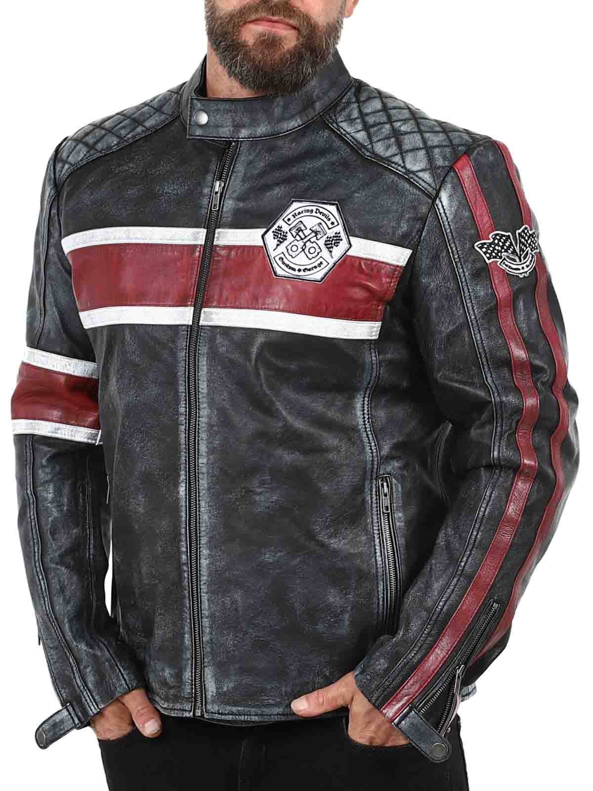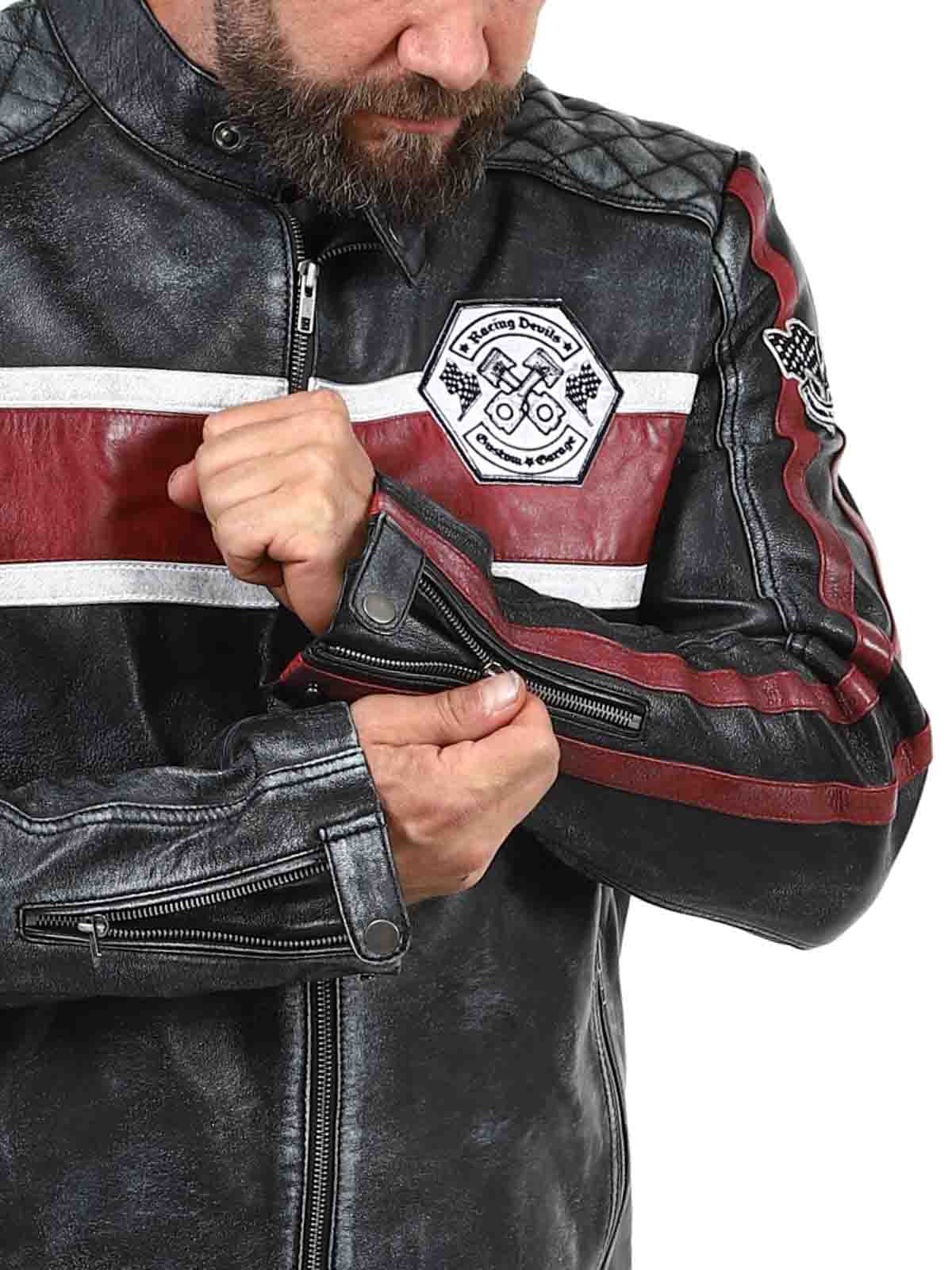 Tässä aidosta lampaannahasta valmistetussa takissa on karkea ja vintage-henkinen ilme, joka vangitsee huomion. Tunnusomaiset punavalkoiset raidat saavat sen näyttämään sporttiselta, ja kulunut viimeistely korostaa takin luonnetta. Yksityiskohtiin lukeutuu kangasmerkkejä, rouheita vetoketjuja ja vahvistettuja osioita, jotka tekevät tästä takista täydellise niille, jotka haluavat yhdistää klassisen biker-tyylin siistiin twistiin!