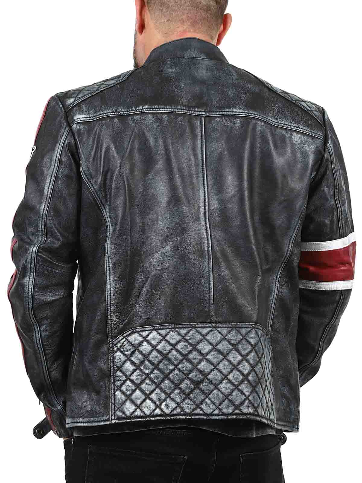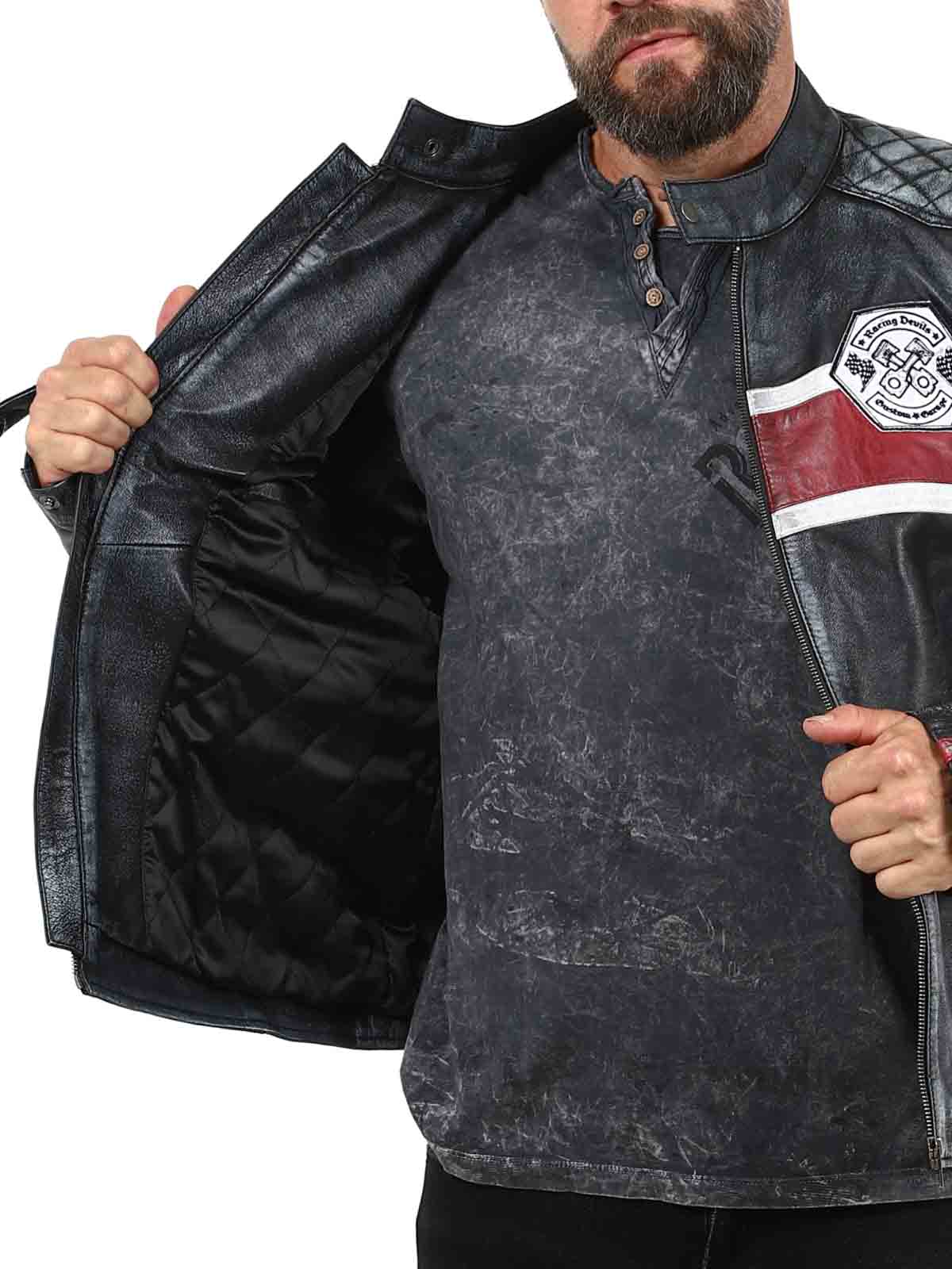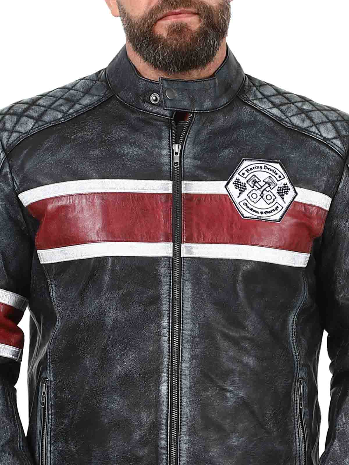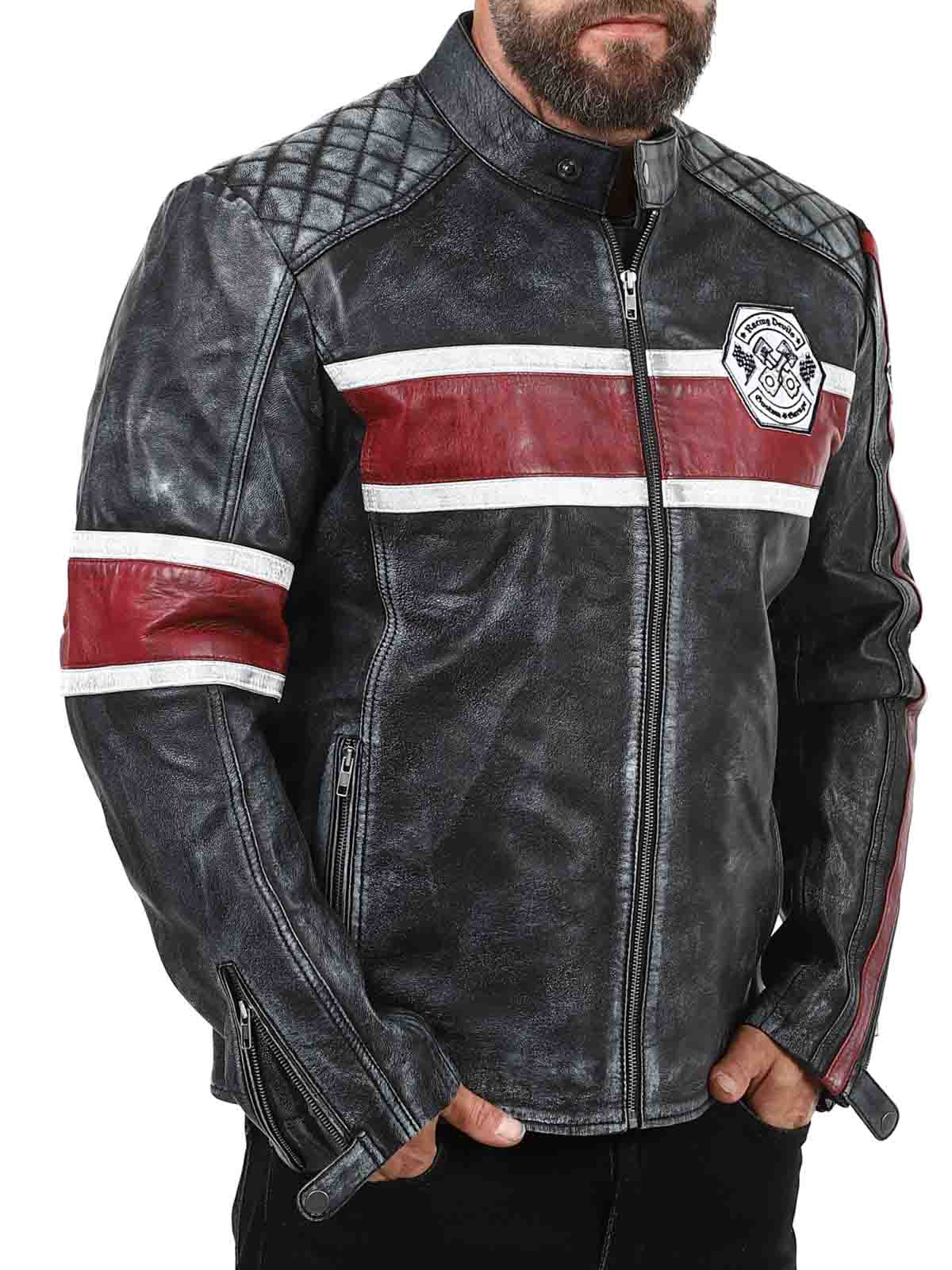 Tässä aidosta lampaannahasta valmistetussa takissa on karkea ja vintage-henkinen ilme, joka vangitsee huomion. Tunnusomaiset punavalkoiset raidat saavat sen näyttämään sporttiselta, ja kulunut viimeistely korostaa takin luonnetta. Yksityiskohtiin lukeutuu kangasmerkkejä, rouheita vetoketjuja ja vahvistettuja osioita, jotka tekevät tästä takista täydellise niille, jotka haluavat yhdistää klassisen biker-tyylin siistiin twistiin!